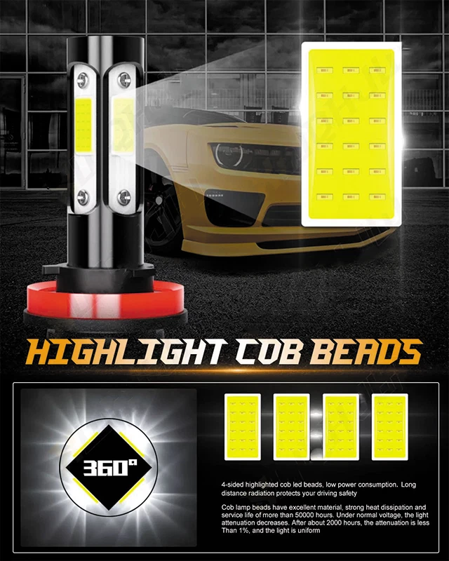 Note: ● Compatible List can not show up all Car model. Please confirm whether the item matches your car before purchase. ● You also can send us your car informations (Maker, Model, Year), so we can find the right bulb size for you. This listing compatible with 3 pairs (9005 + H11 + 9145) 6000K white super bright LED headlight high beam + low beam + fog light bulbs conversion kit. Headlight Bulbs Specifications: ● Bulb Socket: 9005/HB3 high beam + H11 low beam ● LED Quantity(each bulb): 4pcs* COB chips (4-sides), 360 degree clear beam no blind zone ● Technology: Bulit-in driver & cooling fan ● Connector(s): plug and play ● Operating Voltage: DC 9V ~ 32V , Fit for 12V / 24V vehicle. ● Wattage: 50W per bulb ● Luminous Flux: 20000 LM per set ● Color temperature: 6000K ● Light color: White ● Material: Aviation 6063 aluminum profile ● Beam Angle: 360 degree ● Operating Temperature: -40 - +85 degree Celsius ● Waterproof Rate: IP68 rated Waterproof and dust seal, works well even in extreme weather ● Lifespan: over 50000 hours life time, stable quality and long service life ● Application: headlight high beam + low beam ● Built-in constant current CPU,instant full brightness without start-up relay ● Easy plug and play design, no resistor or modification needed. ● The bulb body size of our bulb is smaller than other 4-sided LED bulbs on the market, no need to worry about interference with the dust cover. Two-way Heat Dissipation Channel: 1. All-in-one aluminum profile as heat conduction system, 360 degree heat radiating. 2. Built-In Turbo Cool Fan, High speed 12000 r/min, high air flow for faster cooling rate. Fog Light Bulbs Specifications: ● Bulb Size: 9145 9140 H10 ● Color: 6000K Xenon White ● LED Quantiy: 10pcs Per Bulb ● LED Type: SMDHigh Power Chip ● Beam Type: 360° Beam Angle ● Operating Voltage: DC 9V ~ 32V , Fit for 12V & 24V vehicle. ● High Power: 50W/bulb ● Luminous Flux: 3200LM per set ● Material: Aaluminum profile and virtually unbreakable PMMA Lens ● Long-lasting Lifespan 50000 Hours ● Plug and Play Easy Installation ● Fast on/off Response Time and Vibration Resistant Package Include: ● 2x 9005 LED high beam bulbs ● 2x H11 LED low beam bulbs ● 2x 9145 LED fog light bulbs On Nov 11, 2024 at 20:10:54 PST, seller added the following information: