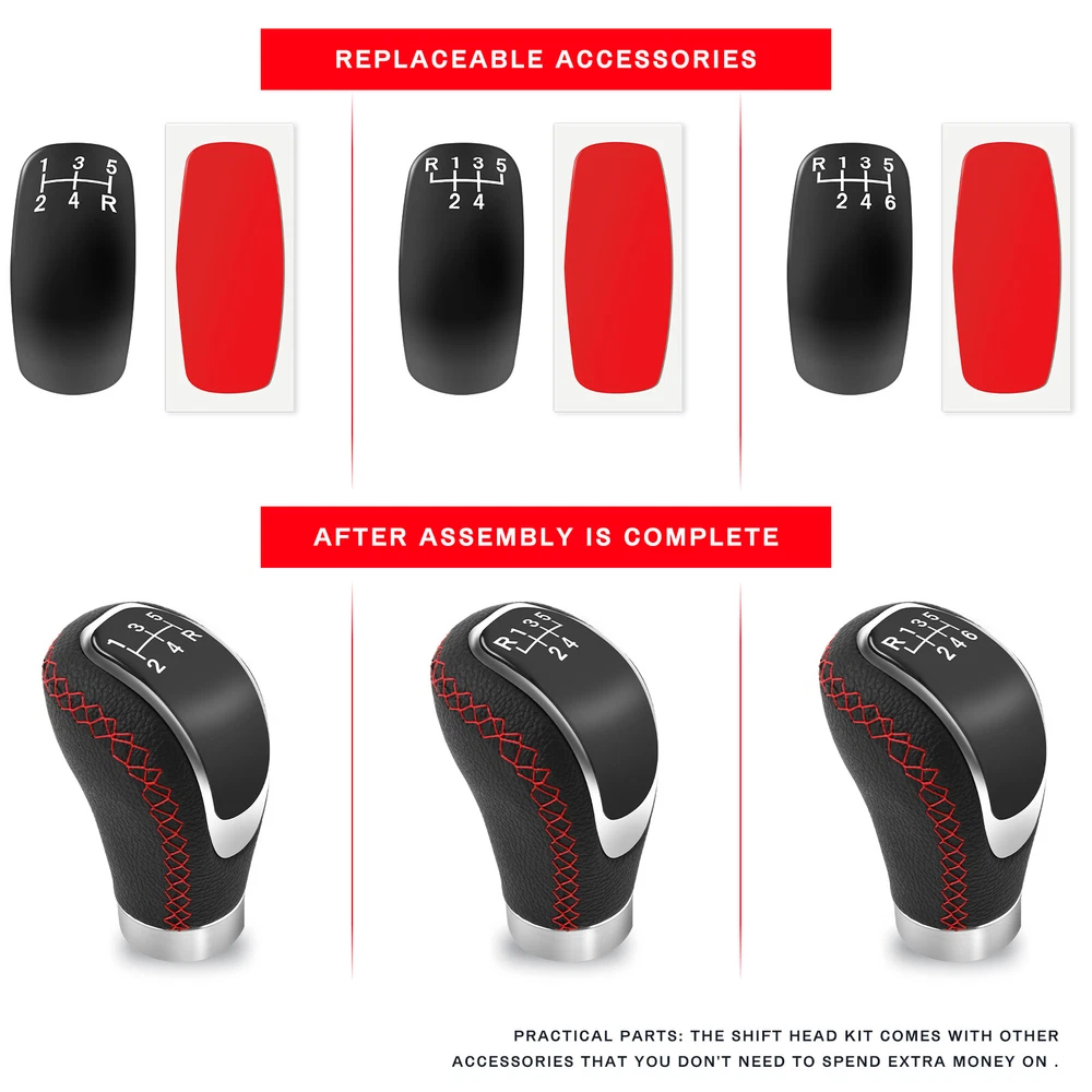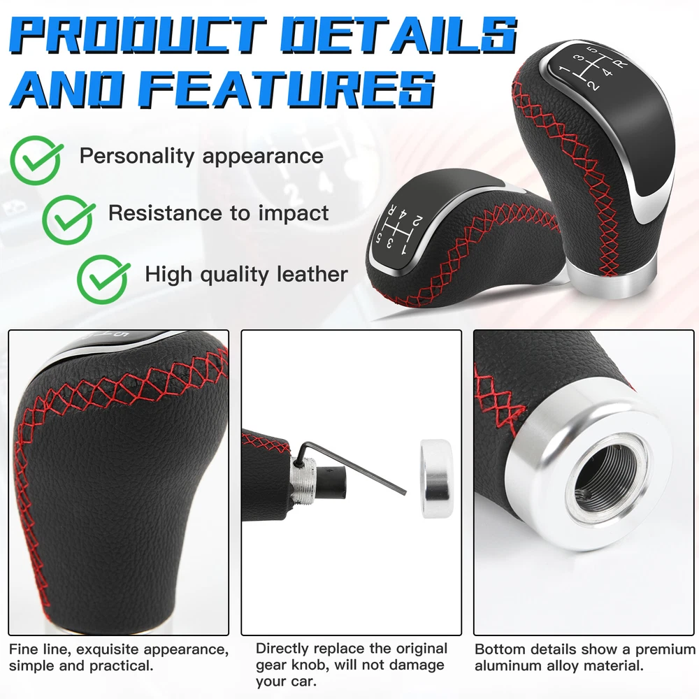 For Suzuki SX4 Grand Vitara MT Leather Manual Gear Stick Shift Knob Lever Head Features: 5-speed Design: This shifting lever knob is 3.50 inches long, has a 5-gear diagram, making it easier for novices to see the gears and get into them quickly. Widely Applicable: This ball shifting lever knob is widely compatibility for most manual vehicles and most automatic vehicles without button lock or pull up reversed. However, take care to ensure that the gearshift knob fits your model before you buy it. Aluminum & PU Material: The ball shifting lever knob is made of PU leather and aluminum alloy with silky touch, exquisite workmanship. Weight: This ball shifting lever knob weighs 5 ounces, light and handy, making you feel comfortable during driving. Ease to Install: This ball shifting lever knob is very convenient and fast to install and remove, just remove the old knob and screw on the new knob. There are 4 different sizes of adapters (M8/M10/M11/M12) to choose from. Specification: Material: PU Leather, Metal/Aluminum Alloy Color: Black, Red Stitches (See the picture) Length: 3.5 inches (90 mm) Weight: approx. 5 ounces Material: Plastic + Aluminum + PU Leather Fitment: Different attachments (M8/M10/M11/M12) to fit your most regular gear stick with 8mm 10mm 11mm and 12mm. Please note: Will not fit f or the gear head without a button if 1. Manual gear: Doesn't fit Reverse gear which needs to be lifted up. 2. Automatic transmission: Can not be used with buttons. 3. Doesn't fit if can't remove the gear head. Package included: 1 x Gear knob 4 x Adapters (M8/M10/M11/M12) 4 x Screw 3 x Gear knob cap (5+R speed/R+5 speed/R+6 speed) 1 x Wrench 1 x Double adhesive Easy to Install The shift knob is very convenient and fast to install and remove. Just remove the old knob and tighten on our knob. Installation Steps: First remove the old knob. Then install attachment of appropriate size. Finally, install the gear head and tighten the screws. This completes the installation. Shipping We'll ship item via Standard trackable shipping method. The delivery will take 2-3 business days to whole UK usually(Except holidays and special circumstances) Terms of Sale We'll Accept quality returning while 60 days after item delivered. About Us We are CN seller with UK local warehouse. We provide reliable product, professional service and fast shipping. Mainly provide auto body kit like front bumper lips, side skirts, side splitter, rear splitter diffusers, car cover, roof racks, roof rack box bag ect,. Motorcycle parts like side mirrors, handle bar grips, solo seat, two-up seat, cover, headlights ect,.