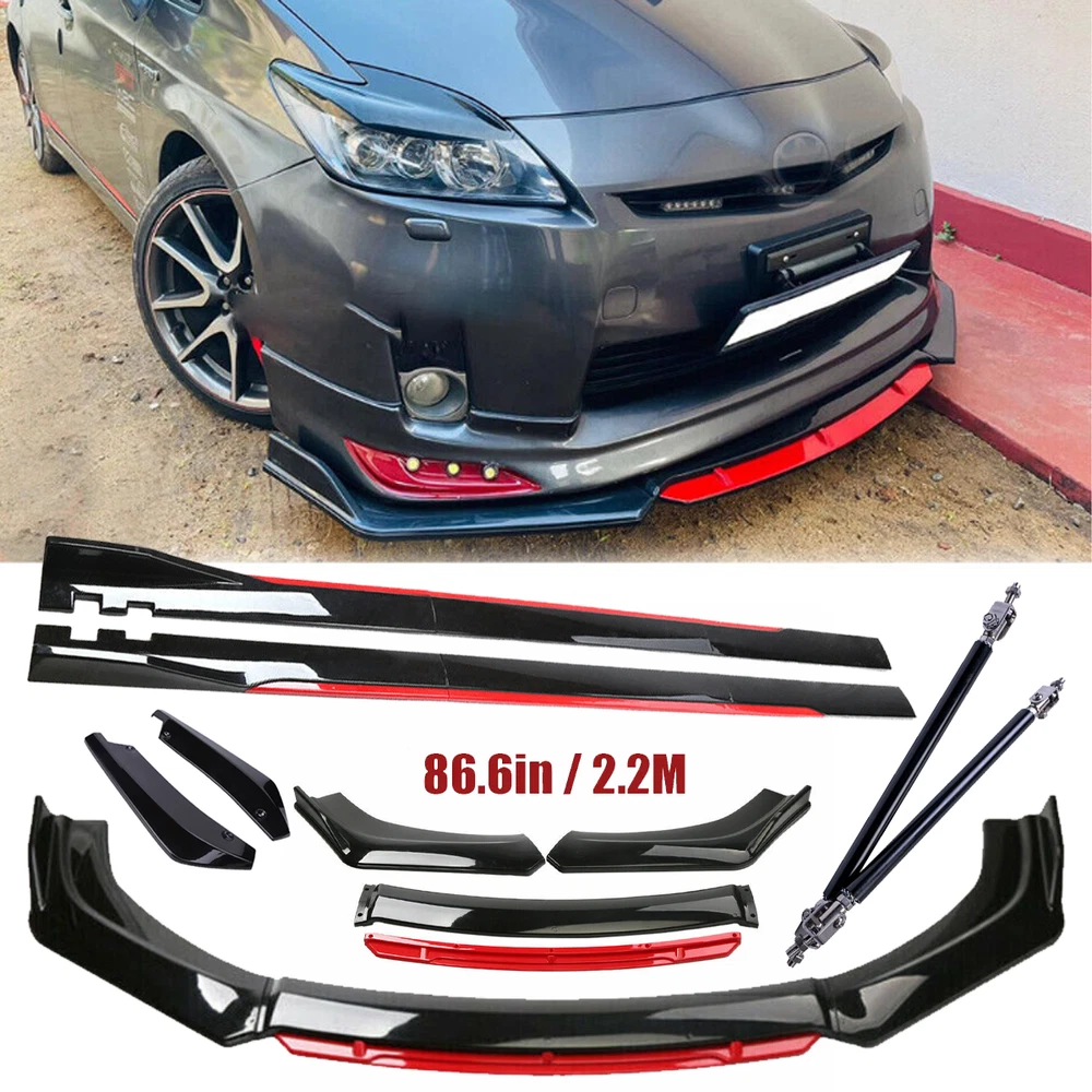 ackage 1. Front Bumper Lip Spoiler Splitter(5pcs) This front bumper lip splitter is fit for most models with front bumper size around 1750mm~1950mm. Feature: -Direct Fit. -Easy install and durable use. -Great quality and great Fitment. -Correct Connector No cutting or splicing. -Strict quality control standards to Build and test. -It'll give you a sporty look without making it too aggressive. -Light in weight and enduring, different optical line comes from different points of view. *Instruction Not Included, Professional Installation Is Highly Recommended.* Specification: -Type:Front Lip Chin Bumper Body Kit -Material:ABS -Color: Glossy Black +Red (as pictures show) -Placement on Vehicle:Front;;Lower -Fitment Type:Performance/Custom This front bumper lip body kit is suitable for most small cars and simple. And the flanks on both sides can be adjusted to make it more suitable for the width of the front of your car. Package 2. 2 x 86.6" Side Skirt Extension ( 6pcs ) Specification: Condition: 100% Brand New and High Quality Type: Car Body Side Skirts Material: Made of high quality PP plastic, Durable Color: Glossy Black +Red (as pictures show) Side Skirt Length: 86.6in / 2.2M Position: Side Skirt Extension Features: Universal modified side skirt for car sedan. While the side skirts don't affect the front ground clearance too much, it enhances the side extension of the in a very pure and exciting way. A Perfect Aftermarket Replacement. Professional Installation Is Highly Recommended. Package Included 3 Rear Lip Specification: Condition: 100% Brand New and High Quality Type: Car Body Rear Lip Material: Made of high quality PP plastic, Durable Color: Glossy Black (as pictures show) Surface Finish: Glossy Black Style Rear Lip Size:48cm/19“ Placement on Vehicle: Left, Right Package Included 4 2pcs Splitter Rods Material: premium quality aluminum alloy The length can be adjustable from 8" to 11" Fitment: Universal Note: Require drilling holes into the bumper lip diffuser to attach safely to the vehicle. Package Includes: 4 pcs /set Front Lip Chin Bumper Body Kits 2 x Side Skirts 2 x Rear Lip 2 X Splitter Strut Rods 1 x Screws kit Note: Installation instruction is not included, professional installation is recommended. Please allow 1-3CM differs due to manual measurement.