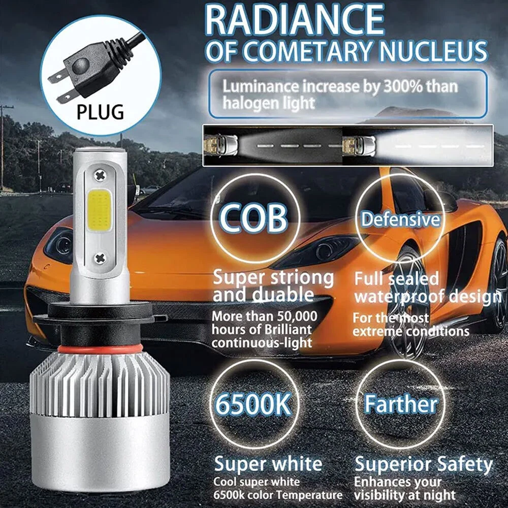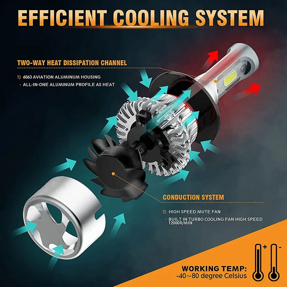 LED Headlight Bulb Specifications Model: 9003/HB2/H4 light Source Model: LED Chip,4-Side Leds Operating voltage:DC9V-32V Beam Type:High Beam & Low Beam Material: Aluminum PCB and PA66+30% GF Plastic Cooling Fan, Efficient Heat Dissipation Beam Angle:360° Color Temperature: 6000K-6500K Cool White Working Temperature: -40-+150 Centigrade Waterproof rate: IP67 Connector Type:Plug and Play Application: LED Headlights Headlamp Lamp Bulbs High or Low Beam Package Included: 2Pcs 9003/H4 LED Headlight Bulbs