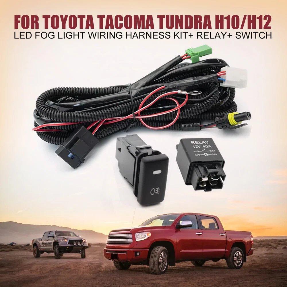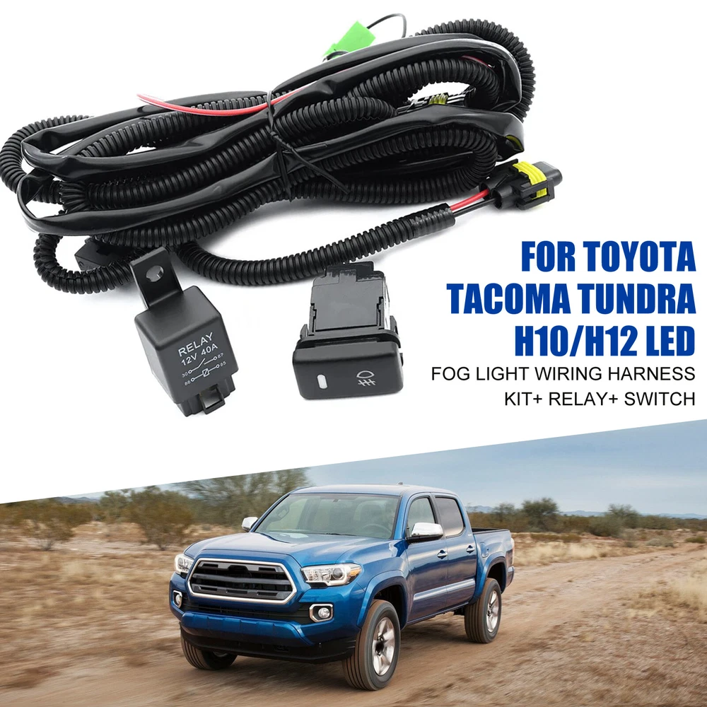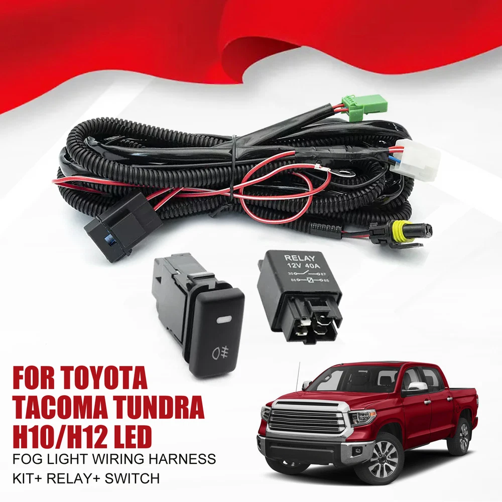 For Toyota Tacoma Tundra H10/H12 LED Fog Light Wiring Harness Kit+ Relay+ Switch Features: Wire Gauge: 16AWG Wire Material: Bare Copper Wire+PVC Cable+Corrugated Tube High quality materials used, durable to use with long service time 40A 12V SPST make and break relay & 15A ATO regular blade fuse for multiple safeguards Applied to H10/H12/HB3/HB4/HIR2 socket add-on fog lights/LED work light assembly with very easy installation Plug and play, no splicing wires needed The On/Off switch is press button type can be easily controlled on center console Realize the functions of turning fog lights on/off independently Switch a high current circuit using a low current circuit Can effectively isolate high current to protect circuit safety and electricity safety Wiring Tips: Black wire round terminal tab -- negative/ground Red wire round terminal tab -- ACC (you can cut the tab if in need) White plug -- Relay Green plug -- Push Button Switch Fitment: For American vehicle models: 2003-2009 Toyota 4Runner 1999-2007 Toyota Land Cruiser 100-series 2007-2014 Toyota FJ Cruiser 2001-2007 Toyota Highlander 2004-2005 Toyota Prius 2005-2007 Toyota Sequoia 2004-2008 Toyota Solara 2005-2022 Toyota Tacoma 2005-2006 Toyota Tundra 1998-2006 Lexus LX470 2003-2004 Lexus GX470 For European vehicle models: 1998-2007 Toyota Land Cruiser 100 2002-2009 Toyota Land Cruiser 120 Prado 2005-2011 Toyota Hilux 2004-2005 Toyota Prius Package Includes: 1x H10 H12 Wiring Harness Kit 1x 4-pin Relay 1x Push Button Switch