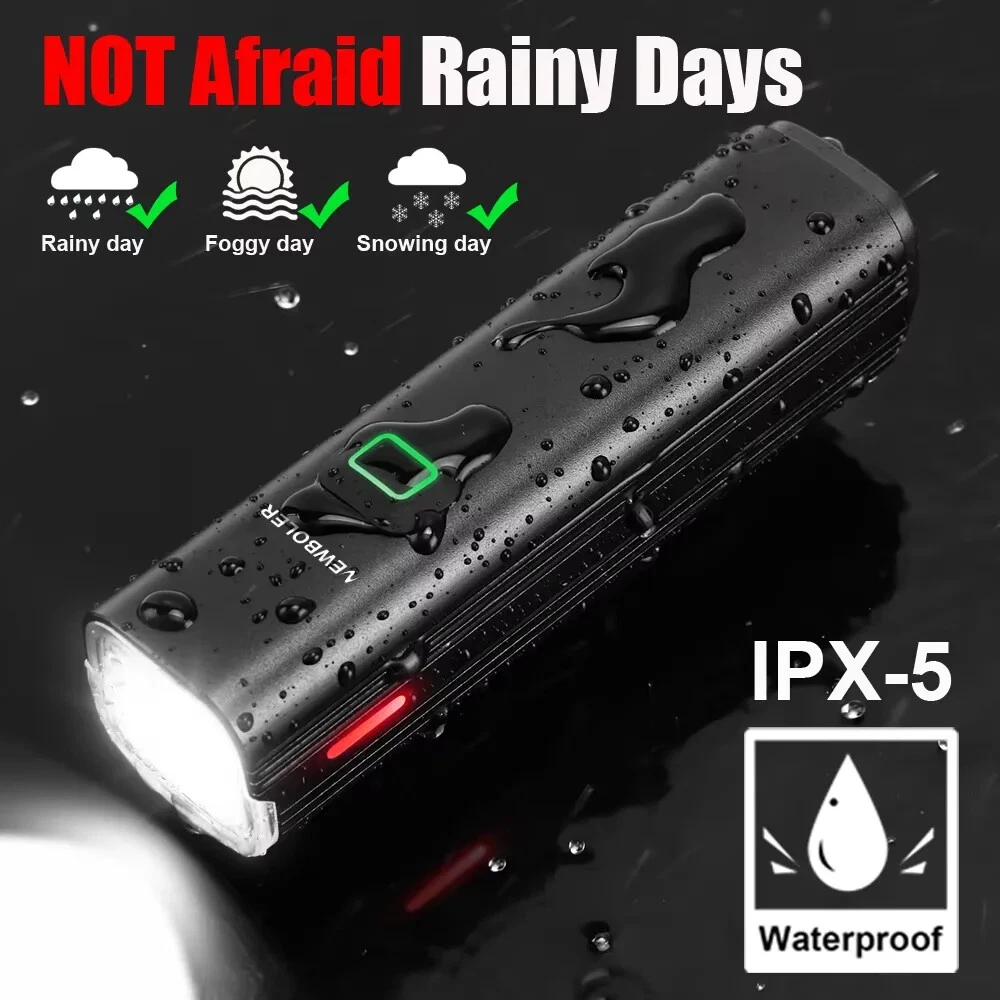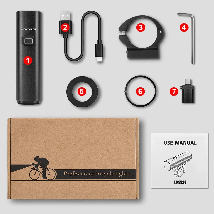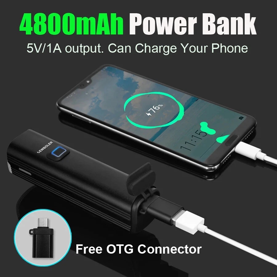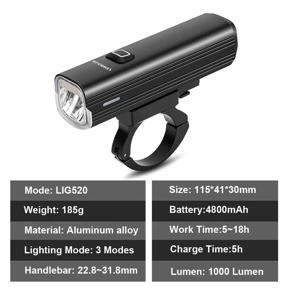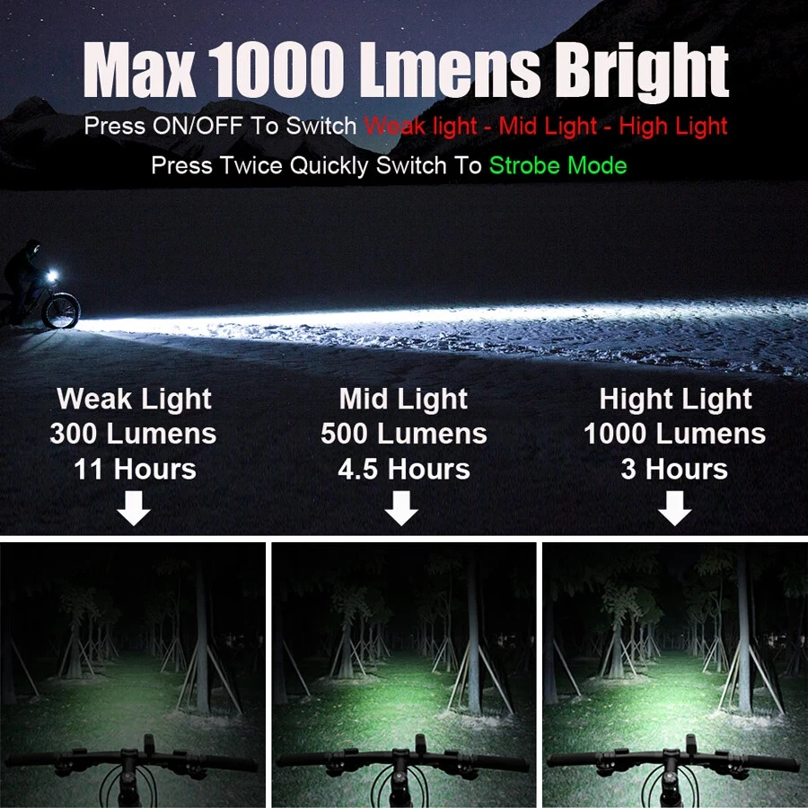 Product Details: Model: LIG520 Material: Aluminum Alloy Mode:5 Modes Waterproof: IPX-5 Lumen: Max 1000Lumen Range: About 200M Battery: About 4800 mAh Charging Time: About 5 hrs Product Features: 1. High beam/low beam. Anti-glare 2. Aluminum alloy , good heat dissipation 3. ON/OFF Different led colors to show the remaining power 4. Durable/Anti-Fall, Long Range 5. Built-in battery.USB Rechargeable 6. Automatic power off after charging finish 7. Not only a bicycle light, it's also a flashlight, and Power Bank. 8. High Brightness, Low energy consumption ****Double tap to switch High/low beam**** Package list 1. Bicycle Lights 2. USB Cable 3. Aluminum alloy bracket 4. Wrench 5. 22.8mm handlebar plastic Pad 6. 31.8mm handlebar plastic Pad 7. OTG output adapter Max 1000 Lumen Bright Press ON/OFF To Switch Low light - Mid Light - High Light Press Twice Quickly Switch To Strobe Mode Anti-glare Lighting Cut-off line design, Will not dazzle the opposite people Power Bank Not only a bicycle light, it's also a flashlight, and Power Bank, LED Power Display Know the remaining power Blue LED: output charging Green LED: 20~100% Power/full charge Red LED: ≤20% Power/input charging Built-in 4800 mAh battery IPX5 Waterproof Please note: it is not 100% waterproof. Please do not use for a long time in rainy day or put into the water