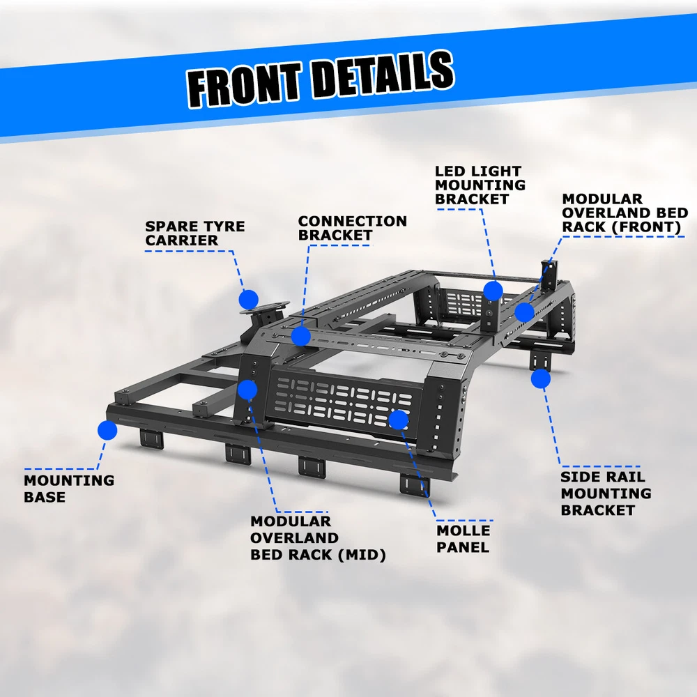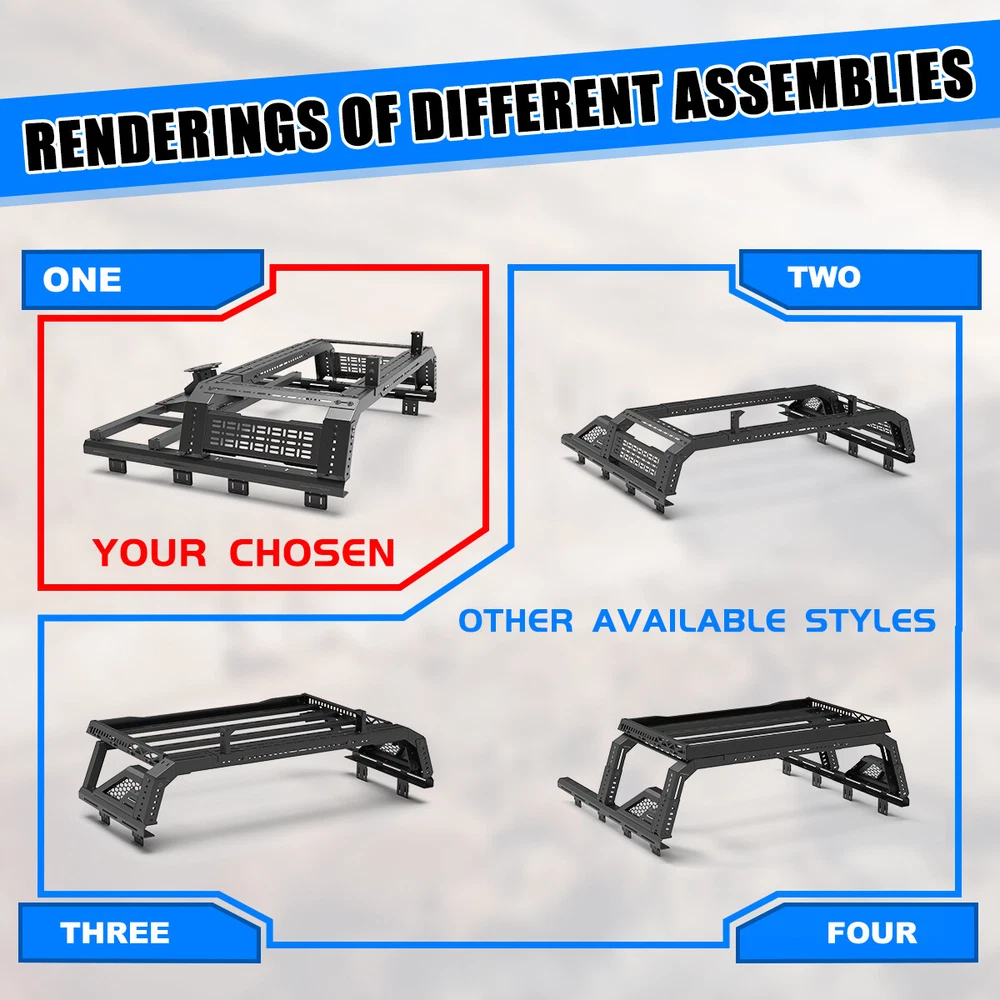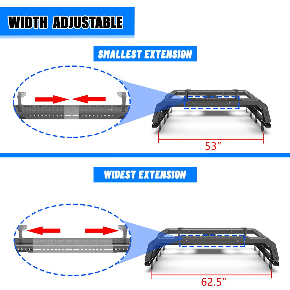 Head Lights Tail Lights Fog Lights Turn Signal Bumper Fender Flare Inner Fender Hubcaps Refrigerator Other Items for sale Head Lights Tail Lights Fog Lights Turn Signal Bumper Fender Flare Inner Fender Liners Portable Refrigerator For Universal Full-size Pickup Trucks Bed Rack Roll bar+Molle Panel+Spare Tire Specification Material: Steel Mounting Hardware: Included Surface Finish: Black Powder Coated Finished Surface: Anti-corrosion Textured Powder Coating Adjustable Length:53-62.5 inches Adjustable Height:14~19 inches Features Full New: 100% brand new and premium quality. Fitment: Compatible with All Full Size Trucks Material: The heavy duty steel construction and black powder coat finish make your truck feel good. Perfect for use in extreme temperatures and weather. Unique Design: Cold-rolled steel plate with black powder coating, equipped with welding technology, safe and non-toxic, has excellent anti-corrosion performance and electrical insulation performance, greatly improves the service life of the product, and effectively prevents the generation of rust. Warranty: 1 year manufacturer's warranty, 60-day return policy, premium quality and after-sales service, you can buy with confidence! Professional After-sales: If you have any questions, you can contact us, we have a professional after-sales team to solve your doubts! Fitment For 1994-2004 Chevrolet S-10/GMC Sonoma For 2004-2012/2015-now Chevy Colorado/GMC Canyon For 1993-2011 Ford Ranger For 2019-2023 Ford Ranger For 2020-now Jeep Gladiator For 2001-2024 Toyota Tacoma For 2022-2024 Toyota Tundra For 2001-now Nissan Frontier For 2004-now Nissan Titan For 2006-2014/ 2017-now Honda Ridgeline Package Include 1 x Truck Bed Roll Bar(Front+Middle+Molle panel+Spare tire rack) 1 x Set of Mounting Accessories (Lights are not included)