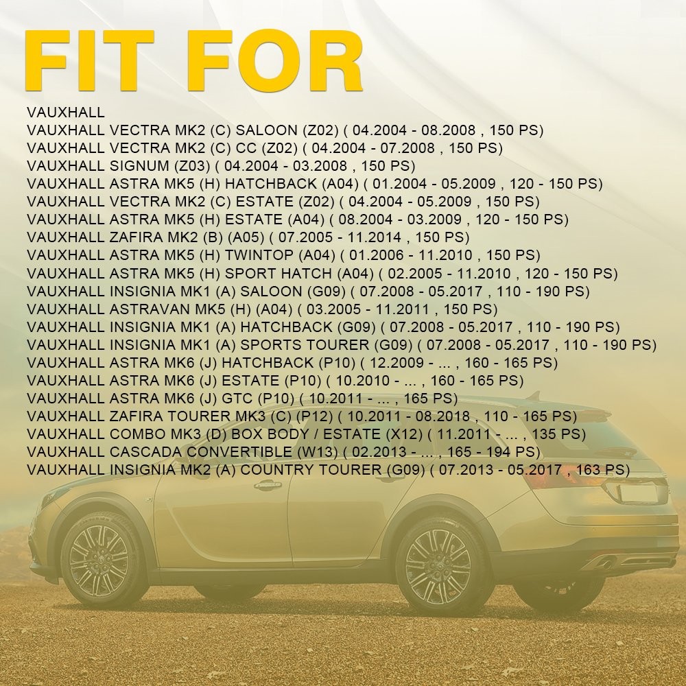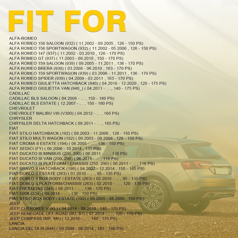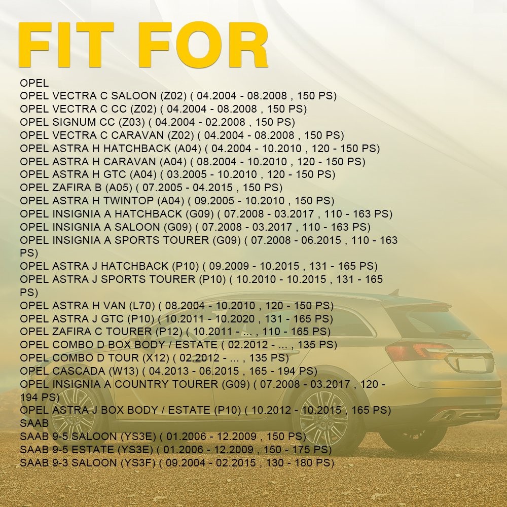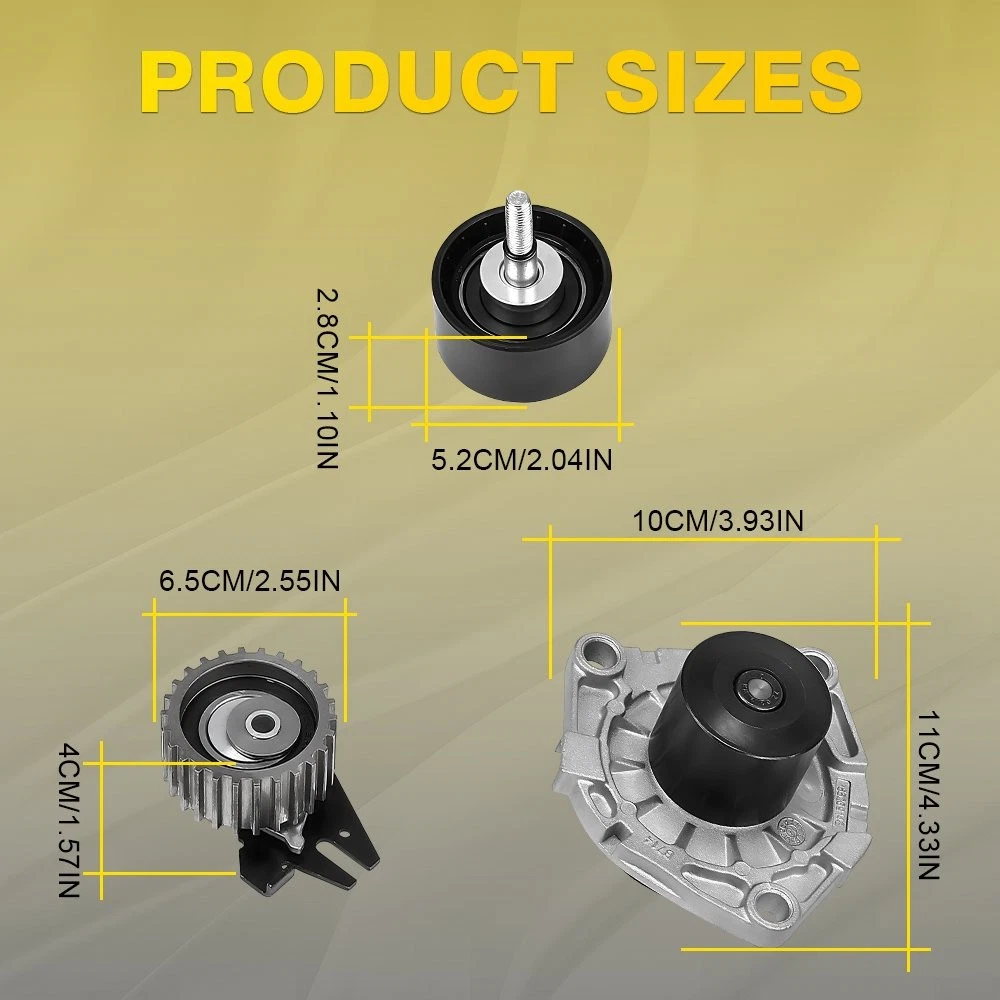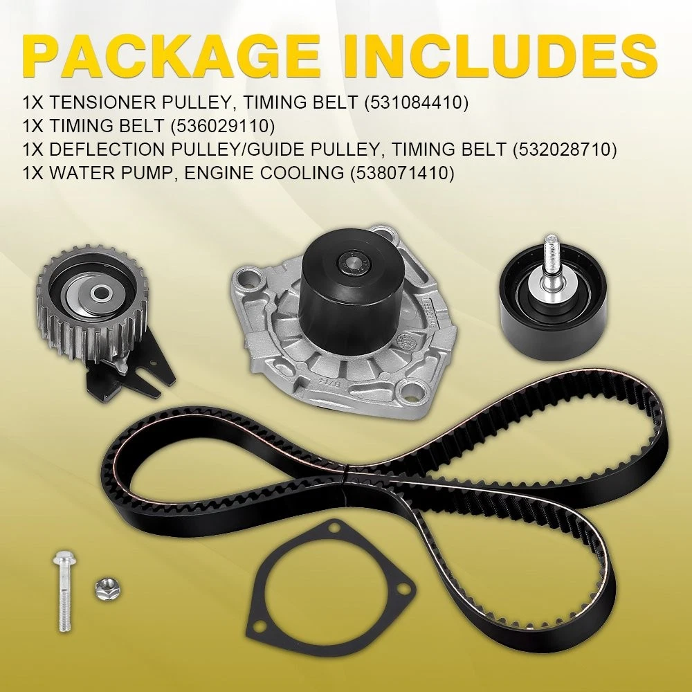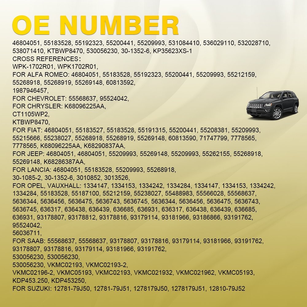 Fit for: ALFA-ROMEO ALFA ROMEO 156 Saloon (932) ( 11.2002 - 09.2005 , 126 - 150 PS) ALFA ROMEO 156 Sportwagon (932) ( 11.2002 - 05.2006 , 126 - 150 PS) ALFA ROMEO 147 (937) ( 11.2002 - 03.2010 , 126 - 170 PS) ALFA ROMEO GT (937) ( 11.2003 - 09.2010 , 150 - 170 PS) ALFA ROMEO 159 Saloon (939) ( 09.2005 - 11.2011 , 136 - 170 PS) ALFA ROMEO Brera (939) ( 03.2008 - 06.2010 , 163 - 170 PS) ALFA ROMEO 159 Sportwagon (939) ( 03.2006 - 11.2011 , 136 - 170 PS) ALFA ROMEO Spider (939) ( 04.2009 - 03.2011 , 163 - 170 PS) ALFA ROMEO Giulietta Hatchback (940) ( 04.2010 - 12.2020 , 120 - 175 PS) ALFA ROMEO Giulietta Van (940_) ( 04.2011 - ... , 140 - 175 PS) CADILLAC For Vauxhall (Insignia Astra J) 2.0 Cdti Diesel Timing Belt & Water Pump Kit Set Fit for: ALFA-ROMEO ALFA ROMEO 156 Saloon (932) ( 11.2002 - 09.2005 , 126 - 150 PS) ALFA ROMEO 156 Sportwagon (932) ( 11.2002 - 05.2006 , 126 - 150 PS) ALFA ROMEO 147 (937) ( 11.2002 - 03.2010 , 126 - 170 PS) ALFA ROMEO GT (937) ( 11.2003 - 09.2010 , 150 - 170 PS) ALFA ROMEO 159 Saloon (939) ( 09.2005 - 11.2011 , 136 - 170 PS) ALFA ROMEO Brera (939) ( 03.2008 - 06.2010 , 163 - 170 PS) ALFA ROMEO 159 Sportwagon (939) ( 03.2006 - 11.2011 , 136 - 170 PS) ALFA ROMEO Spider (939) ( 04.2009 - 03.2011 , 163 - 170 PS) ALFA ROMEO Giulietta Hatchback (940) ( 04.2010 - 12.2020 , 120 - 175 PS) ALFA ROMEO Giulietta Van (940_) ( 04.2011 - ... , 140 - 175 PS) CADILLAC CADILLAC BLS Saloon ( 04.2006 - ... , 150 - 180 PS) CADILLAC BLS Estate ( 12.2007 - ... , 150 - 180 PS) CHEVROLET CHEVROLET Malibu VIII (V300) ( 04.2012 - ... , 160 PS) CHRYSLER CHRYSLER Delta Hatchback ( 08.2011 - ... , 165 PS) FIAT FIAT Stilo Hatchback (192) ( 09.2003 - 11.2006 , 126 - 150 PS) FIAT Stilo Multi Wagon (192) ( 09.2003 - 08.2008 , 126 - 150 PS) FIAT Croma II Estate (194) ( 06.2005 - ... , 136 - 150 PS) FIAT Sedici (FY) ( 06.2006 - 10.2014 , 135 PS) FIAT Ducato III Minibus (250, 290) ( 06.2011 - ... , 116 PS) FIAT Ducato III Van (250, 290) ( 06.2011 - ... , 116 PS) FIAT Ducato III Platform / Chassis (250, 290) ( 06.2011 - ... , 116 PS) FIAT Bravo II Hatchback (198) ( 04.2007 - 12.2014 , 150 - 165 PS) FIAT Doblo II Estate (263) ( 01.2010 - ... , 95 - 135 PS) FIAT Doblo II Box Body / Estate (263) ( 02.2010 - ... , 95 - 135 PS) FIAT Doblo II Platform/Chassis (263) ( 02.2010 - ... , 120 - 135 PS) FIAT Freemont (345) ( 08.2011 - ... , 136 - 170 PS) FIAT 500X (334) ( 09.2014 - ... , 136 - 150 PS) FIAT Stilo Box Body / Estate (192) ( 09.2005 - 08.2008 , 150 PS) JEEP JEEP Cherokee V (KL) ( 04.2014 - 08.2018 , 140 - 170 PS) JEEP Renegade Off-Road (BU, B1) ( 07.2014 - ... , 120 - 170 PS) JEEP Compass (MP, M6) ( 12.2016 - ... , 140 - 170 PS) LANCIA LANCIA Delta III (844) ( 09.2008 - 08.2014 , 163 - 190 PS) OPEL OPEL Vectra C Saloon (Z02) ( 04.2004 - 08.2008 , 150 PS) OPEL Vectra C CC (Z02) ( 04.2004 - 08.2008 , 150 PS) OPEL Signum CC (Z03) ( 04.2004 - 02.2008 , 150 PS) OPEL Vectra C Caravan (Z02) ( 04.2004 - 08.2008 , 150 PS) OPEL Astra H Hatchback (A04) ( 04.2004 - 10.2010 , 120 - 150 PS) OPEL Astra H Caravan (A04) ( 08.2004 - 10.2010 , 120 - 150 PS) OPEL Astra H GTC (A04) ( 03.2005 - 10.2010 , 120 - 150 PS) OPEL Zafira B (A05) ( 07.2005 - 04.2015 , 150 PS) OPEL Astra H TwinTop (A04) ( 09.2005 - 10.2010 , 150 PS) OPEL Insignia A Hatchback (G09) ( 07.2008 - 03.2017 , 110 - 163 PS) OPEL Insignia A Saloon (G09) ( 07.2008 - 03.2017 , 110 - 163 PS) OPEL Insignia A Sports Tourer (G09) ( 07.2008 - 06.2015 , 110 - 163 PS) OPEL Astra J Hatchback (P10) ( 09.2009 - 10.2015 , 131 - 165 PS) OPEL Astra J Sports Tourer (P10) ( 10.2010 - 10.2015 , 131 - 165 PS) OPEL Astra H Van (L70) ( 08.2004 - 10.2010 , 120 - 150 PS) OPEL Astra J GTC (P10) ( 10.2011 - 10.2020 , 131 - 165 PS) OPEL Zafira C Tourer (P12) ( 10.2011 - ... , 110 - 165 PS) OPEL Combo D Box Body / Estate ( 02.2012 - ... , 135 PS) OPEL Combo D Tour (X12) ( 02.2012 - ... , 135 PS) OPEL Cascada (W13) ( 04.2013 - 06.2015 , 165 - 194 PS) OPEL Insignia A Country Tourer (G09) ( 07.2008 - 03.2017 , 120 - 194 PS) OPEL Astra J Box Body / Estate (P10) ( 10.2012 - 10.2015 , 165 PS) SAAB SAAB 9-5 Saloon (YS3E) ( 01.2006 - 12.2009 , 150 PS) SAAB 9-5 Estate (YS3E) ( 01.2006 - 12.2009 , 150 - 175 PS) SAAB 9-3 Saloon (YS3F) ( 09.2004 - 02.2015 , 130 - 180 PS) SAAB 9-3 Convertible (YS3F) ( 01.2006 - 02.2015 , 130 - 180 PS) SAAB 9-3 Estate (YS3F) ( 03.2005 - 02.2015 , 130 - 180 PS) SAAB 9-3X Estate ( 02.2009 - 12.2012 , 180 PS) SAAB 9-5 Saloon (YS3G) ( 05.2010 - 01.2012 , 160 PS) SUZUKI SUZUKI SX4 I Hatchback (EY, GY) ( 07.2009 - ... , 135 PS) VAUXHALL VAUXHALL Vectra Mk2 (C) Saloon (Z02) ( 04.2004 - 08.2008 , 150 PS) VAUXHALL Vectra Mk2 (C) CC (Z02) ( 04.2004 - 07.2008 , 150 PS) VAUXHALL Signum (Z03) ( 04.2004 - 03.2008 , 150 PS) VAUXHALL Astra Mk5 (H) Hatchback (A04) ( 01.2004 - 05.2009 , 120 - 150 PS) VAUXHALL Vectra Mk2 (C) Estate (Z02) ( 04.2004 - 05.2009 , 150 PS) VAUXHALL Astra Mk5 (H) Estate (A04) ( 08.2004 - 03.2009 , 120 - 150 PS) VAUXHALL Zafira Mk2 (B) (A05) ( 07.2005 - 11.2014 , 150 PS) VAUXHALL Astra Mk5 (H) TwinTop (A04) ( 01.2006 - 11.2010 , 150 PS) VAUXHALL Astra Mk5 (H) Sport Hatch (A04) ( 02.2005 - 11.2010 , 120 - 150 PS) VAUXHALL Insignia Mk1 (A) Saloon (G09) ( 07.2008 - 05.2017 , 110 - 190 PS) VAUXHALL Astravan Mk5 (H) (A04) ( 03.2005 - 11.2011 , 150 PS) VAUXHALL Insignia Mk1 (A) Hatchback (G09) ( 07.2008 - 05.2017 , 110 - 190 PS) VAUXHALL Insignia Mk1 (A) Sports Tourer (G09) ( 07.2008 - 05.2017 , 110 - 190 PS) VAUXHALL Astra Mk6 (J) Hatchback (P10) ( 12.2009 - ... , 160 - 165 PS) VAUXHALL Astra Mk6 (J) Estate (P10) ( 10.2010 - ... , 160 - 165 PS) VAUXHALL Astra Mk6 (J) GTC (P10) ( 10.2011 - ... , 165 PS) VAUXHALL Zafira Tourer Mk3 (C) (P12) ( 10.2011 - 08.2018 , 110 - 165 PS) VAUXHALL Combo Mk3 (D) Box Body / Estate (X12) ( 11.2011 - ... , 135 PS) VAUXHALL Cascada Convertible (W13) ( 02.2013 - ... , 165 - 194 PS) VAUXHALL Insignia Mk2 (A) Country Tourer (G09) ( 07.2013 - 05.2017 , 163 PS) Specifications: OE Numbers: 46804051, 55183528, 55192323, 55200441, 55