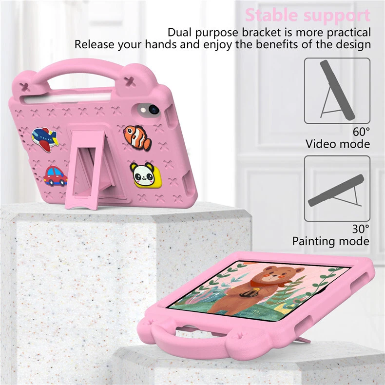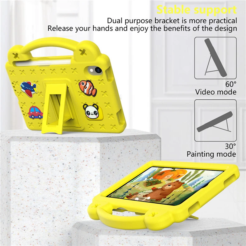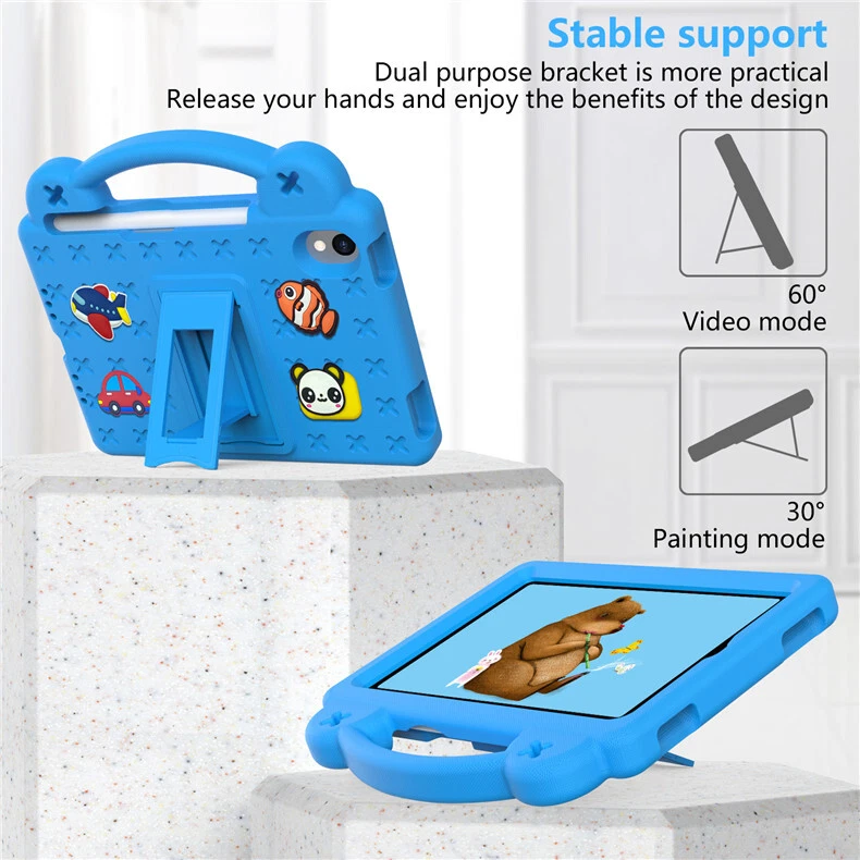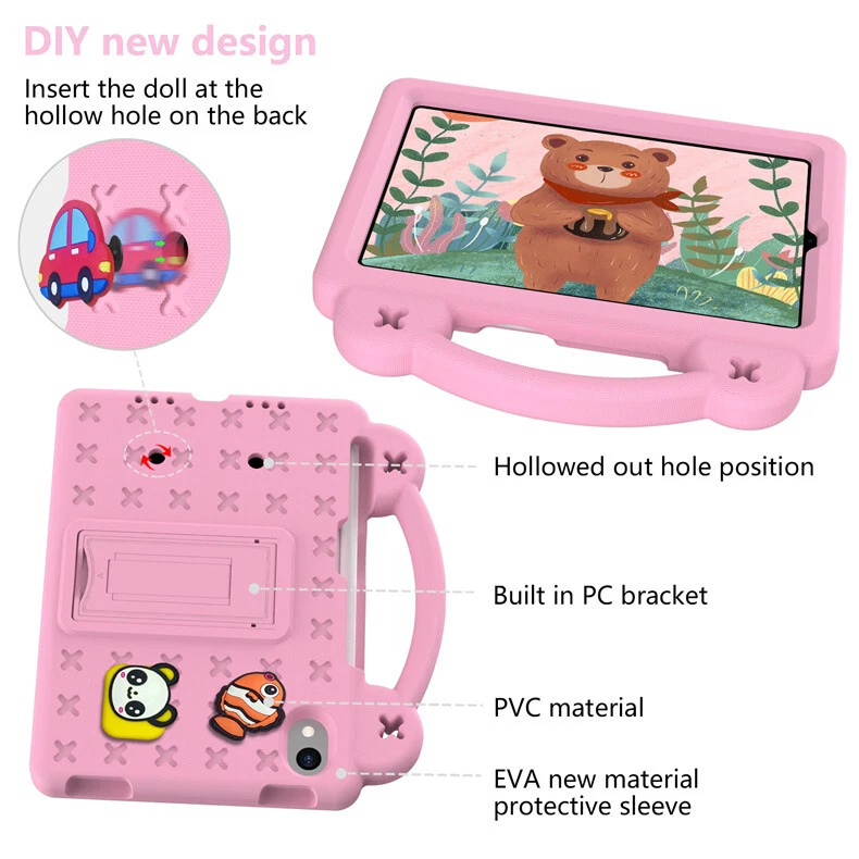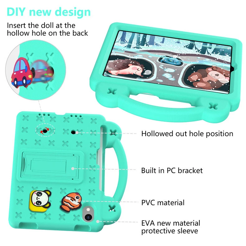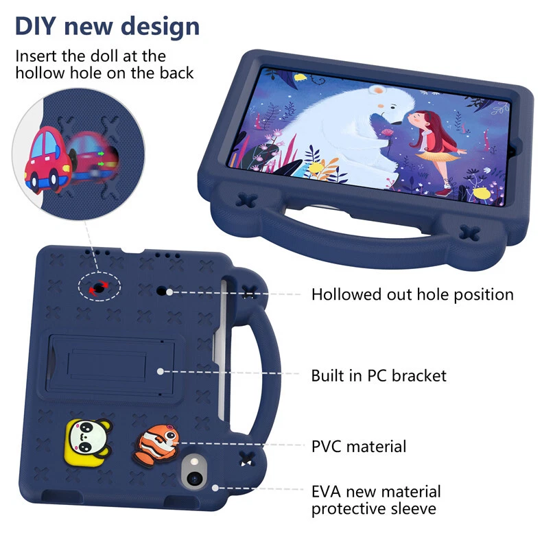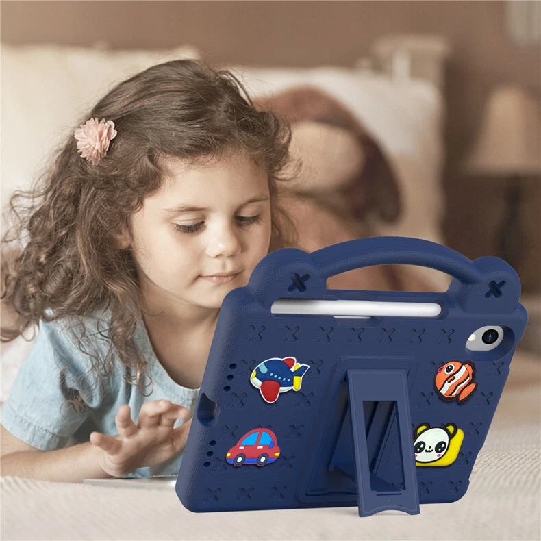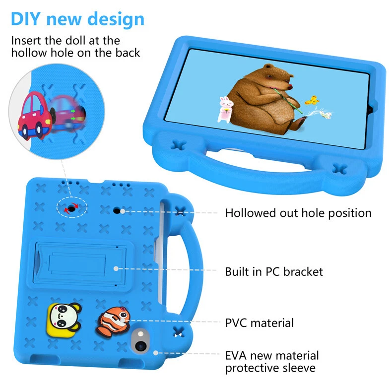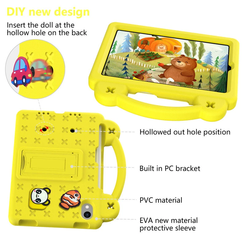 Attention: For iPad Mini 1st 2nd 3rd 4th 5th Gen 7.9” without pencil slot, all other models with pencil slot PLEASE CHECK THE MODEL OF YOUR IPAD ON THE BACK TO MAKE SURE IT MATCHES ONE OF THE MODEL NUMBERS IN THE TABLE BELOW Choose Model Name iPad Model Number Inch For iPad Mini (1st 7.9"2012) A1432/A1454/A1455 7.9 For iPad Mini (2nd 7.9"2013) A1489/A1490/A1491 7.9 For iPad Mini (3rd 7.9"2014) A1599/A1600 7.9 For iPad Mini (4th 7.9"2015) A1550/A1538 7.9 For iPad Mini (5th 7.9"2019) A2133/A2124/A2125/A2126 7.9 For iPad Mini (6th 8.3"2021) A2567/A2568/A2569 8.3 For iPad 5th Gen (9.7"2017) A1822/A1823 9.7 For iPad 6th Gen (9.7"2018) A1893/A1954 9.7 For iPad Air 1(9.7"2013) A1474/A1475/A1476 9.7 For iPad Air 2(9.7"2014) A1566/A1567 9.7 For iPad Pro 9.7" (2016) A1673/A1674/A1675 9.7 For iPad Pro 10.5 (2017) A1701/A1709/A1852 10.5 For iPad Air 3(10.5"2019) A2154/A2152/A2153/A2123 10.5 For iPad 7th Gen (10.2" 2019) A2197/A2198/A2199/A2200 10.2 For iPad 8th Gen (10.2" 2020) A2430/A2429/A2428/A2270 10.2 For iPad 9th Gen (10.2" 2021) A2602/A2603/A2604/A2605 10.2 For iPad Pro11 2018 A1979/A1980/A1934/A2013 11 For iPad Pro11 2020 A2228/A2068/A2230/A2231 11 For iPad Pro11 2021 A2301/A2377/A2459/A2460 11 For iPad Air 4(10.9"2020) A2316/A2324/A2325/A2072 10.9 For iPad Air 5(10.9"2022) A2588/A2589/A2591 10.9 For iPad 10th Gen (10.9" 2022) A2696/A2757/A2777 10.9 For iPad Pro11 2022 A2759/A2435/A2761/A2762 11 For iPad Mini (A17 Pro) 2024 A2995/A2996 8.3 Description: -Made of heavy duty thick EVA foam, family can rest assured to let children play with tablet. -This heavy duty case offers extreme rugged protection for Wear and tear and impact. -The soft environmental protection material, won't hurt you kids. -Allow easy access to all ports on the iPad, touch ID function, sensors, speakers and cameras. It's also a very thoughtful and practical perfect gift for kids, boys, girls, teens, Big boys, familys and friends. -Acts as stand for vertical or horizontal viewing. -Perfect fit, access all function without removing the case. - Because of different models, the holes of the protective case are also different. DIY Cartoon Design The cute cartoon can be moved from one hollow to another Solid Kickstand The feet of the cartoon double as a tablet stand support for viewing in landscape and vertical form Carrying Handle The carrying handle makes it easy for toddler to carry the tablet around Package included: 1x Case Cover For iPad(Case Only, iPad, Pencil and Screen Protector Not Included)