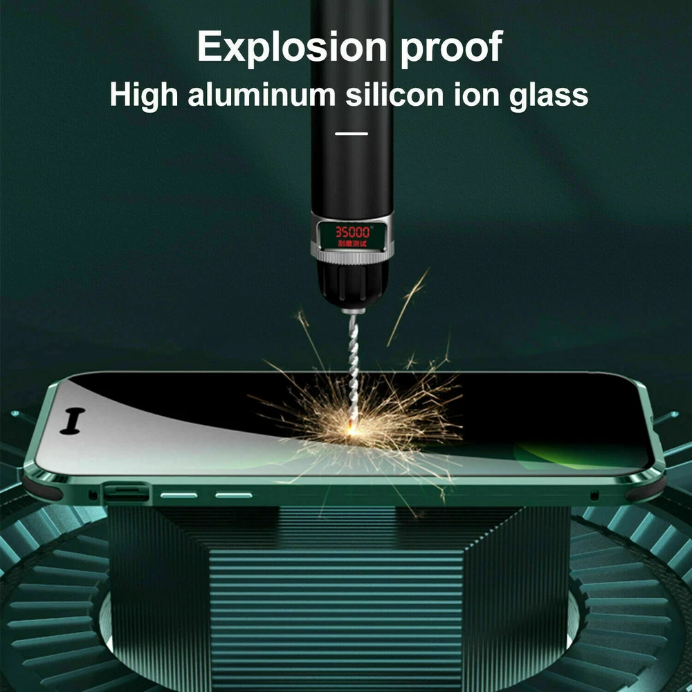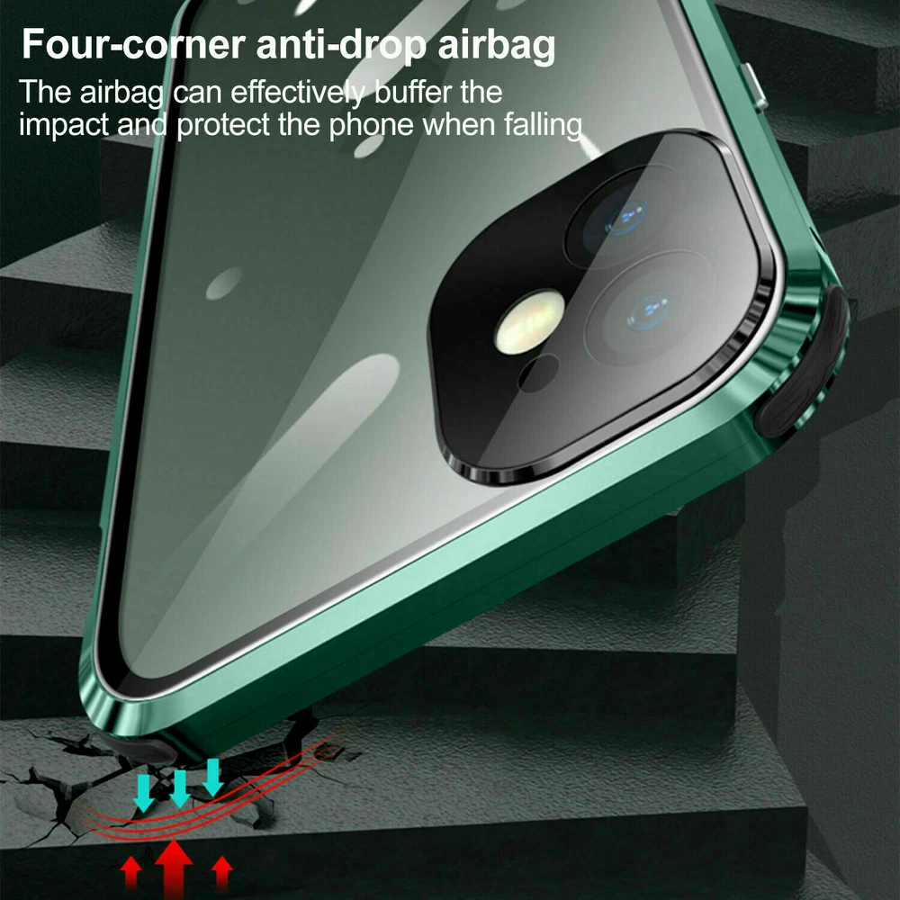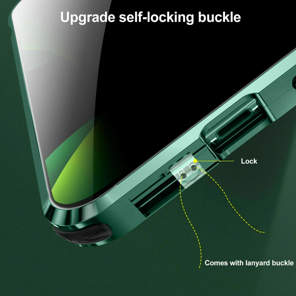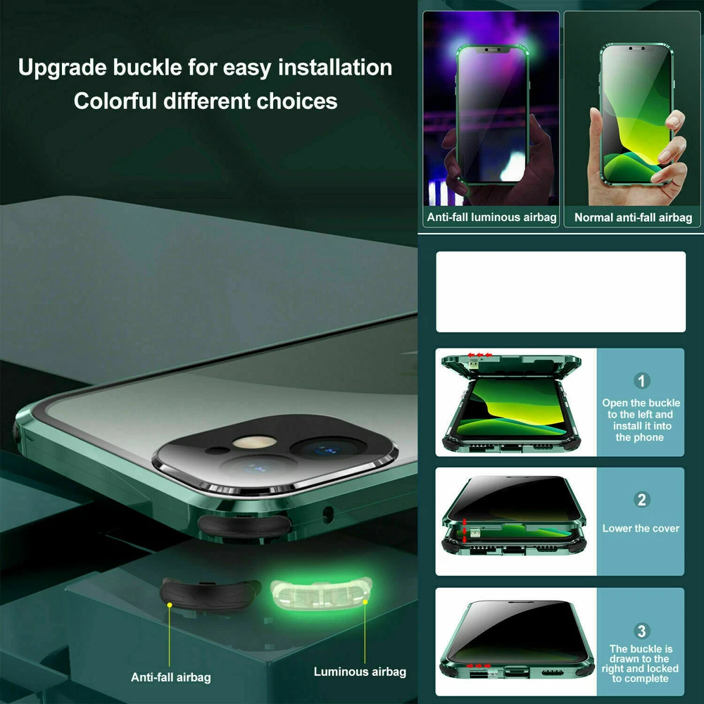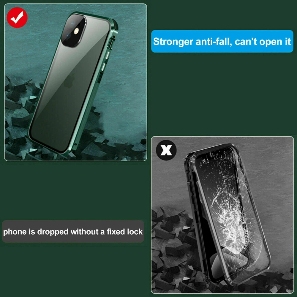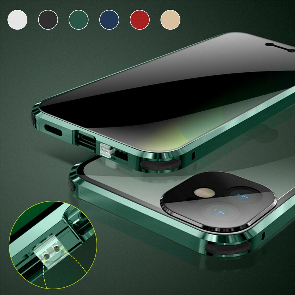 Description Features: [Magnetic Adsorption Technology]: Multipoints and strong magnetic adsorption technology make the case seamless, interesting and easy to install and remove from your phone [9H Tempered Glass front and back] : The front and back is made of 9H tempered glass to showoff the original phone design and preserve the phone\\\'s natural look. [Metal Frame]: Metal frame provide protection against drops, shock, and looks luxury [Precise Cut Outs]: Fits well to your device and make it easy to access to all ports, speakers, chargers and all Phone features. [Privacy protection]:New upgrade Anti-peeping design [Material]:Tempered Glass+Metal Package included: 1* Anti-peeping Tempered Glass Magnetic Case
