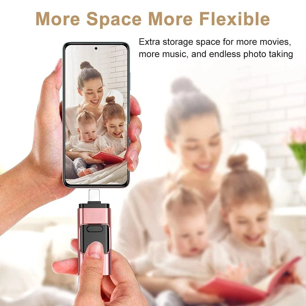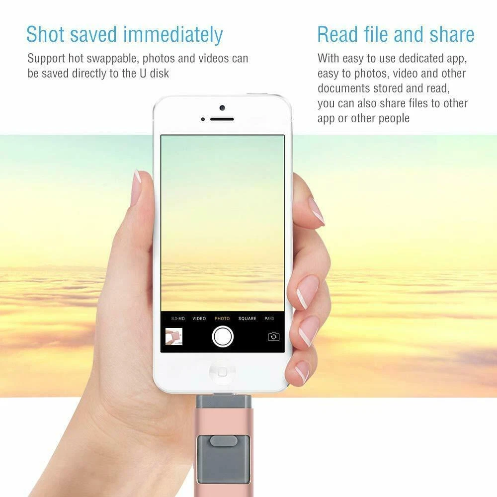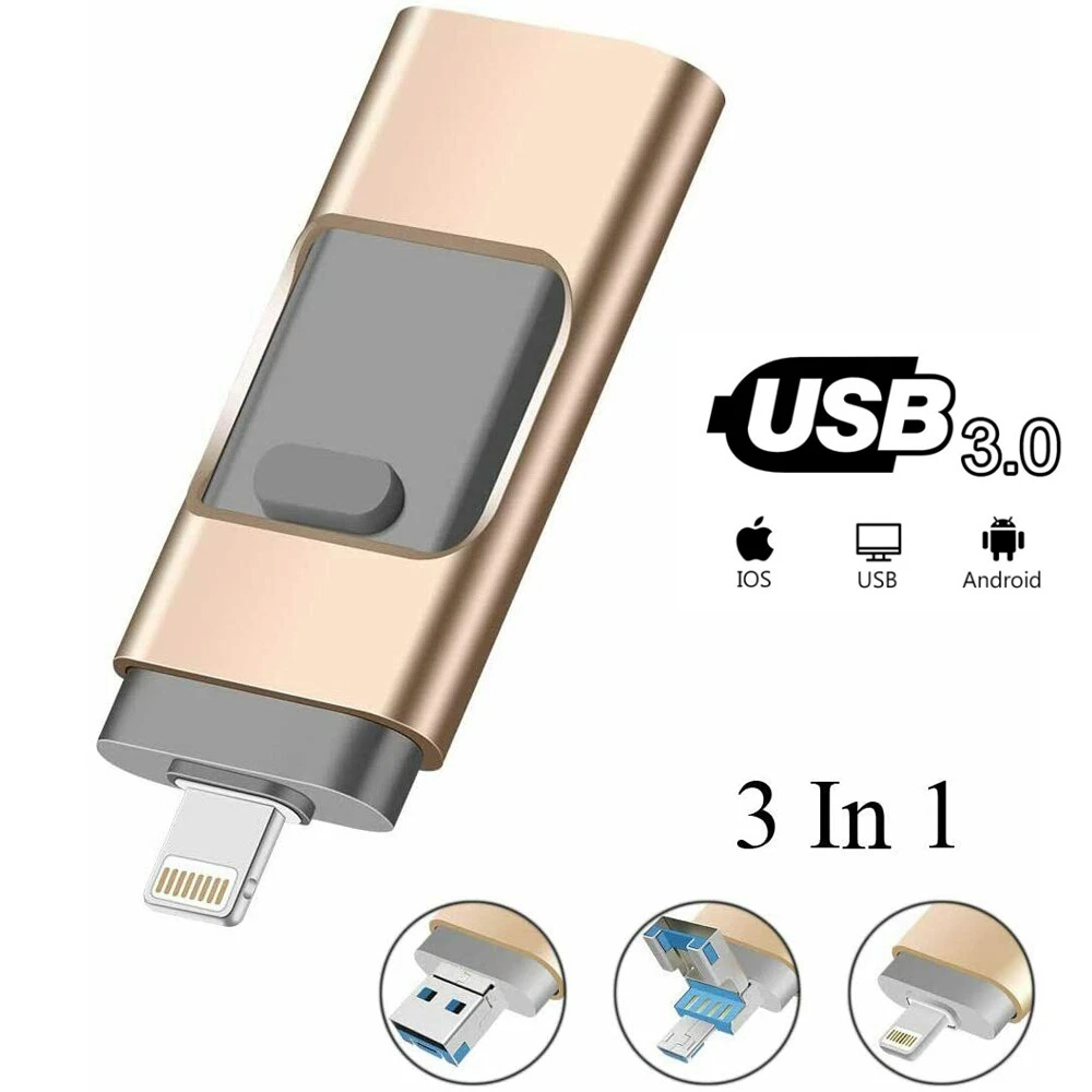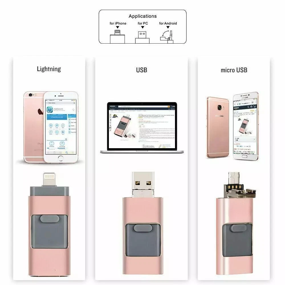 Product Description Product details 3-in-1 USB flash drive-This USB flash drive features a connector for iPhone and a standard USB A connector for computer, total 3 USB connectors available for use in different devices. Wide Compatibility-The pen drive is compatible with your iPhone, iPad, OTG Android phone or tablet, laptop, PC, Mac computer, freely transferring data among multiple systems and devices and making your work more efficient. Suppose to Windows 2000/XP/Vista/7/8/10, iOS, Mac OS v10.4/Linux v2.4/Android 4.0 or later Windows Privacy Protected-The first time you use it on your iPhone, you need to download and install the free Y- Disk app which features data encryption function to protect your privacy. Reliable & Durable-Grade- flash always keeps your data safe and push-pull design enables the end that is not in use hidden into the aluminum alloy cover to avoid damage. This jump drive is water-resistant and dustproof to withstand daily wear and tear, as well as shockproof to survive accidental drops. High Speed Transfer-Both Type-A connectors optimize USB 3.0 performance to speed up to 90Mb/s(read),30Mb/s(write) , allowing you to move and back up your full HD/4K movies, digital music, and high-resolution photos quick and fast. Specif ication Material: aluminum alloy + plastic Capacity: 256G,1TB,2TB Color: Rose Gold Weight:25g USB Type: Type-A, Lightining Package inc luded 1 x USB flash drive 1 x user manual