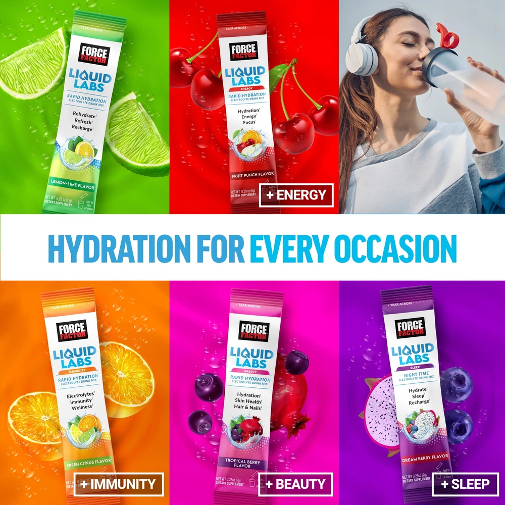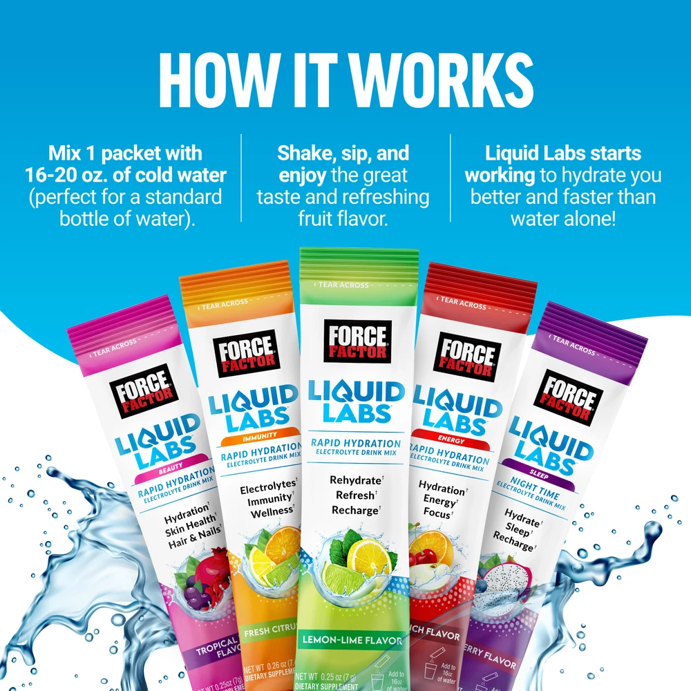 Product details Stay refreshed and energized with Liquid Labs Energy drink mix from Force Factor. Liquid Labs' advanced Hydration Optimization Matrix™ is an innovative electrolytes powder formulated to deliver rapid, superior hydration. This unique blend of five key electrolytes, coconut water, and Aquamin sea mineral complex helps you stay hydrated and perform at your peak, no matter where life takes you. Our hydration packets and daily energy drink are designed for on-the-go convenience, providing 3x more electrolytes and 10x less sugar than leading sports drinks. The electrolytes powder packets are easy to mix with water, creating an electrolyte drink that is both delicious and efficient in replenishing your body's essential nutrients. Whether you're an athlete, a fitness enthusiast, or just someone who needs an energy boost, Liquid Labs rapid hydration supplement provides a healthier, more effective alternative to traditional sports drinks. Upgrade your hydration game with Liquid Labs Hydration Supplement by Force Factor, and experience the difference in performance, endurance, and overall wellbeing. Order now and join the growing community of active adults, athletes, and busy professionals who trust Liquid Labs for their hydration needs. HYDRATE FASTER & BETTER: Liquid Labs’ exclusive Hydration Optimization Matrix blends five key electrolytes, coconut water, and Aquamin sea mineral complex with natural cane sugar to speed up absorption to hydrate you better and faster than water alone. BOOST ENERGY & FOCUS: Every delicious sip contains Panax ginseng, green tea, and taurine – a naturally uplifting blend of energizing ingredients to help you boost energy, focus, and motivation for work, workouts, and everything in between. CONTAINS 10X LESS SUGAR: Too many sports drinks and electrolytes powders are overloaded with sugar. Liquid Labs is a great-tasting, better-for-you hydration powder that is made with 10x less sugar than the leading sports drink. MADE WITH 3X MORE ELECTROLYTES: Don’t be fooled by hydration packets that are mostly sugar and salt. Liquid Labs hydration packs contain 3x more electrolytes than leading sports drinks, providing you with fast, refreshing, high-quality hydration. REFRESHING & GREAT-TASTING: Water is vital for good health, but it can be a little boring. Liquid Labs electrolyte drink mix is bursting with refreshing fruit flavor you’ll love, and contains no artificial sweeteners or artificial dyes.