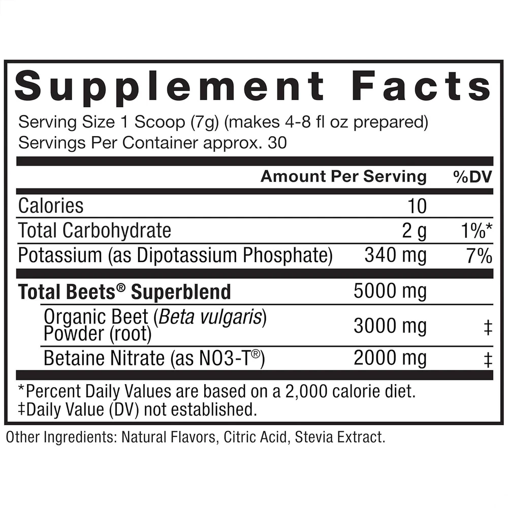 Force Factor Total Beets Drink Mix Superfood Powder 30 Servings (Pack of 1) Product Details Product Dimensions : 3.63 x 3.63 x 3.63 inches; 9.1 ounces Item model number : FFS-00623-FG Country of Origin : USA Brand: Force Factor Flavor: Pomegranate Berry Primary Supplement Type: multivitamin Unit Count: 7.4 Ounce Item Form: Powder Item Weight: 9.1 ounces Item dimensions L x W x H: 3.63 x 3.63 x 3.63 inches Special Ingredients: Beet Powder, Betaine Nitrate Diet Type: Gluten Free Product Benefits: Blood Pressure Management HEART-HEALTHY ENERGY: Beetroot powder provides a natural kick of heart-healthy energy without stimulants. Total Beets contains 3 grams of beet root powder per serving and will help you feel refreshed throughout the day, without cardiovascular strain. Product Note: Exposure to heat or sunlight may lead to melting/damage of product. Hence customers are expected to be available during the product delivery BOOST NITRIC OXIDE: Powerful NO3-T nitrates work to boost your body's natural production of nitric oxide, dilating your blood vessels for enhanced circulation. Like any good superfood, this helps improve blood flow and nutrient delivery to your muscles. ENDURANCE & STAMINA: With an increase in N.O. comes an incredible rush of endurance and stamina, helping you get more done and exercise more efficiently. Whether you're an athlete or just looking for a boost, you will feel the difference with Total Beets. AMAZING TASTE: Beets are polarizing. Some people love the taste, some people hate it. Total Beets tastes amazing, with a delicious pomegranate berry flavor that masks virtually all of the raw beet notes. And better yet, no juicing required MADE IN USA: Force Factor vitamins and supplements are expertly formulated with premium, globally sourced ingredients that are carefully tested for quality and potency. They are produced in GMP-certified, FDA-audited facilities right here in the USA. CIRCULATION SUPERFOOD POWERHOUSE Total Beets original powder is a great-tasting, heart-healthy drink mix that contains natural beetroot and innovative NO3-T nitrates to boost nitric oxide production and support healthy blood flow. This helps you experience more energy, endurance, and stamina without having to use heart-straining stimulants. Total Beets 3 grams of beet root powder can helps to boost circulation and Unleash Your Potential.