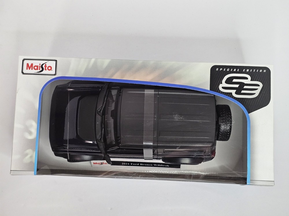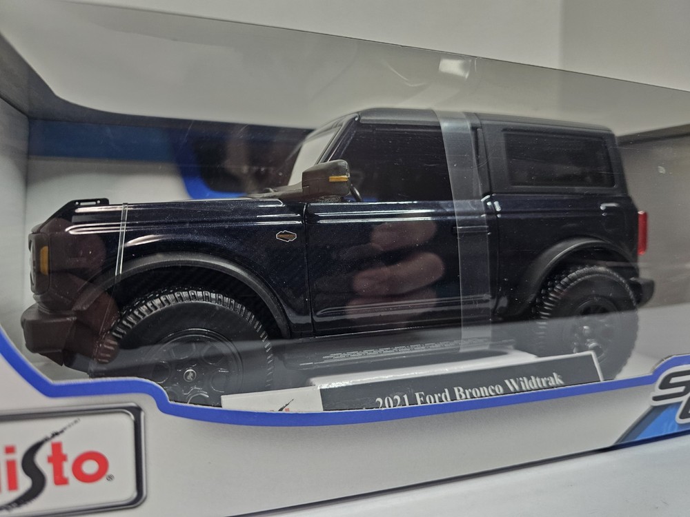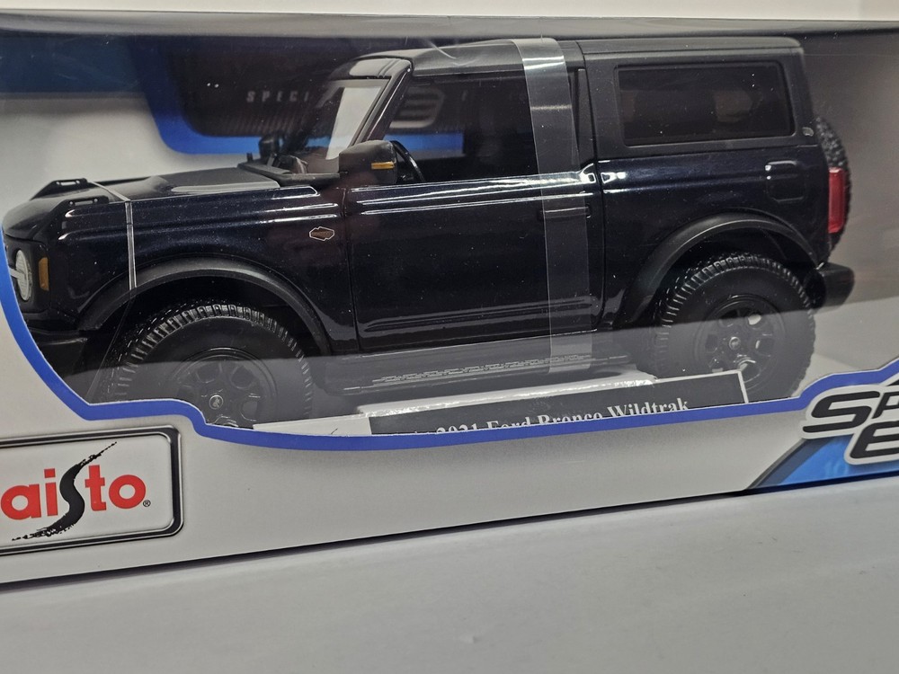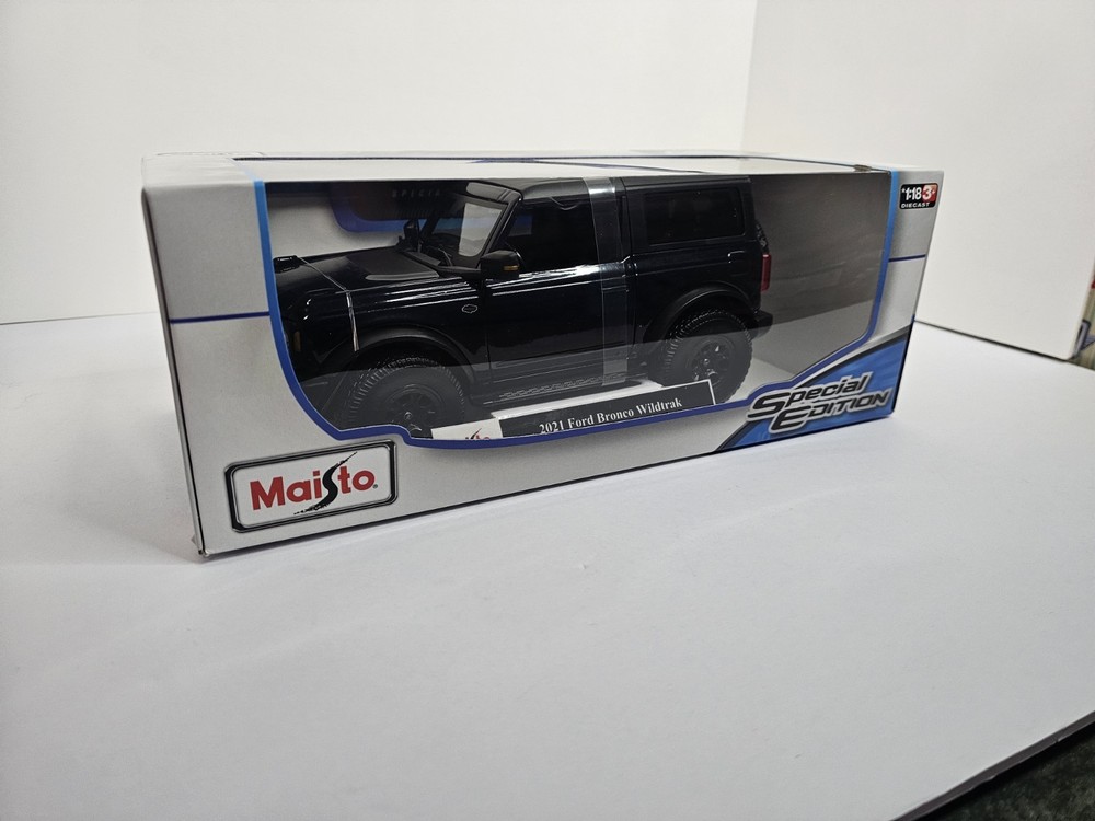 The product is a Maisto Special Edition 1:18 scale diecast model of the 2021 Ford Bronco Wildtrak 2 door hardtop in black. This collectible toy vehicle features intricate details and is a perfect addition to any car enthusiast's collection. Made in China, this model showcases the iconic Ford Bronco design and is a must-have for fans of contemporary diecast vehicles.