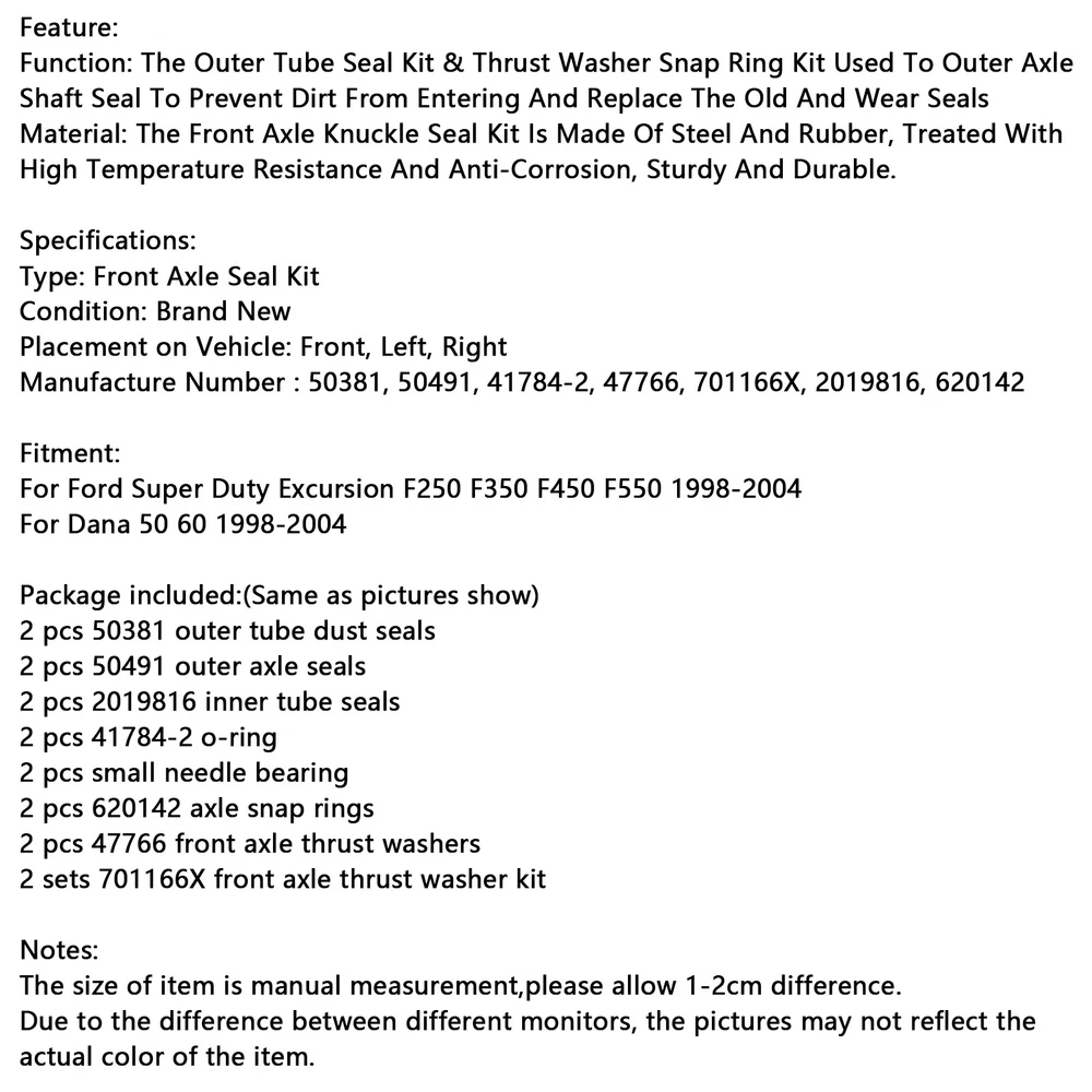 You may also like Electric Trailer Brake Kit-12"-Left and Right Hand Assemblies-5200 to 7000 lbs 89.69 USD Free shipping Heater Hose Output T Pipes 87248-60460 Fits Toyota LX450 LX470 Sequoya Sienna US 11.69 USD Free shipping Pair Headlight Replace Lens Cover Left&Right Smoke For C6 Corvette 2005-2013 USA 75.69 USD Free shipping Third 3rd Brake Stop Light 8T0945097B For Audi A5 S5 Sportback 2009-2016 28.69 USD Free shipping Valve Cover Adapter 55-86 Perimeter to 87-02 Center Bolt Head 350 327 551542 To 59.69 USD Free shipping G4NB 1.8L Engine Crankshaft&Rods & Bearings Set for Hyundai Elantra Forte KIA 179.99 USD Free shipping SAFE & SECURE SHOPPING 100% SATISFACTION GUARANTEED FAST SHIPPING Store Categories Store Categories Other eBay Motors Honda Toyota Ford Chevrolet Audi Mercedes-Benz Dodge Jeep You may also like Front Axle Seal and Thrust Washer Kit Fit Ford Excursion F250 F350 1998-2004 U Product Description Feature: Function: The Outer Tube Seal Kit & Thrust Washer Snap Ring Kit Used To Outer Axle Shaft Seal To Prevent Dirt From Entering And Replace The Old And Wear Seals Material: The Front Axle Knuckle Seal Kit Is Made Of Steel And Rubber, Treated With High Temperature Resistance And Anti-Corrosion, Sturdy And Durable. Specifications: Type: Front Axle Seal Kit Condition: Brand New Placement on Vehicle: Front, Left, Right Manufacture Number : 50381, 50491, 41784-2, 47766, 701166X, 2019816, 620142 Fitment: For Ford Super Duty Excursion F250 F350 F450 F550 1998-2004 For Dana 50 60 1998-2004 Package included:(Same as pictures show) 2 pcs 50381 outer tube dust seals 2 pcs 50491 outer axle seals 2 pcs 2019816 inner tube seals 2 pcs 41784-2 o-ring 2 pcs small needle bearing 2 pcs 620142 axle snap rings 2 pcs 47766 front axle thrust washers 2 sets 701166X front axle thrust washer kit Notes: The size of item is manual measurement,please allow 1-2cm difference. Due to the difference between different monitors, the pictures may not reflect the actual color of the item. About Us Shipping Terms Returns Contact Us About Us VIPIH is one of the international leading distributors specialized in distribution of auto spare parts of the world’s prime auto part suppliers on a global scale with the full responsibility in procurement, shipping, sales and marketing and after sales service. VIPIH fulfills all needs of its clients completely and on a timely basis with the know-how it has built up since it was established and the comprehension knowledge of the sectors standards. The perfectionist approach in product quality, high service availability, strict principle of business follow-up, reliability and the good reputation which has gained strength as a result of customer satisfaction are the most striking components of VIPIH ’ s success. VIPIH is presently capable of supplying all demands for auto parts from the gear box to turbo hoses in a wide range. Free delivery with worldwide shipping options available. If can not locate what you need then please get in touch! Shipping United States Buyers Parcel will via USPS or UPS from us United States warehouse Shipping Time Usually ,Parcel will be delivered 2-7 working day include Handling time. Sometimes shiping time may has a little delay, such as Bad wether,Holidays Terms We stand behind everything that we sell and will do everything possible to assure you are satisfied. When you receive your purchase if you are not 100% satisfied, please sent me ebay message and we will do our best to make you happy. If you still want to return your purchase, simply ship the item(s) back to us and we will refund your original purchase price and the original shipping charge. Buyers are responsible for the postal cost of returning the items. We must be notified of the intent to return your item within 30 days of receiving the item. Items returned must be in the same condition that they were received. How to return 1,Please ask us for return address . 2,Shipping back the package . The RMA#(Return Merchant Authorization Number = Your ebay ID) must be clearly written on the return package ,Otherwise the package will be refused. 3,Sent us the return tracking number. 4,All returns will be inspected prior to a credit being issued. Returns 1:Returns are accepted within 60 days of purchase. 2:All returned items MUST BE in the original packaging. 3:We will be happy to assist you if if any item needs to be returned or replaced 4:Please don't open a return request before contacting us first to solve, many thanks. Contact Us If you have any questions, our Customer Service staffs welcome you to sent me ebay message. We strive to answer all questions and resolve any problems as quickly as possible. Business Hours: Monday-Saturday 9:00-17:00 Copyright © Vipih All rights reserved