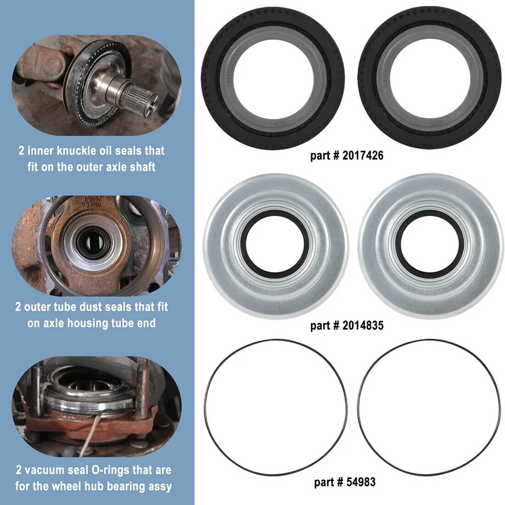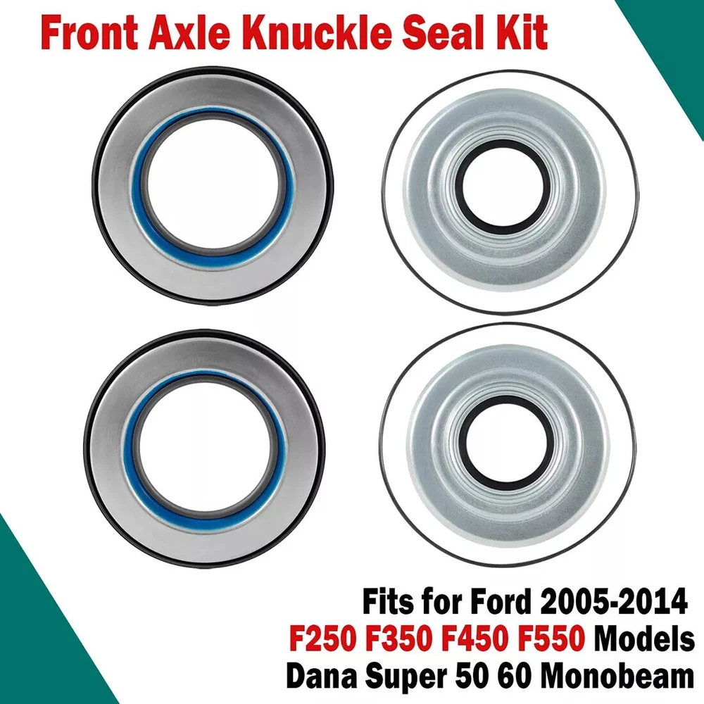 For Ford Super Duty F250 F350 Dana 60 Front Outer Axle Vaccum Inner Knuckle Seal Fitment: The front axle seal kit is compatible with 2005 2006 2007 2008 2009 2010 2011 2012 2013 2014 Ford Super Duty F250 F350 F450 F550 dual or single rear wheel 4X4 trucks with front dana 60 axles Features: 1) The tube seal kit is used for the outer axle shaft seal to prevent dirt from entering and replace the old and worn seals. Rebuild the front axle for Ford Super Duty F250 F350 F450 F550 2) 2 inner knuckle oil seals that fit on the outer axle shaft, 2 outer tube dust seals that fit on axle housing tube end, 2 vacuum seal O-rings that are for the wheel hub bearing assy.(total 6 pieces). Replace for part # 2017426, 2014835, 54983 3) The front axle knuckle seal kit is made of steel and rubber, treated with high-temperature resistance and anti-corrosion, sturdy and durable 4) This kit is used for the Front Axle to prevent lubricant leakage or dirt from entering and offer your rebuild or maintenance job a successful end paired with the expected performance. Best replacements for your worn or damaged seals Package including: qty 2 Inner Knuckle Seals (Part # 2017426) qty 2 Outer Tube Dust seals (Part # 2014835) qty 2 O-Ring (Part # 54983 )