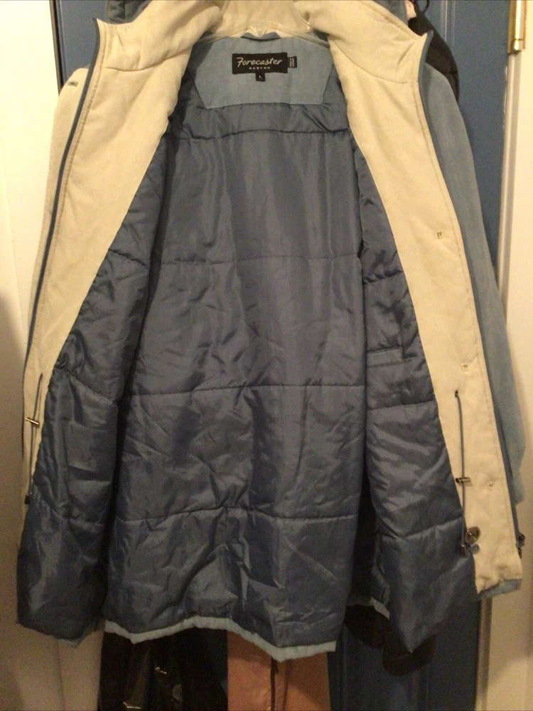 This Forecaster of Boston coat for women is the perfect addition to your winter wardrobe. The blue parka features a solid pattern, long jacket/coat length, and a relaxed fit. It is made with polyester outer shell material and polyester lining material, and is insulated with polyester insulation material. The coat has pockets for convenience and comes with both a zip and button closure. The vintage coat is machine washable and is perfect for casual occasions during the winter, fall, or spring seasons. The coat is available in size L and is a classic addition to any wardrobe. The faux suede detailing adds a touch of style to the coat, making it perfect for any fashion-forward woman.