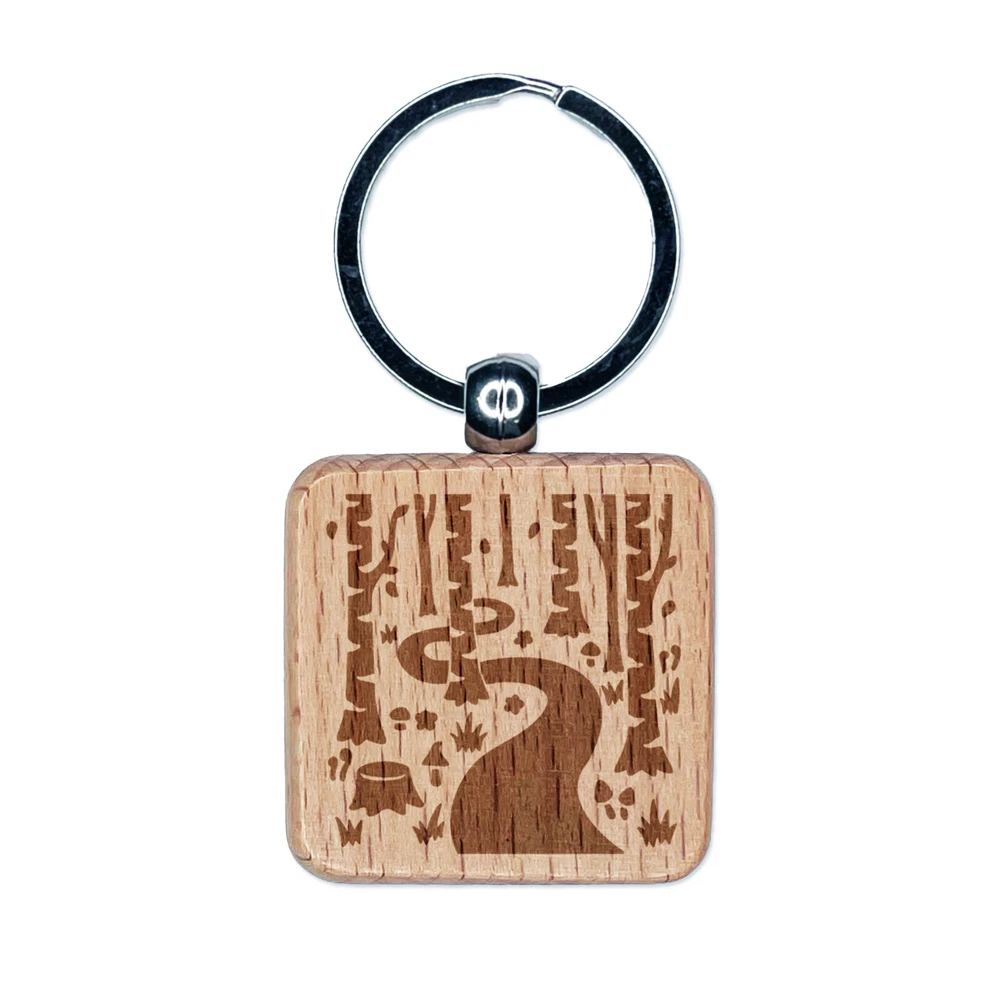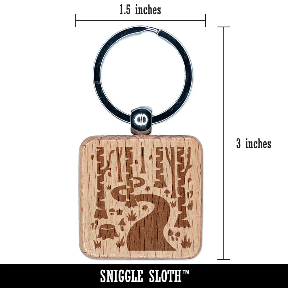 Forest Trail Birch Trees and Mushrooms Engraved Wood Square Keychain Tag Charm