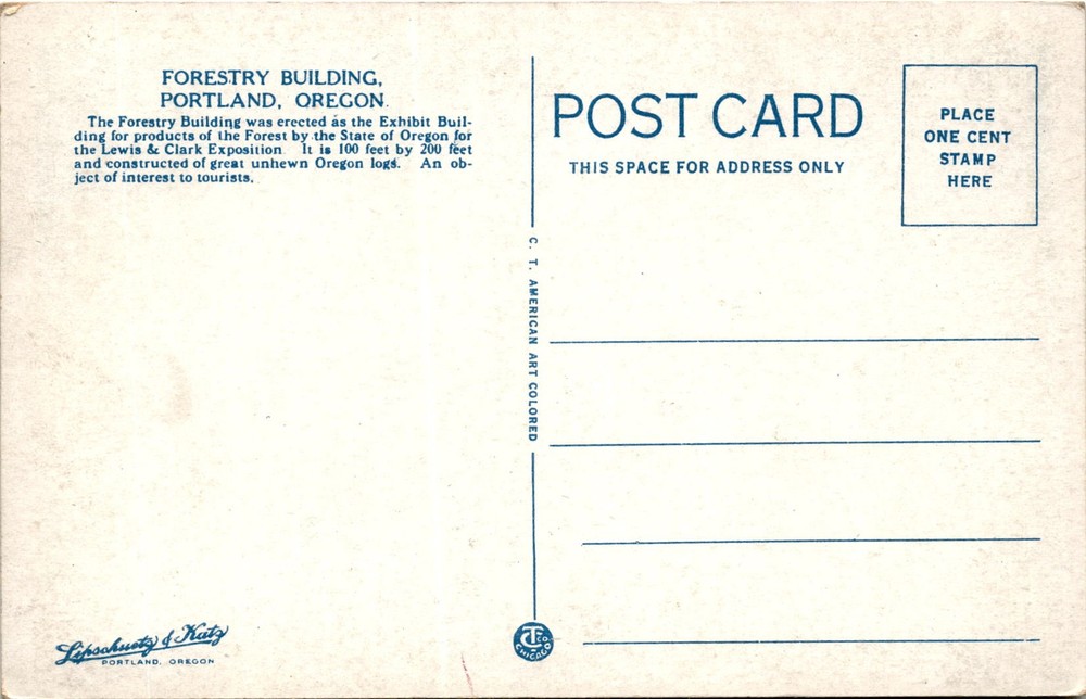 The postcard features a photograph of the Forestry Building, also known as the Lewis and Clark Memorial, in Portland, Oregon. The building was constructed using immense Oregon logs and served as the Exhibit Building for forest products during the Lewis & Clark Exposition. It measures 100 feet by 200 feet and is a notable attraction for tourists.