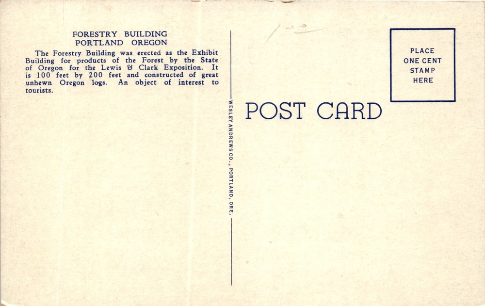 The postcard features a photo of the Forestry Building, also known as the Lewis and Clark Memorial, located in Portland, Oregon. The building was constructed as the Exhibit Building for forest products by the State of Oregon for the Lewis & Clark Exposition. It measures 100 feet by 200 feet and is made of large unhewn Oregon logs.
