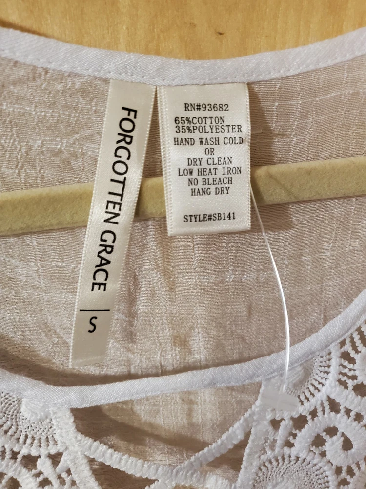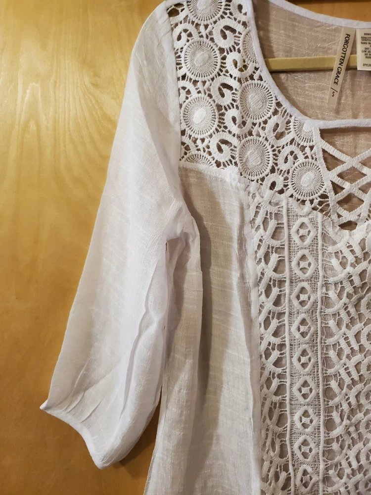 Forgotten Grace White Cotton Blend Embroidered Front Lined Blouse, Size Small Color - White Material - 65% Cotton and 35% Polyester. A very lightweight and soft comfortable material, breathable! Front embroidered center panel is lined. Size - Small Shoulders - 16" Chest - 18.5" Top Length - from center back neck to hem - 24" Sleeve Length 3/4 - 17" Care Instructions: Dry Clean - to maintain the best shape. Check out my other Forgotten Grace items.