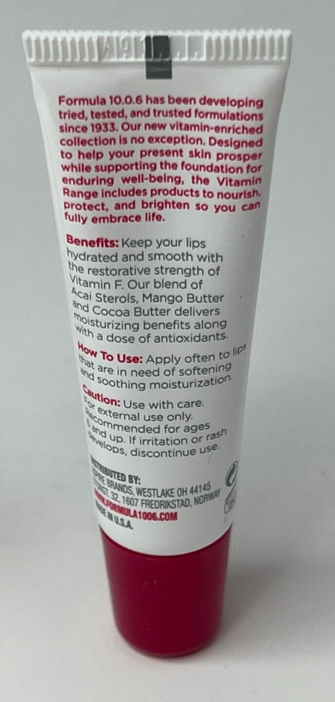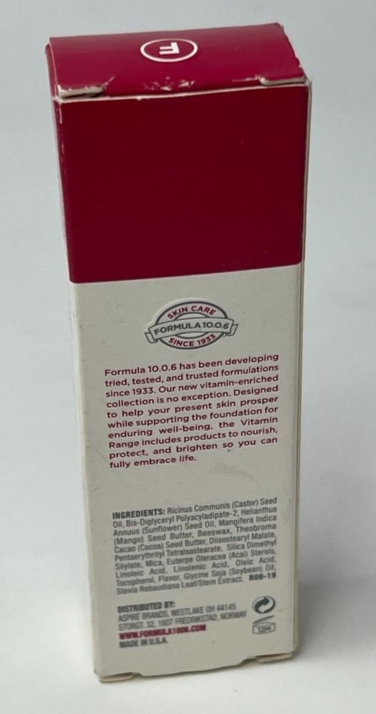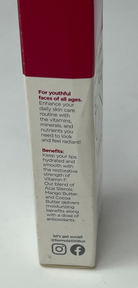New in box with light wear Formula 10.0.6 Shine On Vitamin F Moisturizing Lip Balm Acai & Mango Butter Size: 0.42oz. Product Condition PRODUCT CONDITION: We sell vintage, overstocks, returns, shelf-pulls and new items. Items could have dents, shelf wear, torn and not in the greatest condition. In no way does this effect the product itself. If we think a product is unsafe or used, we will not list it. We inspect carefully and will describe the condition as best as we can. Any problems, please contact us immediately so we can rectify the problem. Shipping Shipped within 1 Business Day. All orders are processed and shipped out within 1 Business Day. All orders received on Saturday and Sunday will be shipped out Monday. Returns 30 Day Return Policy on most items. We will gladly accept returns. Item(s) must be returned in original, unused condition within 30 days with original tags/packaging. Cancellation Policy If you wish to cancel the order, please open a cancellation request. If the order has not already been processed, the order will be cancelled and a full refund will be applied. Please do not message to request for cancellation, as we might not be able to address all messages in timely manner. Incorrect Shipping Address It is Buyers responsibility to ensure that the shipping address provided is correct.