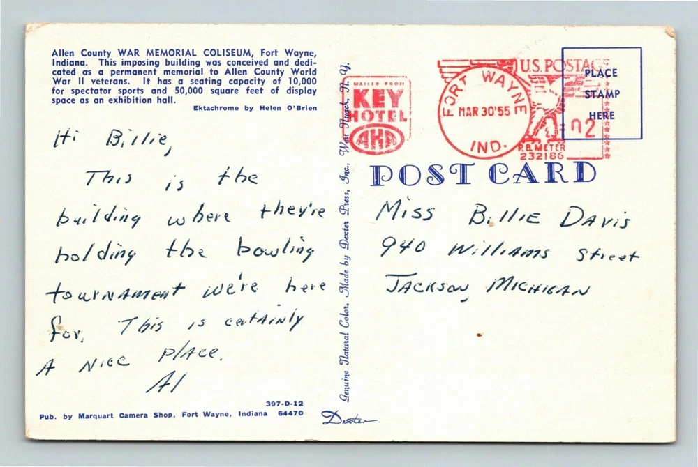 Fort Wayne IN-Indiana, Allen County War Memorial, c1955 Vintage Postcard