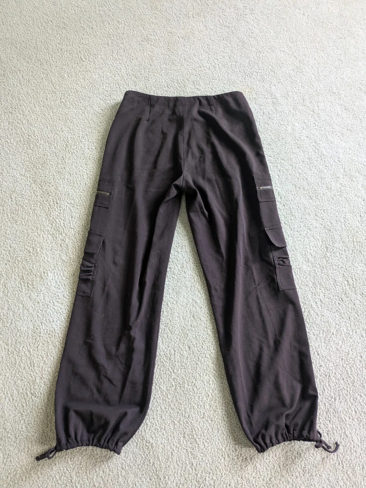 Super cute and very well made, heavy cargo pants! Very comfortable. 31in waist, 31in inseam, 10in waist to crotch, 4 pockets - zippers are not actual pockets though, tie ankles for adjustable fit!