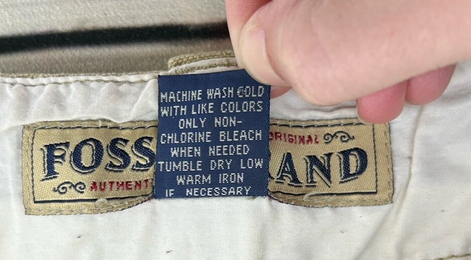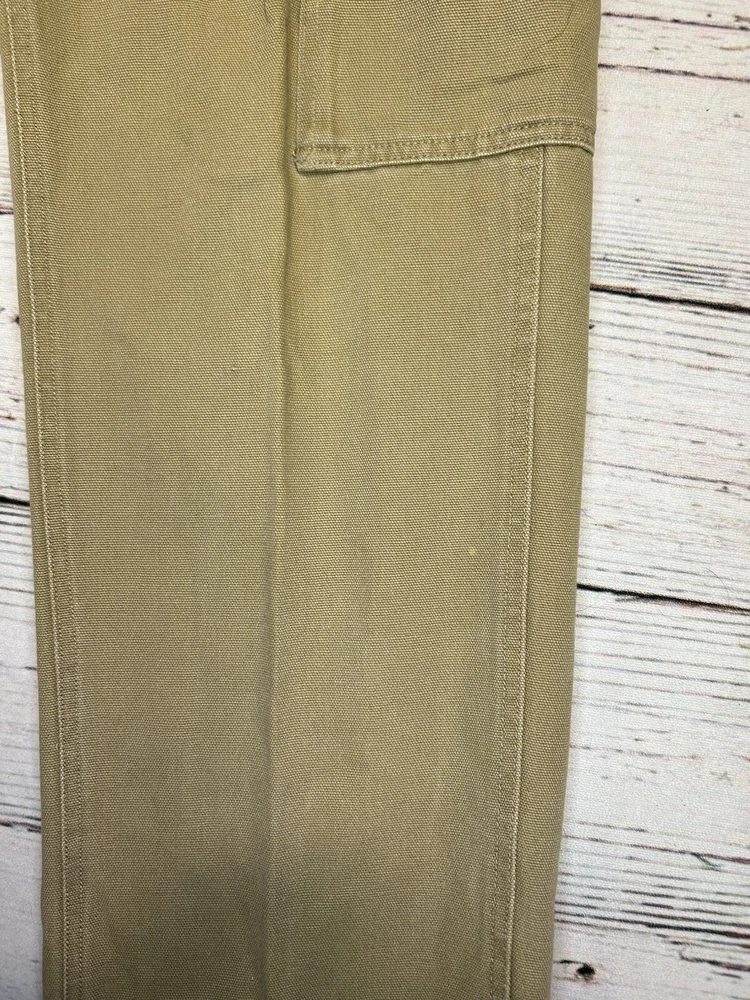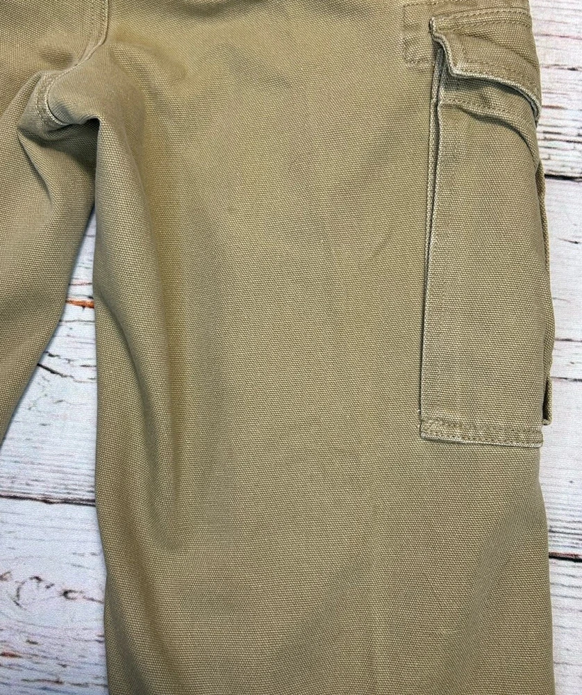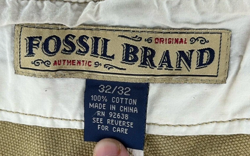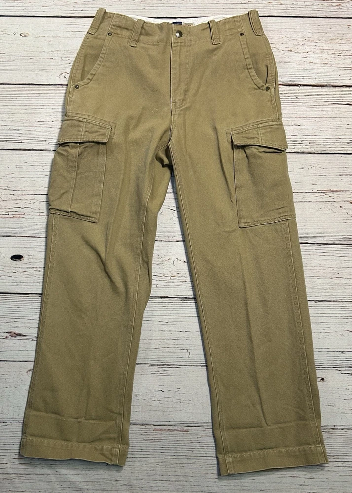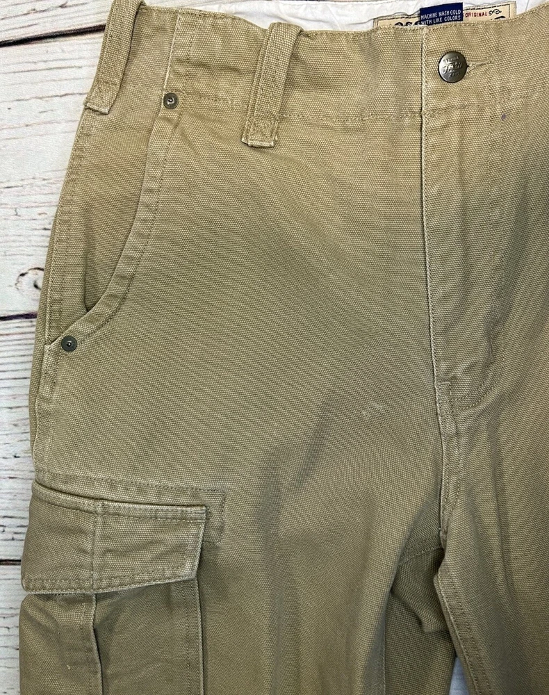 These are Fossil brand cargo pants for men in size 32x32. They are beige in color and made of cotton. The pants feature a zip closure, straight leg style, and mid-rise fit. They have slash pockets and utility cargo pockets. Machine washable for easy care. Perfect for everyday wear. Has some marks. Check pictures for condition and measurements for size.