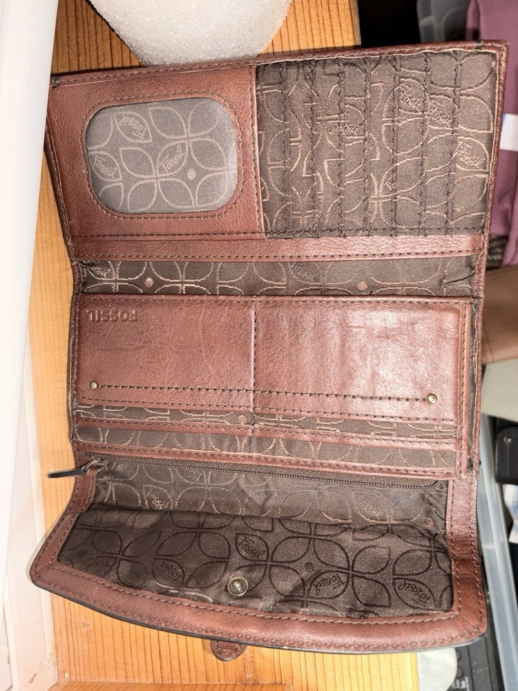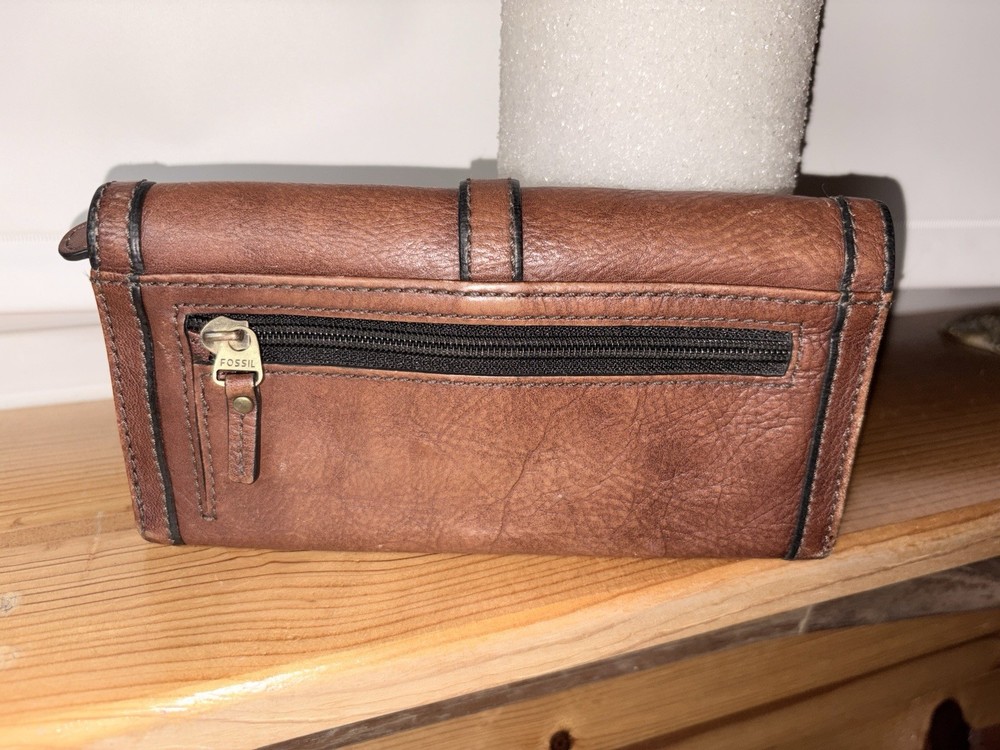 Elevate your everyday carry with this Fossil continental clutch wallet crafted from genuine brown leather. Featuring a stylish turn-lock snap closure and contrast stitching, this wallet combines classic craftsmanship with practical functionality. The interior boasts multiple card slots, an ID window, a full-length bill compartment, and a zippered coin pocket. A rear zip pocket adds extra storage for receipts or change. Fully lined with Fossil’s signature print. • Brand: Fossil • Color: Brown with black contrast trim • Style: Continental / Clutch Wallet • Material: Genuine leather • Closure: Turn-lock flap with snap • Features: • 12+ card slots • ID window • Interior zippered pocket • Exterior zip pocket • Condition: Gently used, well cared for • Dimensions (approx): 7.5” W x 4” H x 1” D