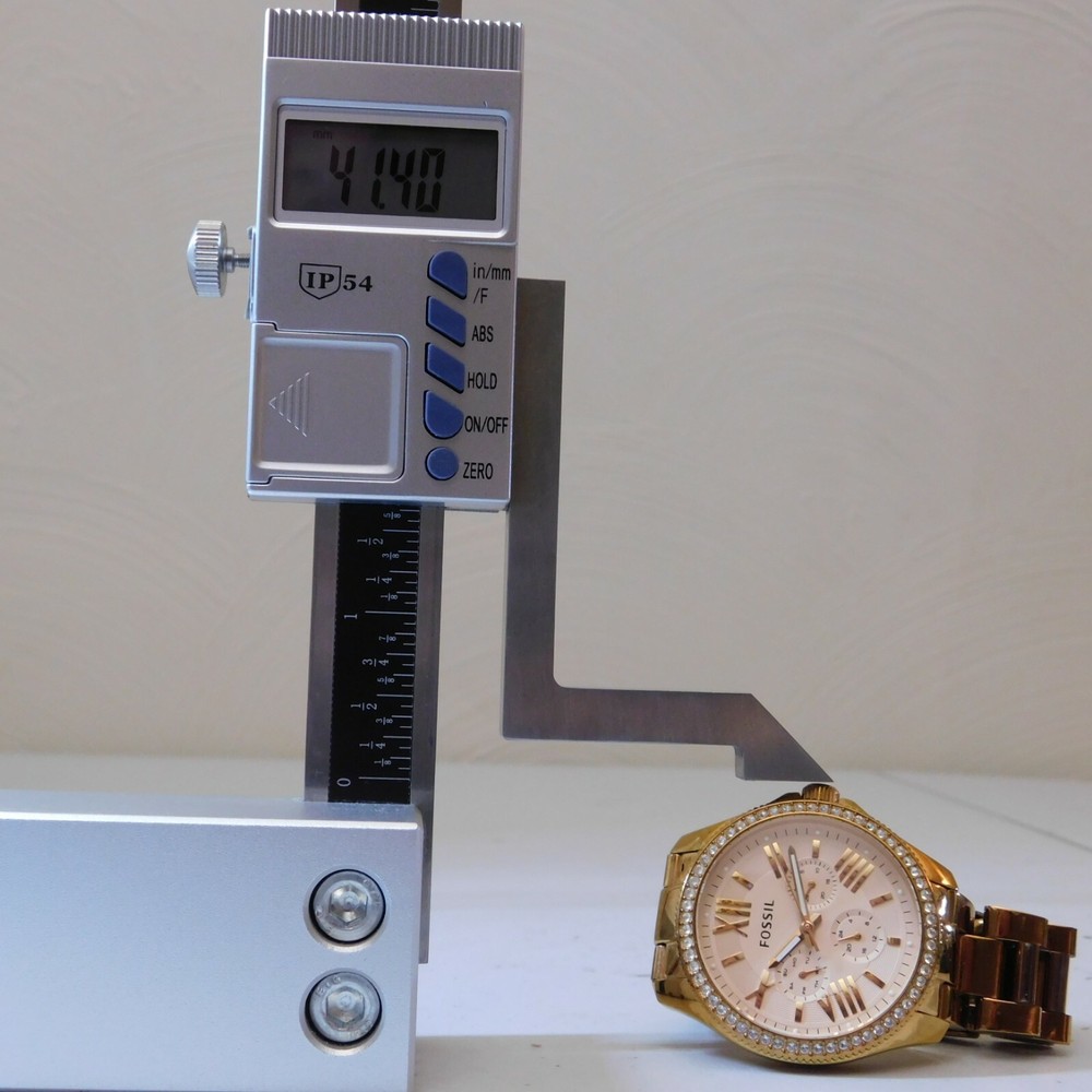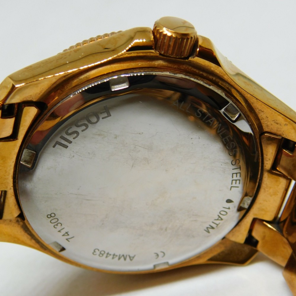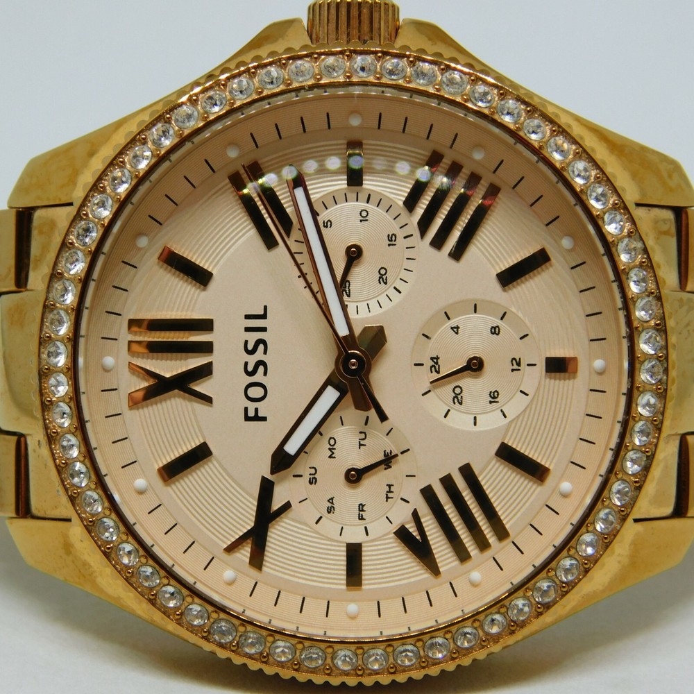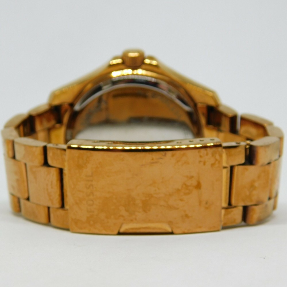 This listing is for a diamond Fossil watch in rose gold. Fits a 6" wrist. Adjustable at a local Fossil location. It is used and works perfectly. (Battery might be dead now.) There are a few scratches on the face and has scuffs and fading on the band. All diamonds on the watch are intact. + + + + + + + + + + Please view photos and read details thoroughly before bidding. Payment must be made within three (3) days after winning the auction. Item will be shipped one (1) business day after payment is received via USPS. Returns not accepted due to the unique nature of all my products.