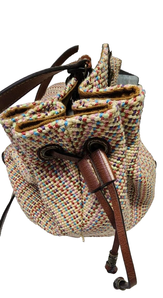 This Fossil satchel bag can be used as a purse tote or cross-body bag Retro sytle with plenty of room to carry your essential items Width 11 inches Height 9 inches Depth of 5 inches. The bag features double wood handles and a detachable leather strap with a 22-inch drop. Multicolor woven pattern The canvas fabric, leather lining, and metal clasp closure provide durability and security. The interior is lined with pockets and an audio pocket to keep you organized. Like New Personal Inventory Used it for a few months after purchasing as NWT. Prefer a full shoulder strap. Personal Inventory purchased NWT last year and used for about 6 months. Time for new home