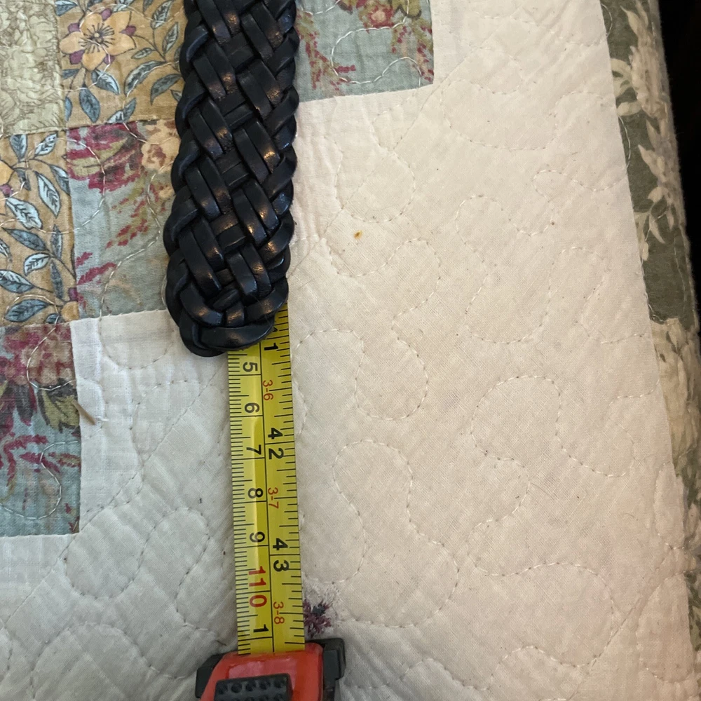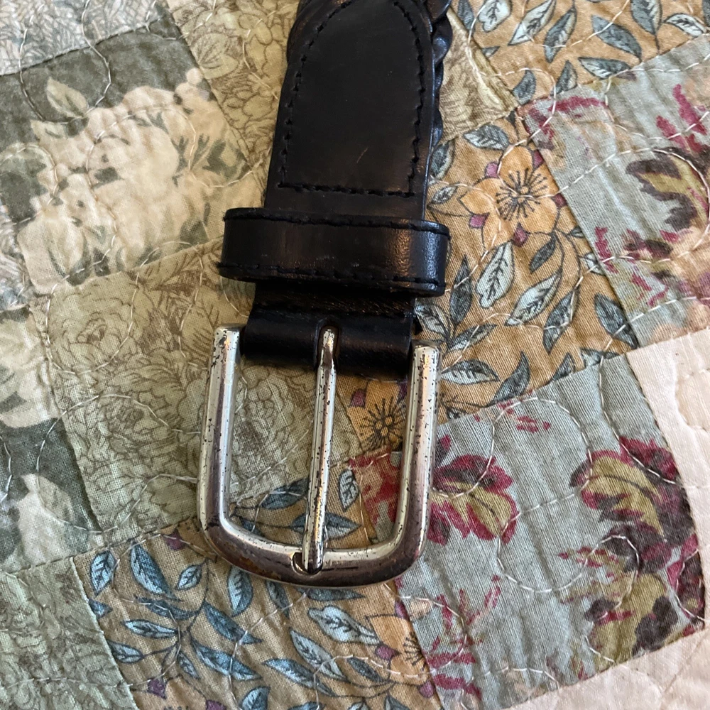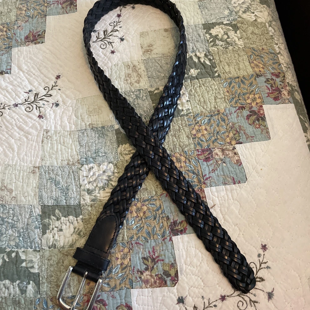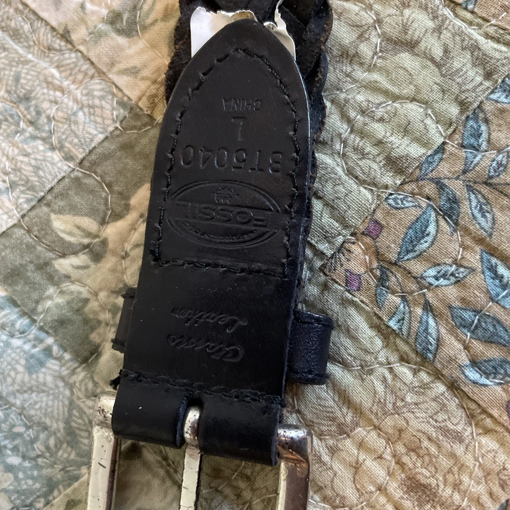 Accents: Buckle, Button Theme: Dad Color: Black Features: Buckle Size Type: Regular Pattern: Solid Handmade: No Country/Region of Manufacture: China Vintage: Yes Personalize: No Hardware Material: Brass Size: L Style: Braided/Woven Belt Material: Leather, Brass Belt Width: 2” Type: Belt Department: Men Brand: Fossil