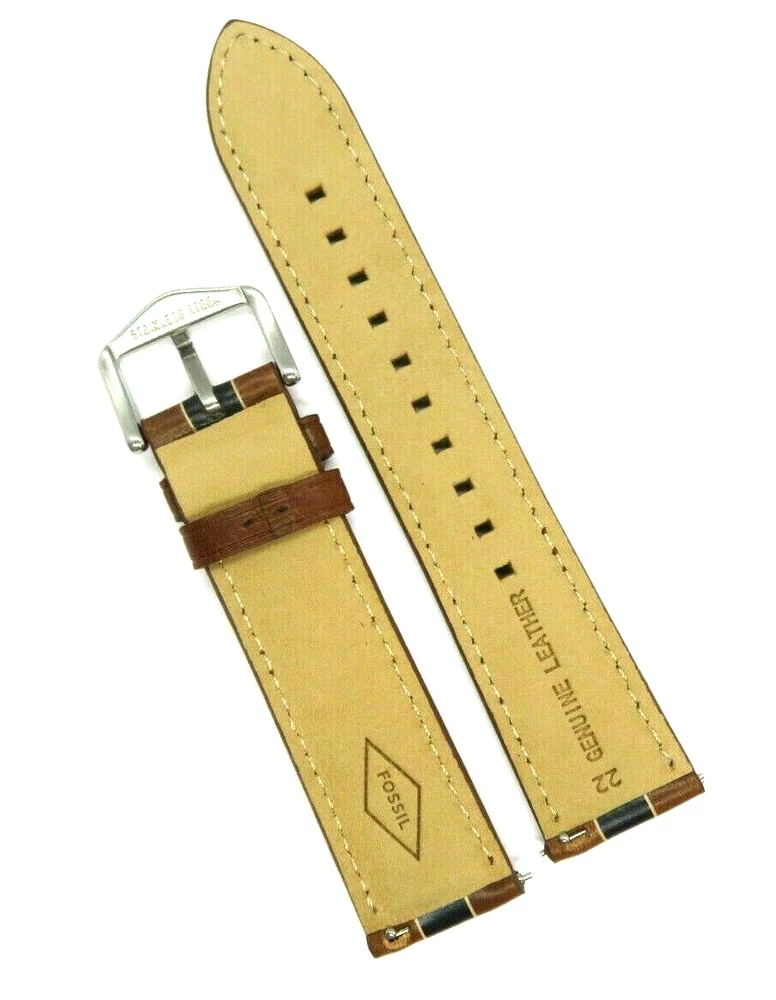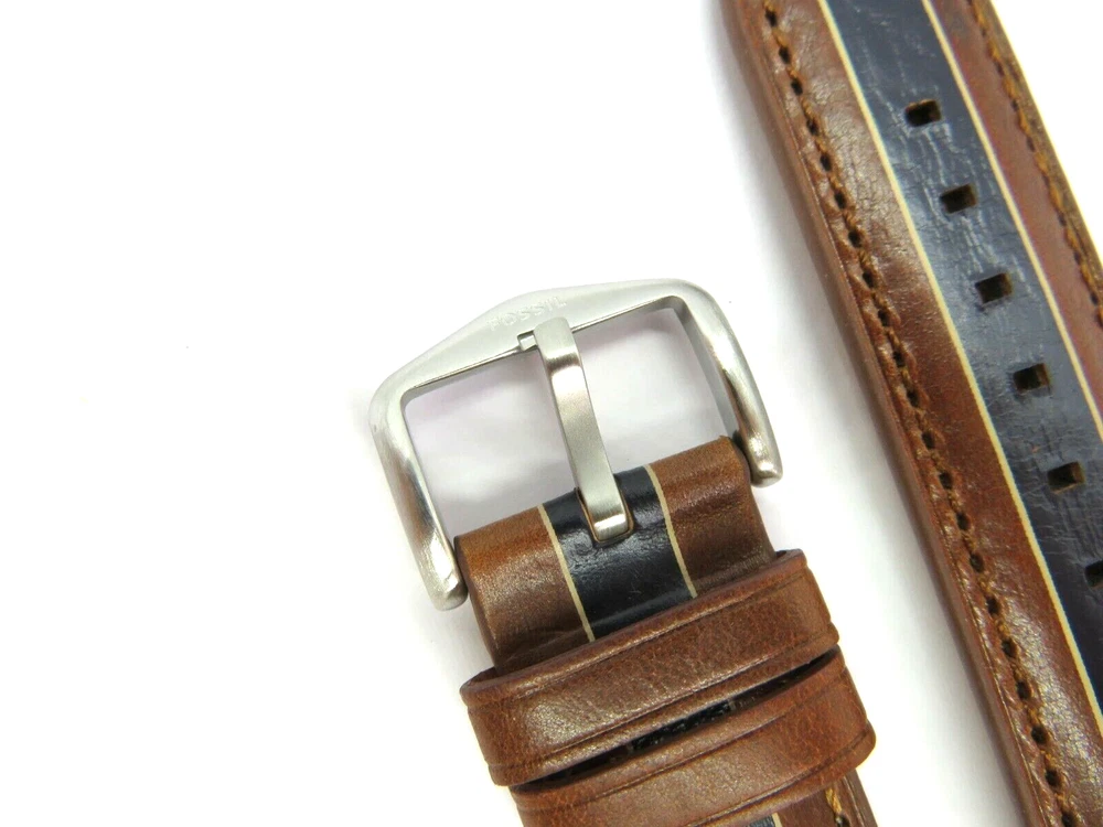 Watch strap original FOSSIL Also fits other watches with a 22mm strap attachment. FOSSIL: Model FS5550 Material: Leather Color: Braun with blue central stripe Mass 1-Bridge width 22 mm 2-Band length closure side 90 mm 3-Band length hole side 120 mm Clasp: stainless steel pin buckle matt silver Scope of delivery: band with two spring bars, quick replace Watch strap original FOSSIL Also fits other watches with a 22mm strap attachment. FOSSIL: Model FS5550 Material: Leather Color: Braun with blue central stripe Mass 1-Bridge width 22 mm 2-Band length closure side 90 mm 3-Band length hole side 120 mm Clasp: stainless steel pin buckle matt silver Scope of delivery: band with two spring bars, quick replace