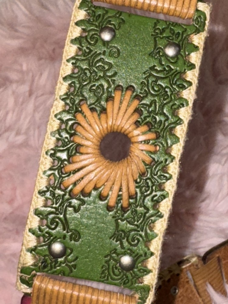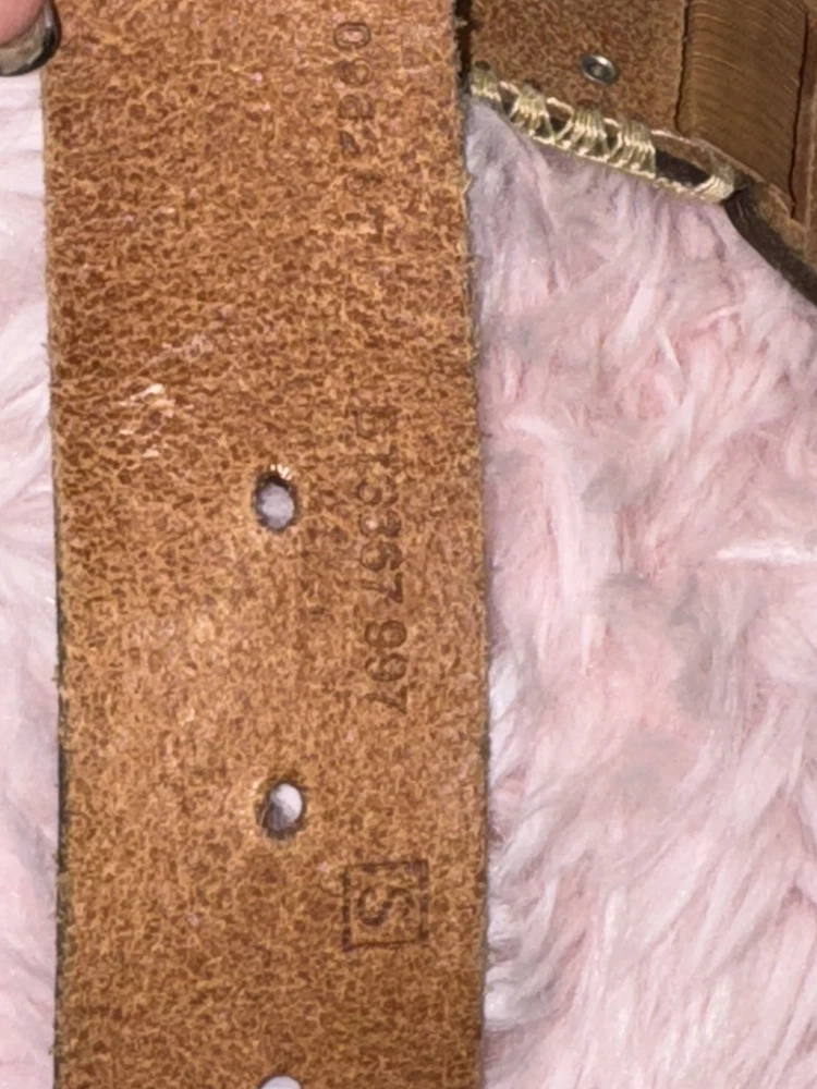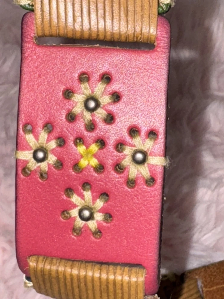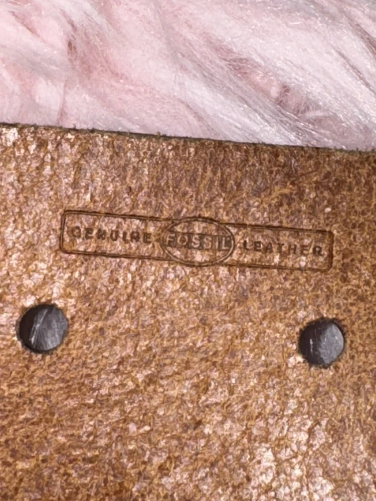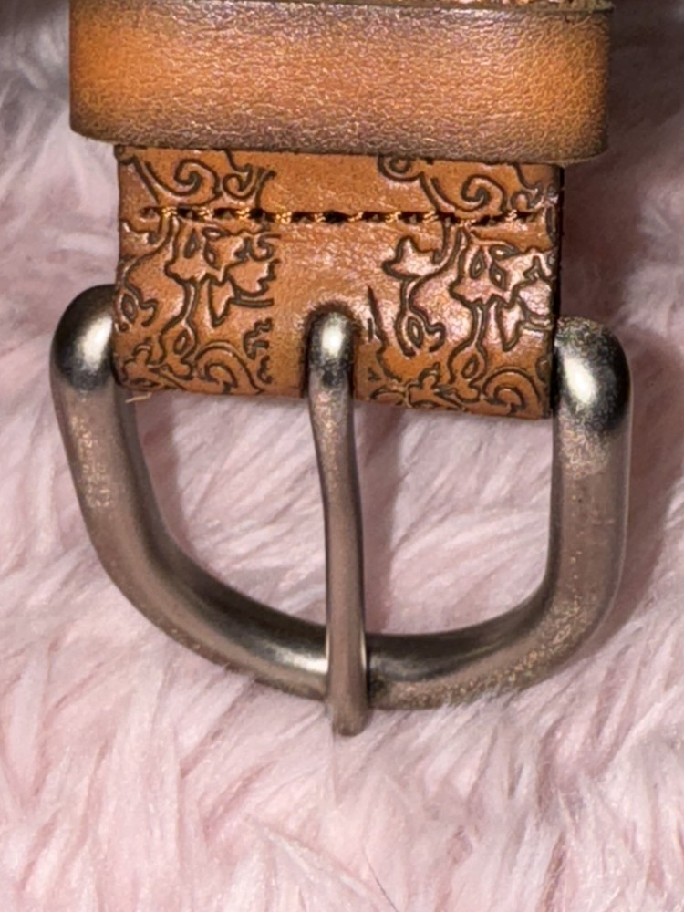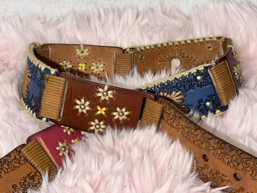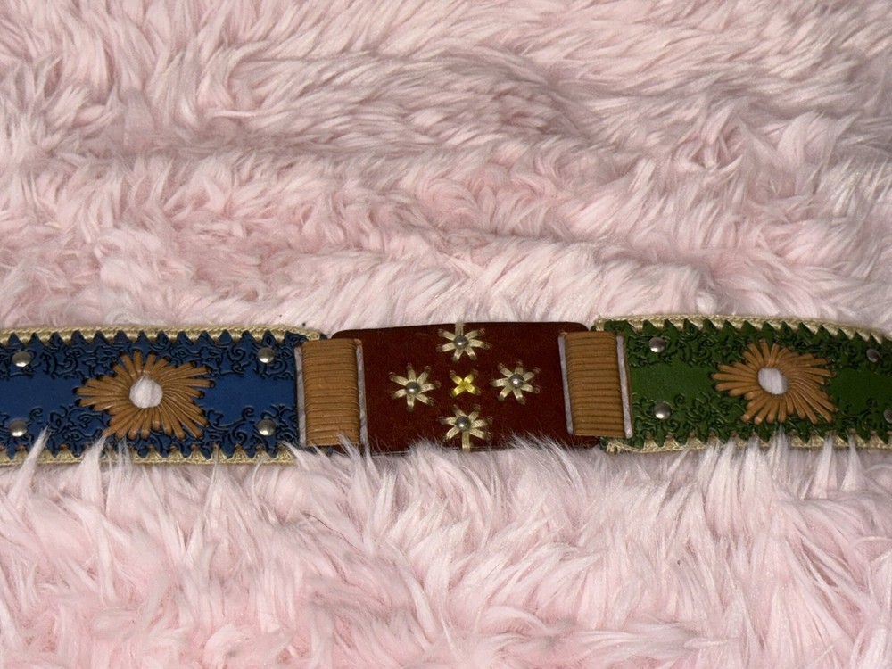 This Fossil Patchwork Leather Belt is a stylish accessory for women with a boho-inspired design. The multicolor floral pattern adds a touch of nature and personality to any outfit. Made from leather and featuring a normal belt width, this adjustable belt is perfect for a size small waist. The metal hardware material and boho theme make it a versatile piece that can add a pop of color and flair to your wardrobe. Perfect for adding a unique and trendy touch to your ensemble. MEASUREMENTS LEATHER IS 37” long. TOTAL LENGTH IS 39” which includes the metal buckle. Belt is in excellent condition.