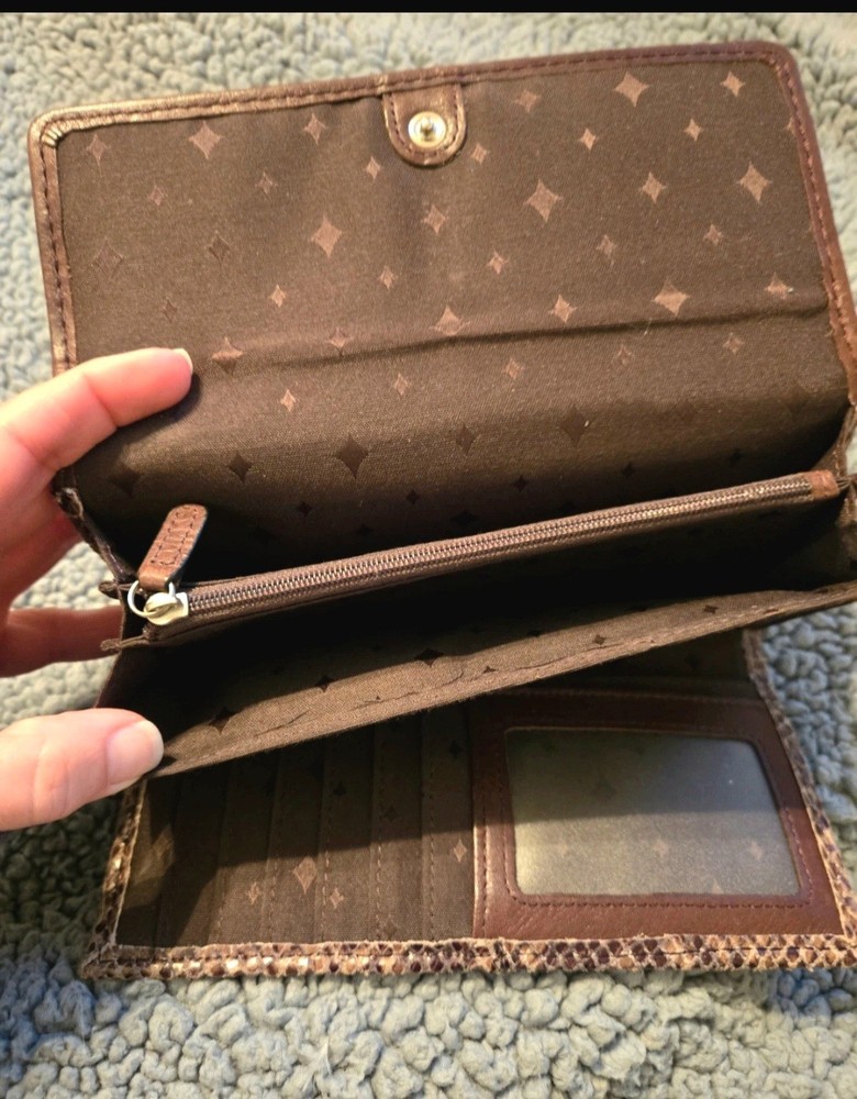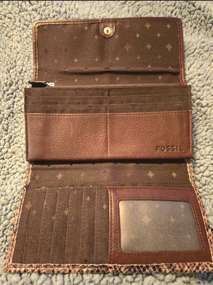 Handmade: No Color: Brown Type: Wallet Department: Women Personalize: No Accents: Logo Material: Leather Theme: Snake Character: Snakeskin Brand: Fossil Features: Credit Card Pattern: Animal Print Vintage: No