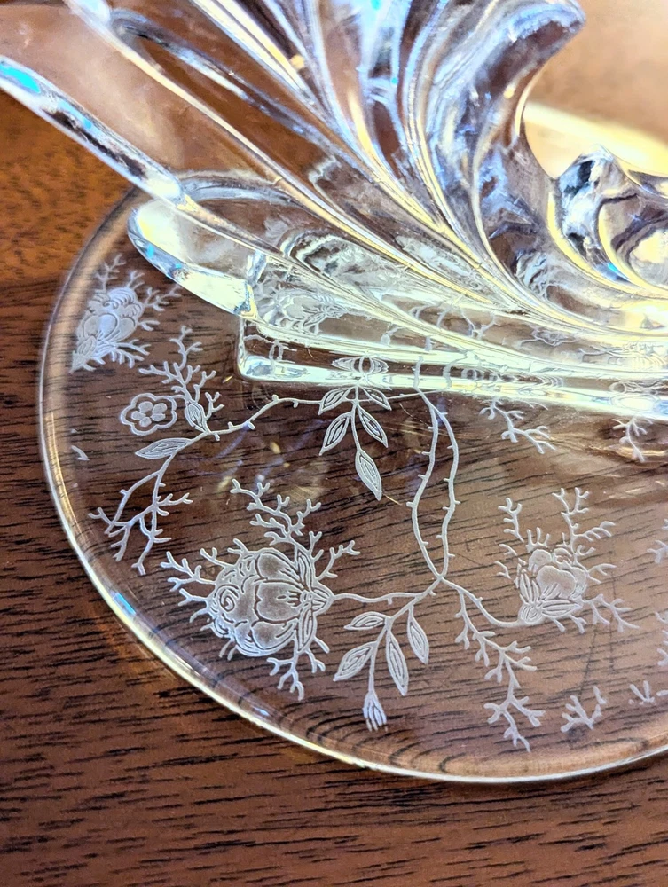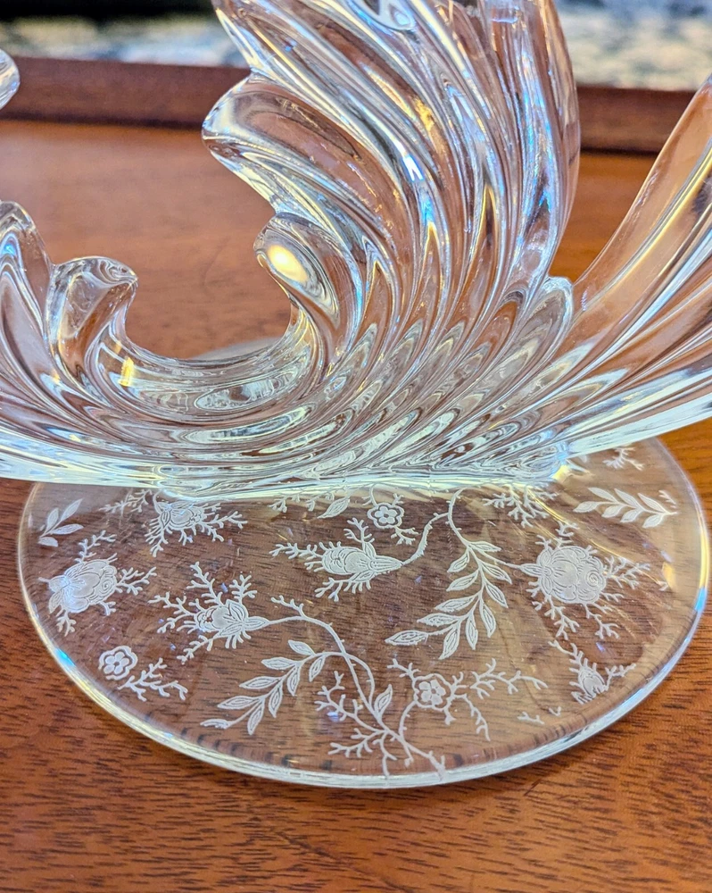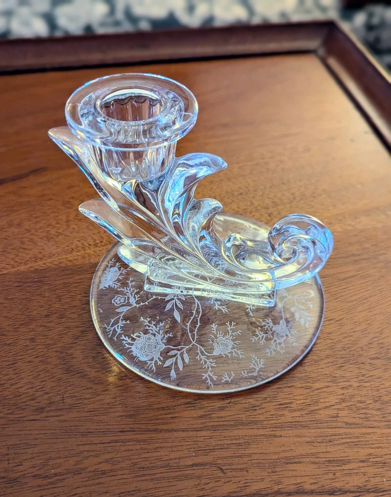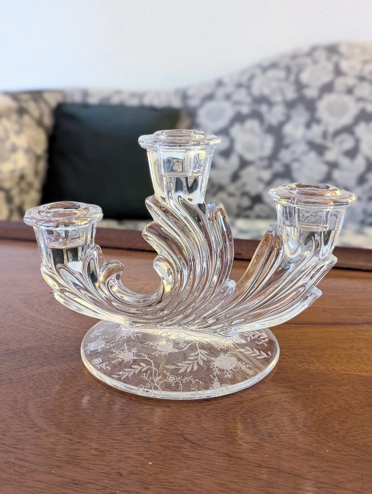 This Fostoria Baroque Etched Chintz Trindle Candle Candlestick Holder Candelabra and Cornucopia Candle Holder set are stunning vintage pieces made of clear crystal glass with elegant etched details. The Fostoria brand is known for its high-quality glassware, and this set is a perfect example with its craftsmanship and beauty. Ideal for adding a touch of vintage charm to your decor or for special occasions. Beautiful and flawless previously owned, likenew condition with no chips, cracks, scratches or discoloration.