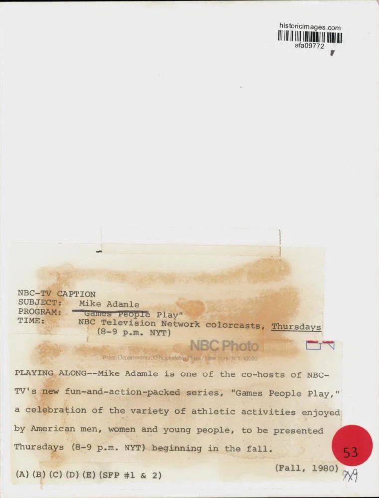 ebay template Note: Please study the images carefully to determine the condition of this vintage photograph, as it may not be in perfect condition. It may contain wrinkles, cracks, and possibly even tears due to its age and how it was handled before it got to us. A scanner may interpret colors and contrast differently than human eyes will, so it is possible that the actual photograph may be slightly darker or lighter in person. This vintage photograph is offered for sale as a collectible item and conveys no transfer of copyright. 1980 Press Photo "Games People Play" NBC-TV Series Host Mike Adamle - afa09772 This is an original press photo. Playing Along--Mike Adamle is one of the co-hosts of NBC-TV's new fun-and-action-packed series, "Games People Play," a celebration of the variety of athletic activities enjoyed by American men, women and young people, to be presented Thursdays beginning in the fall.Photo measures 7 x 9inches. Photo is dated --1980. PHOTO FRONT PHOTO BACK Historic Images Part Number: afa09772 FAQs Q: Can I just download a digital version instead? A: No, we sell only vintage originals and do not make or distribute any copies, including digital ones. Q: Do you combine shipping and invoices? A: Multiple photos won on the same seller ID combine automatically through the eBay checkout process. If you encounter problems with this, send us a message via eBay messaging and we will send you an invoice. Due to eBay limitations, we cannot combine items won on our different seller IDs for a single shipping charge. Q: How quickly do you ship the items once paid? A: We ship within one business day after your payment clears. If you do not receive an "order shipped" email from us by the close of the second business day from submitting payment, please e-mail us via eBay messaging. Q: How do you make sure my photograph arrives safely? A: We package each order between two cross-corrugated pieces of cardboard to ensure that the package is as difficult to bend as possible. We then wrap each order in a plastic sheet to help protect against moisture. We want you to rest assured that we take every precaution to ensure that the photograph you receive will be in the same condition in your care as it was in ours. Q: Will the "Historic Images" watermark be on my photo when I receive it? A: No. This is a digital watermark we use to protect our images. It is not printed on the photo. Q: What are your office hours? A: eBay for us is a business, and a very fun one to be in! We are open M-F 9 to 5 (CST). Therefore, we do not return e-mails and phone calls over the weekend. We observe the following holidays: New Years Day, Memorial Day, Fourth of July, Labor Day, Thanksgiving and the day after Thanksgiving, Christmas Eve and Christmas Day. Q: Where did all these vintage photos come from? A: These original vintage photographs are from various news service and newspaper photo archives from locations around the country including: Boston, Detroit, Tampa, Chicago, Denver, Seattle, New Orleans, Milwaukee, Portland, Spokane, and more. We do not copy or reproduce any photographs -- every item is a unique vintage piece that was housed in a news archive. Q: Can I use this photograph in my book/blog/website? A: The short answer is no. There is no transfer of copyright for republication or reproduction with these photographs when you purchase them, and only photographs taken before 1923 are currently automatically in the public domain. Permission from the copyright holder, which usually can be identified from the back of each photo, must be sought to republish or reproduce the image for any purpose. Q: Do you relist items (in case I miss an auction ending)? A: Auction items that receive no bids are relisted in our store (historicimages-store on eBay) as a fixed-price item and at a higher price than the starting auction price. Q: Do you leave feedback? A: Yes, we always leave feedback for buyers. Our software monitors when our buyers leave us feedback, then notifies us that we can leave feedback for the buyer. Rest assured, if you leave feedback, we will do the same! Check out our family of eBay IDs: historicimages01 Sports Photos historicimages02 Entertainment Photos historicimages03 Americana Photos historicimages04 International & War Photos historicimages05 Transportation Photos historicimages06 Photos of All Subjects historicimages07 Entertainment Photos historicimages08 Newsworthy Photos historicimages09 Entertainment Photos historicimages10 Sports Photos historicimages-store Our largest fixed-price selection historicimages-gallery Hand-picked photos Saturday night auctions About Us Historic Images was formed in September 2009, with a handful of scanners working out of a basement to digitize newspaper photo archives. We have since moved out of the basement, and we can now archive thousands of photos per day. Our company has worked with magazines and newspapers from Detroit, Boston, Denver, Seattle, Tampa, Chicago, and New Orleans, just to name a few. We are constantly adding to our inventory, and have assembled an archive of millions of photos to date. As our company evolved, we began our eBay business, which brings thousands of fresh auctions per week to the world's largest online auction marketplace. Our custom software systems and team of great employees allow us to efficiently scan and sell large photo archives online. At the very core of our company's DNA is a strong commitment to customer satisfaction and strict integrity for our product. Our promise to you is that we will do everything in our power to provide you a great buying experience. Copyright 2009 - Present, Historic Images, Inc. Sell Smarter with Kyozou. Inventory and Ecommerce Management