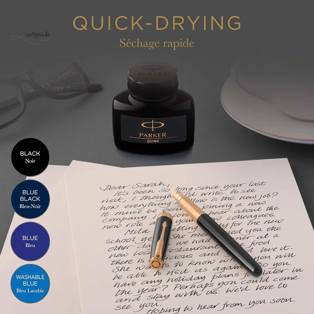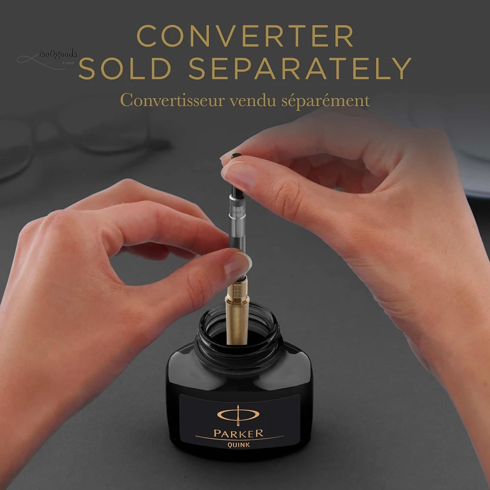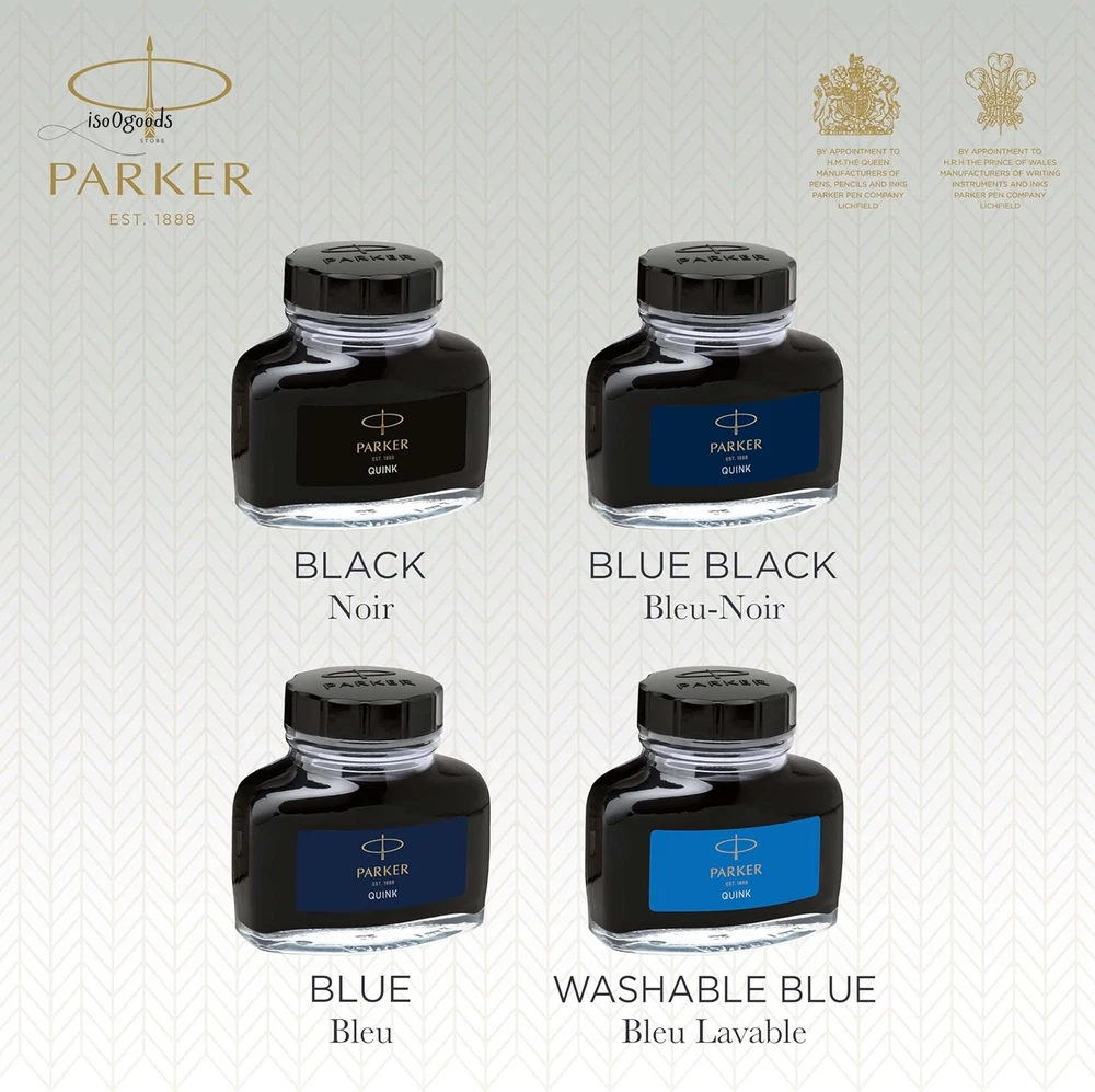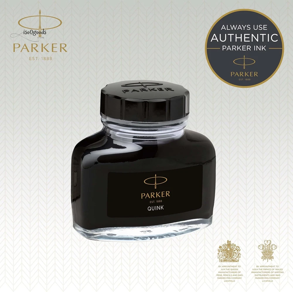 Parker Black Ink bottle Ink refill for PARKER fountain pens and other luxury fountain pens High-quality bottled ink with added lubricity for a smooth flow when putting pen to paper Quick-drying, richly pigmented ink makes a vivid impression on the page Elegant glass bottle with wide base and tight-sealing screw-top lid Includes one 50 ml bottle of black ink. Use together with PARKER converter (to be purchased separately) Rediscover classic writing pleasure with PARKER QUINK bottled ink. Filled with smooth, rich and vivid black ink, you'll enjoy the timeless ritual of bottle filling when you use your fountain pen. With PARKER fountain pen ink, you can place your thoughts on paper with the authenticity of liquid ink.