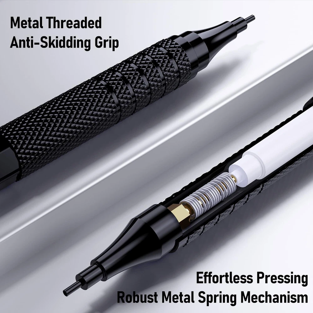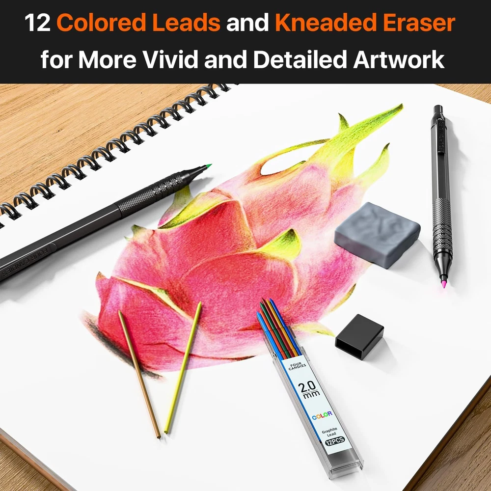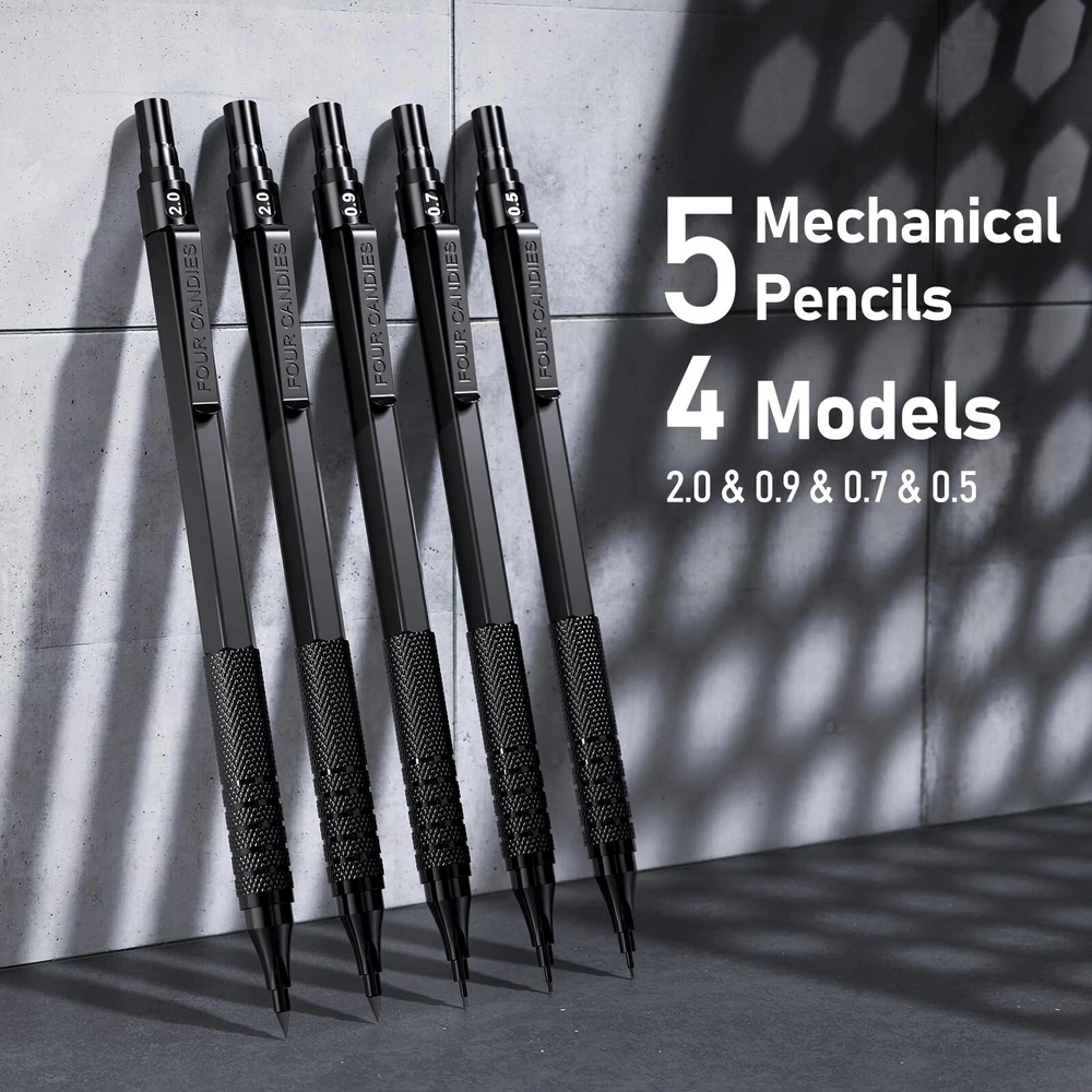 A metal mechanical pencil set that contains a variety of accessories. The pencils are available in 4 models: 0.5, 0.7, 0.9 and 2.0 mm. There are also various types of lead cores, as well as accessories such as erasers and lead sharpeners. With this set of products, you can do whatever you want. Choose the tools you need to write and draw freely. [Advanced Pencil Set] Includes 5 full body metal mechanical pencils, 4 models (0.5mm, 0.7mm, 0.9mm & 2pcs 2.0mm) and 6 tubes of 0.5, 0.7, 0.9mm resin leads, 5 tubes of 2.0mm graphite leads , 2pcs lead sharpeners, 2pcs 4B-soft erasers, 1 kneaded eraser, 1 tube eraser refills (9pcs / tube) [More Leads, Multiple Models & Hardness] The drawing pencil set includes 420PCS lead refills. Each variant of 0.5mm, 0.7mm, and 0.9mm resin leads comes in 2 tubes (60 pcs/tube), offering a smooth and sturdy writing experience, ideal for drafting with varied line thicknesses. The 2.0mm graphite leads are available in 5 tubes (4B, 2B, HB, 2H, and one tube of colored leads, 12 pcs/tube), perfect for sketching with different hardness in the art work. [High-Quality Metal Pencil] The all-metal body design provides an ideal weight balance for fatigue-free writing and drawing, and the metal threaded pencil grip enhances friction to prevent slipping during use. The internal metal spring and brass three-claw design provide a buffering effect on the lead core, greatly reducing the possibility of lead sticking and slipping. [Functional Design] The caps for the 0.5mm, 0.7mm, and 0.9mm drafting pencils come equipped with eraser refills, ensuring accurate erasure of handwriting. The caps of the 2.0mm sketching pencil feature a lead sharpener design, allowing you to sharpen the pencil lead at any time. [Ideal Drawing Pencil] An art mechanical pencil set specially designed for artists, teachers and students. Great for writing, drafting, drawing, sketching. If you have any questions, please contact us in time, we will give you a satisfactory answer within 24 hours.