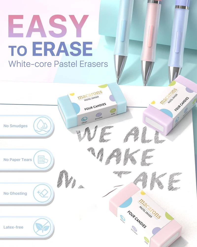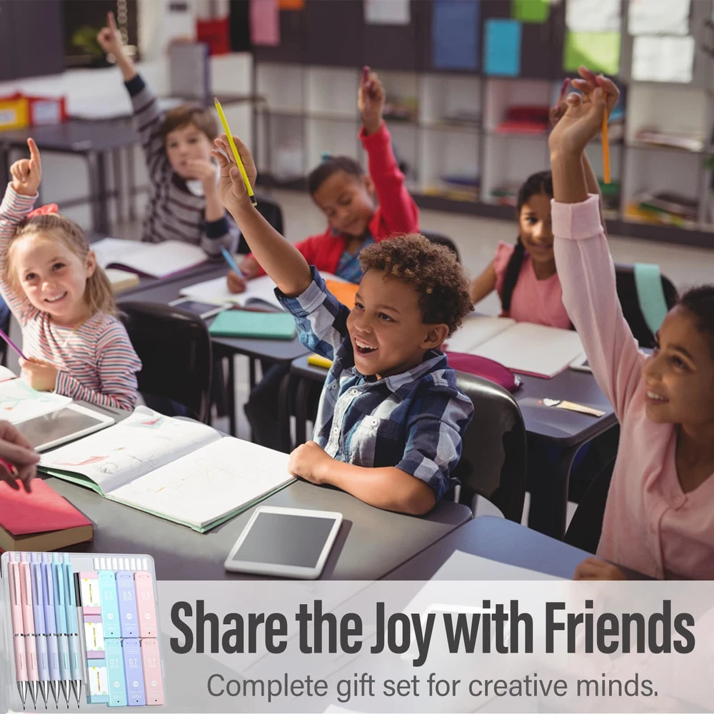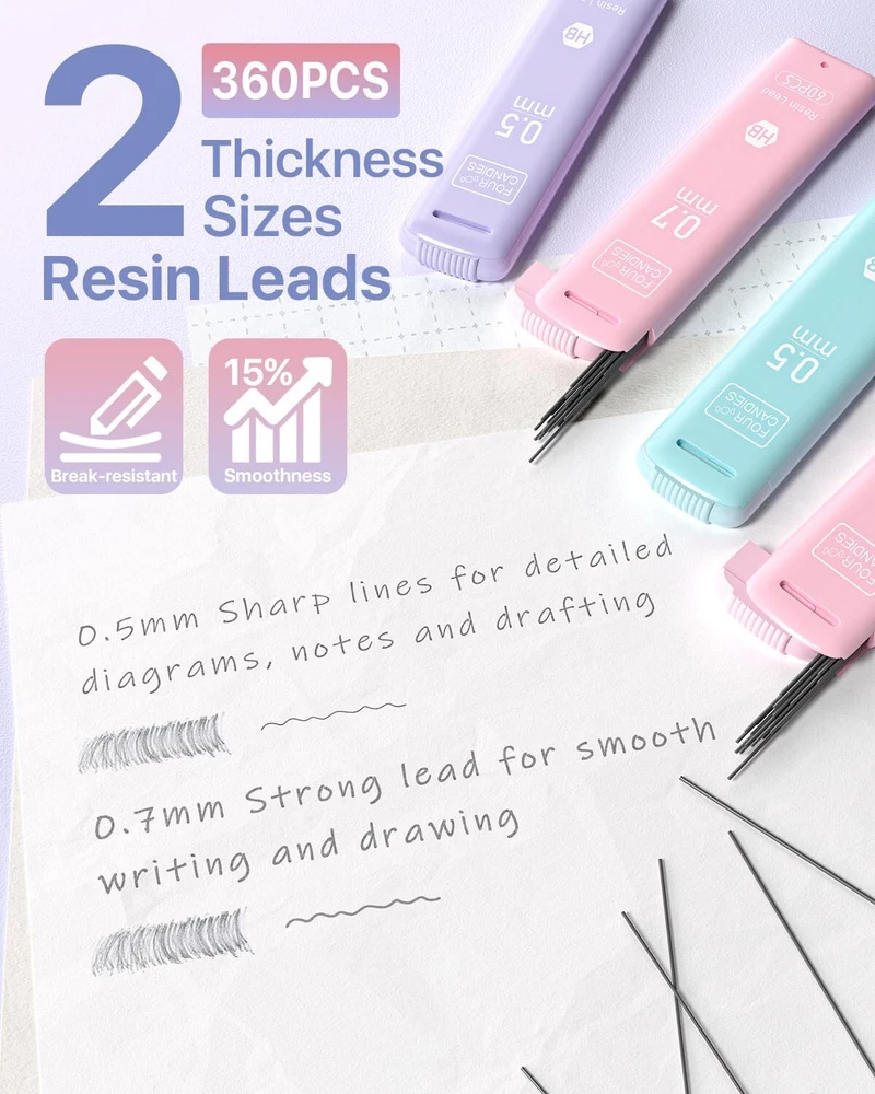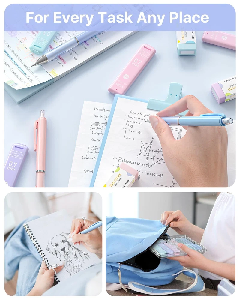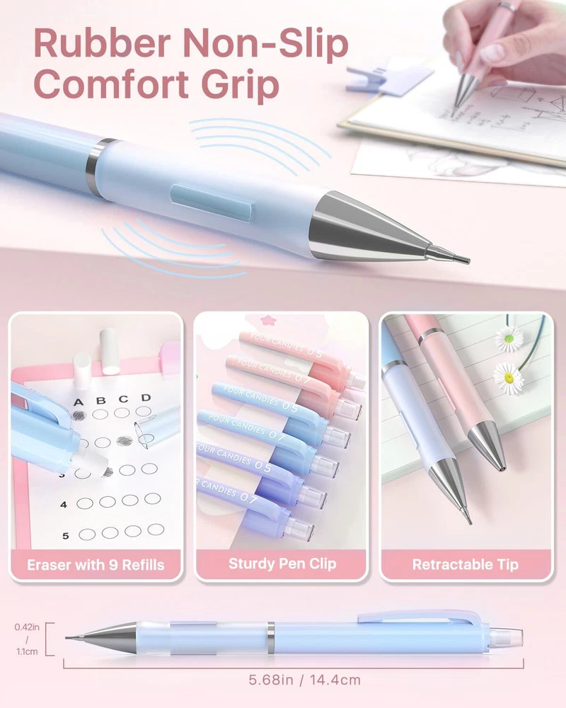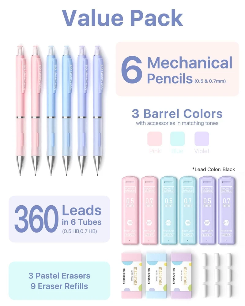 Value Pack: Contains 6 cute mechanical pencils, a bulk supply of 360 leads in 6 tubes, 3 pastel erasers, and 9 additional eraser refills Every Detail Matters: Features a non-slip rubber grip for comfort, built-in eraser with refills, sturdy pen clip, and a pocket-safe retractable tip Sweet Pastel Touch: Enjoy pencils in candy-like pink, purple, and blue, each with a touch of sweetness; Comes with matched accessories for a cohesive look which are loved by girls Resin Lead Advantages: Resin increases strength for less breakage, facilitates smooth and fatigue-free writing, ensures uniform lines and darkness, and reduces debris for a cleaner workspace 0.5 mm, 0.7 mm Lead for All Tasks: 0.5 mm offers sharp lines for technical details, while 0.7 mm suits everyday writing and drawing; Both ensure smooth, clear lines that erase easily and never require sharpening Smooth Erasing: This trio of pastel erasers makes removing marks easy; No smudges, no tears, and no ghosting; They’re also free from latex, ideal for all users Tough and Reliable: Constructed from high-strength ABS, this pen withstands daily wear and tear and provides significant impact resistance, making it a solid choice for everyday writing All-in-One Set: Ideal as a gift; Includes a convenient case for easy storage and portability, great for school assignments and professional projects; For any issues, our friendly customer service is here to help
