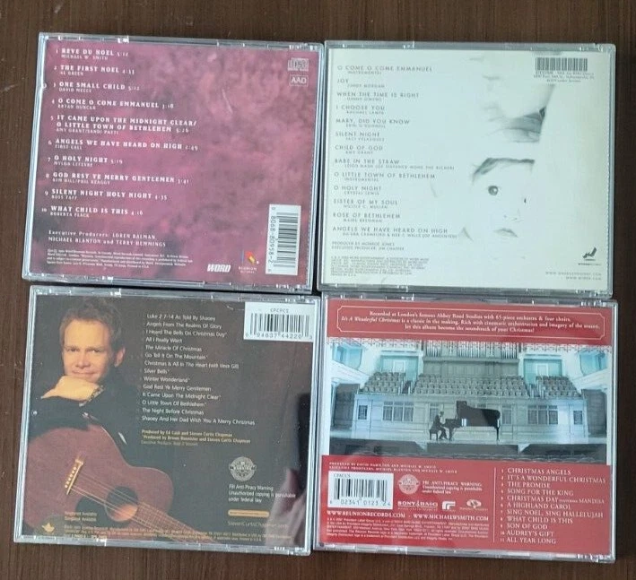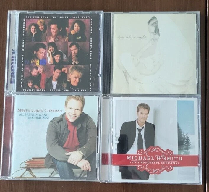 Four Christmas CDs including One Silent Night - Various Artists Our Christmas - Various Artists including Amy Grant, Roberta Flack, Al Green, Miichael W Smith, etc. One Silent Night - Various Artists All I Really Want for Christmas - Steven Curtis Chapman It's a Wonderful Christmas - Michael W. Smith 93-year-old selling her collection. Returns accepted if returned in same condition as was received. If purchasing more than one of my listings at the same time, I will ship all items together and issue you a partial refund for the difference in shipping cost paid and the actual shipping cost.
