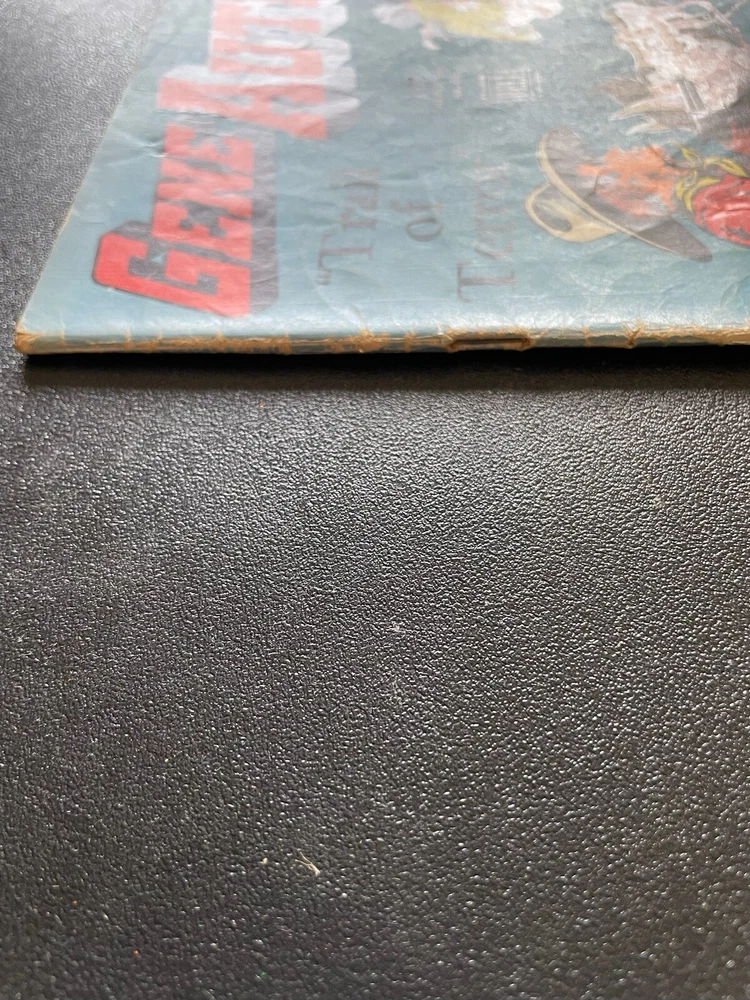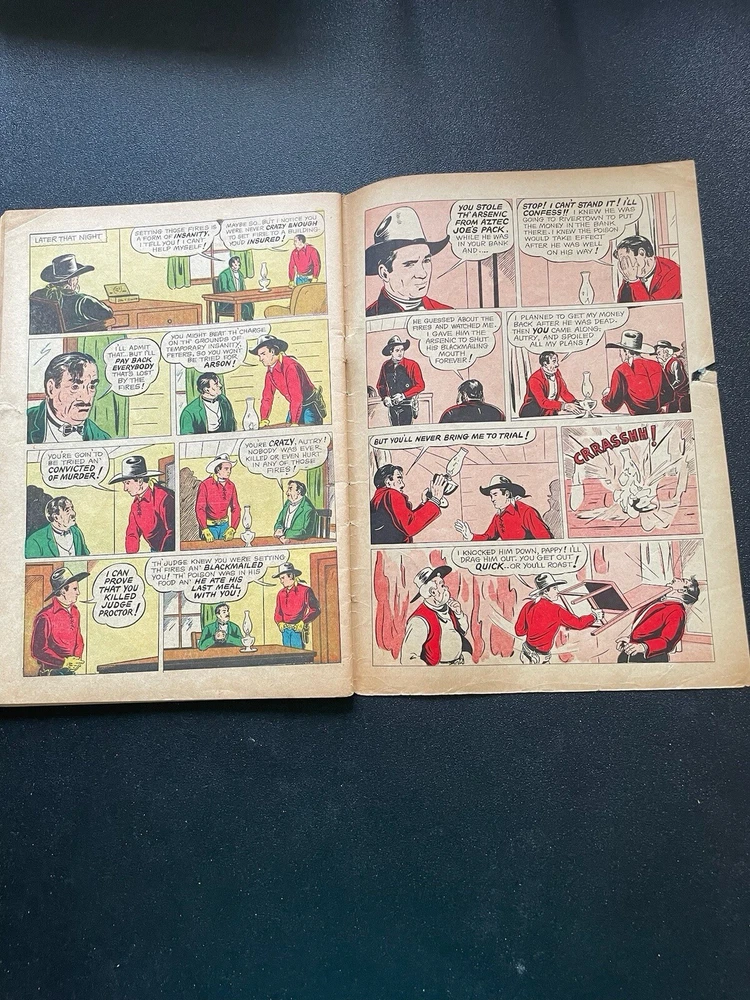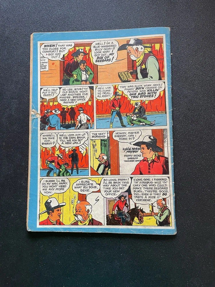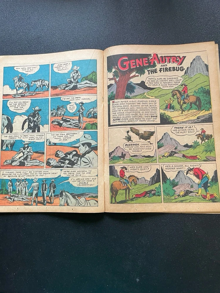 cover complete, dull cover, issue complete no pages or panels missing, corners rounded, creases on cover, spine intact with age appropriate wear, pages off white, minor tear last 4 or 5 pages on right hand margin does not interfere with story, rear cover minor tear left side in margin, feature two Gene Autry (the singing cowboy) stories begins inside front cover and ends inside rear cover, can be either collectible as a Four Color comic or a western comic collection Please observe photos carefully before ordering