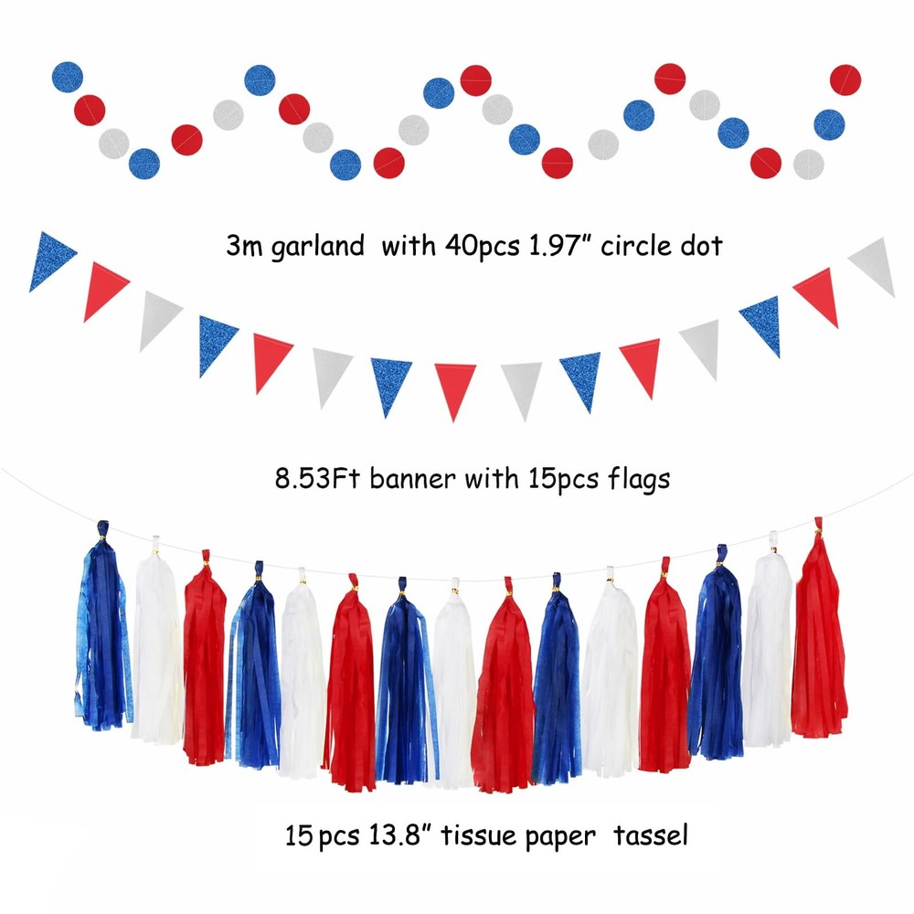 Unique Design:Unique color mix and match party decorations will make your party more vibrant and gorgeous. This design is suitable for most themed parties to create a better atmosphere. Package Including:The red blue white silver party decorations 1pcs paper garland dots,1pcs Triangle Flags in four color,15pcs tassel garland in three color,2pcs honeycomb,6pcs streamers,2pcs 10” tissue pom poms in two color,1pcs 12” tissue pom poms,2pcs 12”paper lantern fan,1pcs 16”paper lantern fan. Suitable Occasion:They are perfect for Independence Day party,4th of July decorations,American patriotic party decor,graduation supplies,red white and blue decorations,baby shower,birthday party,veterans day decorations,president day decorations. Premium Material: The party decoration kit is made with high-quality materials and eco-friendly paper.You can mix and match according to your need. Guaranteed Service:We strive to provide you with the best quality. If you have any dissatisfaction with this purchase, please feel free to contact us,we will reply you within 24 hours and solve the problem as soon as possible. Unique Design:Unique color mix and match party decorations will make your party more vibrant and gorgeous. This design is suitable for most themed parties to create a better atmosphere. Package Including:The red blue white silver party decorations 1pcs paper garland dots,1pcs Triangle Flags in four color,15pcs tassel garland in three color,2pcs honeycomb,6pcs streamers,2pcs 10” tissue pom poms in two color,1pcs 12” tissue pom poms,2pcs 12”paper lantern fan,1pcs 16”paper lantern fan. Suitable Occasion:They are perfect for Independence Day party,4th of July decorations,American patriotic party decor,graduation supplies,red white and blue decorations,baby shower,birthday party,veterans day decorations,president day decorations. Premium Material: The party decoration kit is made with high-quality materials and eco-friendly paper.You can mix and match according to your need. Guaranteed Service:We strive to provide you with the best quality. If you have any dissatisfaction with this purchase, please feel free to contact us,we will reply you within 24 hours and solve the problem as soon as possible.