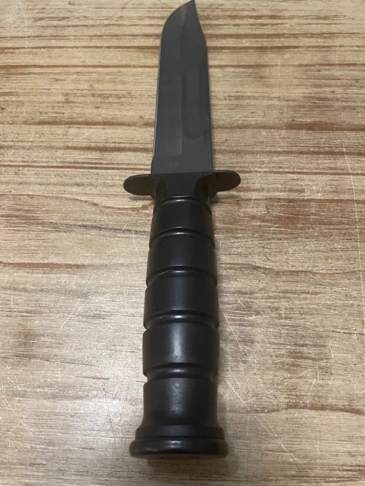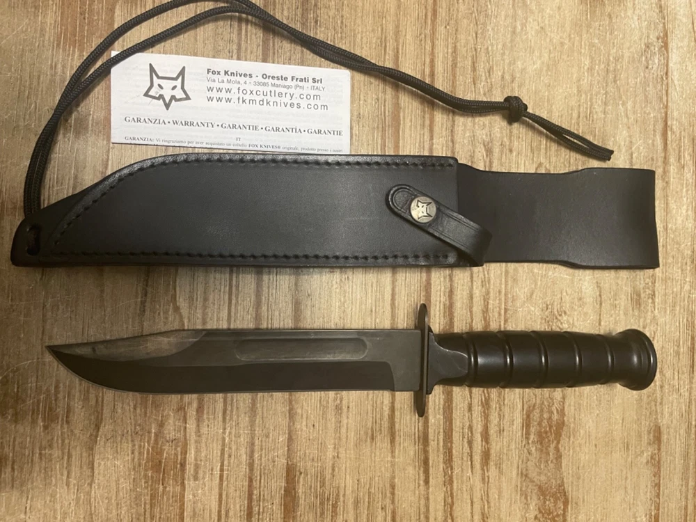 Fox Tactical Knives of Italy Fixed Blade Combat Knife, new in original shipping bag. This is a ‘Ka-Bar style’ fighting knife that features a 7.28” clip point blade made out of C-70 High Carbon Italian Steel. The handle is made of high strength, impact resistant ABS Polymer and is grooved for texture/ grip. This knife comes with a high quality leather sheath as well. Very robust knife. Model # 02-FX048. This would be an excellent knife for military deployment, self defense or as a great addition to a ‘bug out bag’.