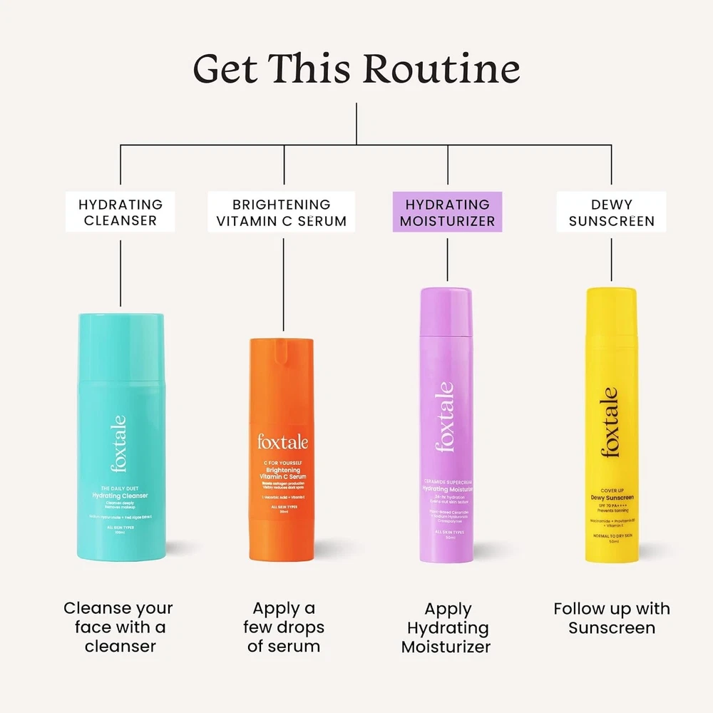 Product Description Foxtale Ceramide Supercream Enhance your Routine Step 1:Hydrating Cleanser Add to Cart Step 2: Vitamin C Add to Cart Step 3: Moisturizer Add to Cart Step 4: Dewy Sunscreen Add to Cart Customer Reviews 4.4 out of 5 stars 1,359 4.0 out of 5 stars 2,632 4.2 out of 5 stars 1,923 4.3 out of 5 stars 1,223 Price ₹279.00 ₹ 279 . 00 ₹476.00 ₹ 476 . 00 ₹356.00 ₹ 356 . 00 ₹476.00 ₹ 476 . 00 Helps with? Gives skin 2X more hydration Visibly brightens skin 24-hour moisturization Reducing spots & pigmentation Ingredients Sodium hyaluronate, Vitamin B5 15% L-Ascorbic Acid Sodium Hyaluronate, Vitamin E Niacinamide, Provitamin B5 When to use? Day and Night Daily, Morning & Night Routine Daily, Morning & Night Routine Daily, Reapply every 2-3 hours Suitable skin type All skin types All skin types All skin types Normal and dry skin Must use when? Remove Dirt and Makeup Evens out skin & reduces spots Boosts hydration Sun Tan, damage & Pigmentation What makes it unique? Why you'll love it Ingredients