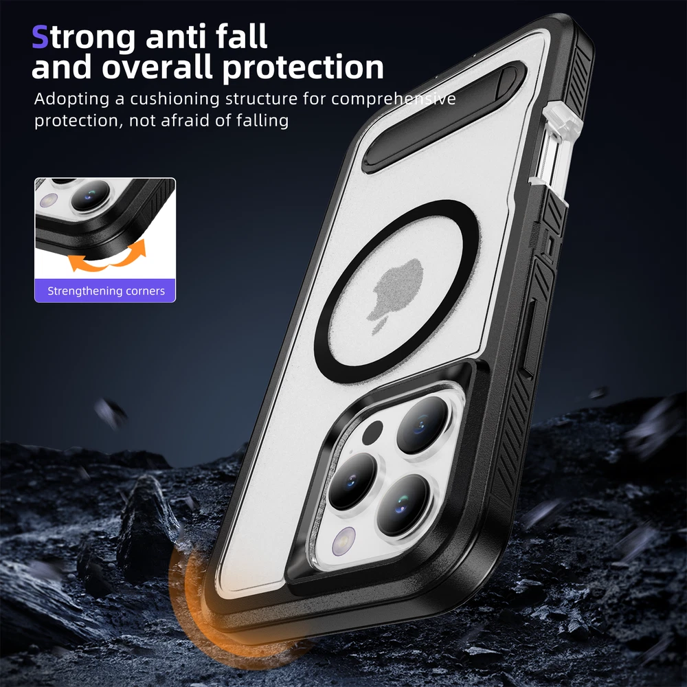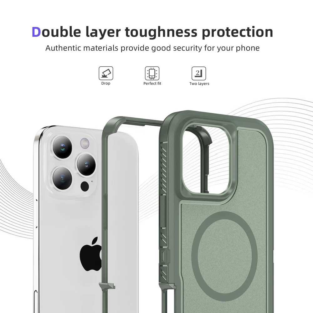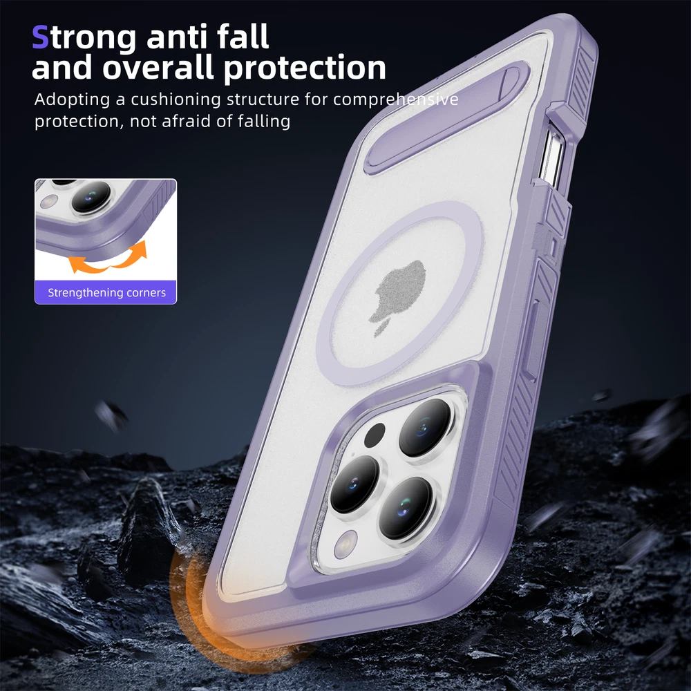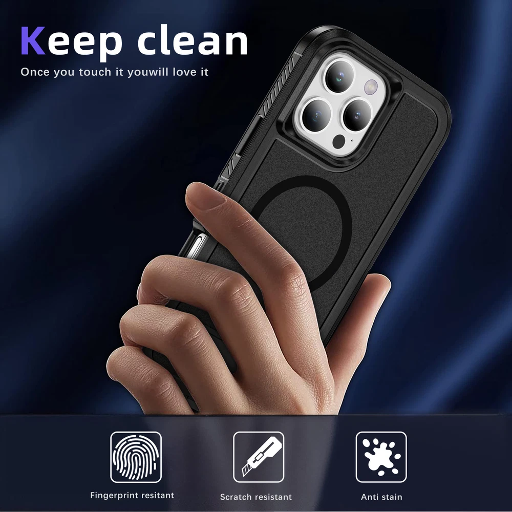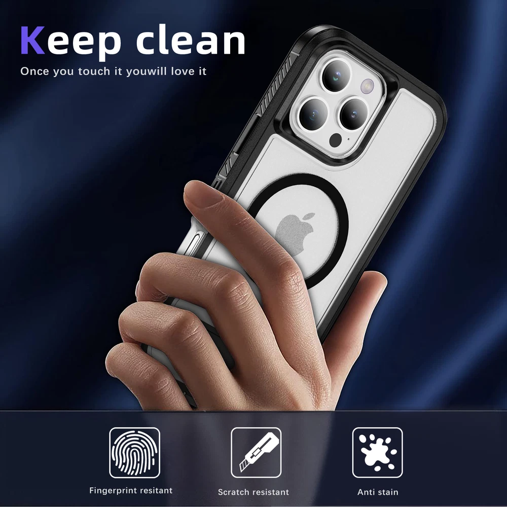Fr iPhone 16 Pro Max 15 14 13 11 Mag Safe Case Built-in Stand + Screen Protector Key Features: Military-Grade Drop Protection: Advanced shockproof technology on all four corners and a 3-ply cushioning TPU bumper provide superior protection.Raised bezels around the screen and camera offer extra defense against dust and scratches. Enhanced Magnetic Compatibility: Compatible with Mag Safe accessories including Magnetic wallets, Car Mounts, etc, this case aligns perfectly with Magnetic chargers for a secure connection and faster wireless charging. Built-in Hidden Kickstand: The phone case is built in a hidden stand, which can hold your phone up vertically or horizontally as you wish to release your hands. Whether you're watching TV shows or video-chatting, this case with stand offers the perfect viewing angle based on ergonomic considerations to ensure optimal viewing comfort. Package: 1* Case Cover (Phone Is not included!) 1* Screen Protector