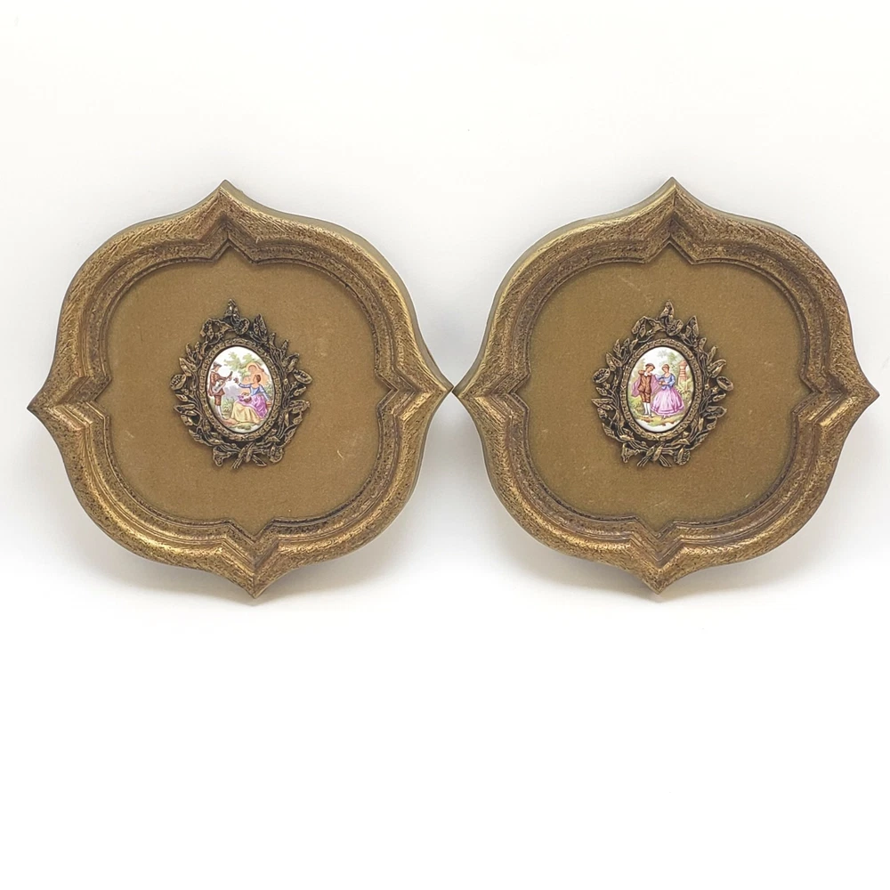 Vintage Porcelain Courting Couple Framed Medallion On Velvet. Lot of 2 both included Porcelain fragonard signed Courting Couple Medallions surrounded by ivy and floral setting. Backing is a light brown velvet and a gold tone plastic frame. Ready to be placed on a wall both are in very good condition with a couple of light scratches to the velvet. Porcelain Medallions measure 2" x 1 1/2" Overall measurements of frame is 9" x 9"