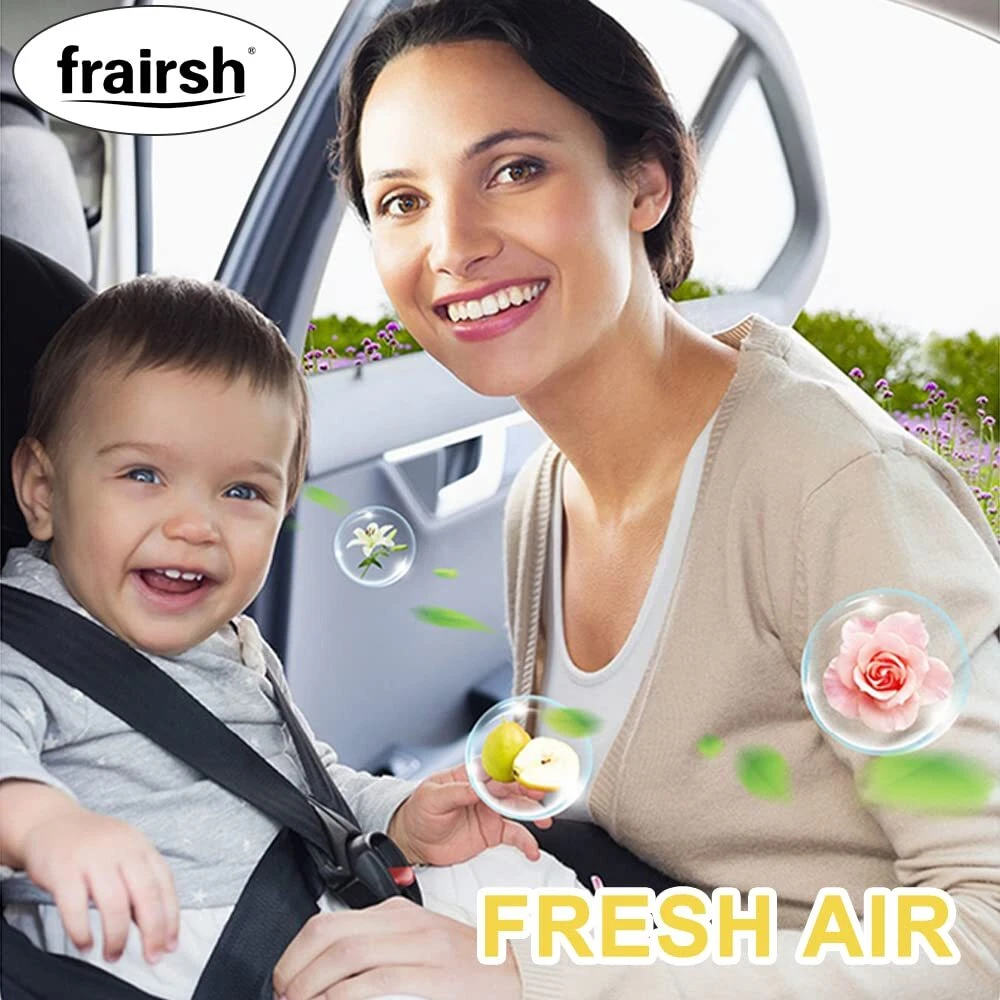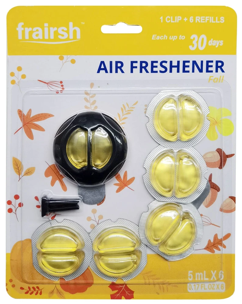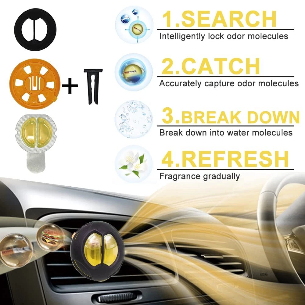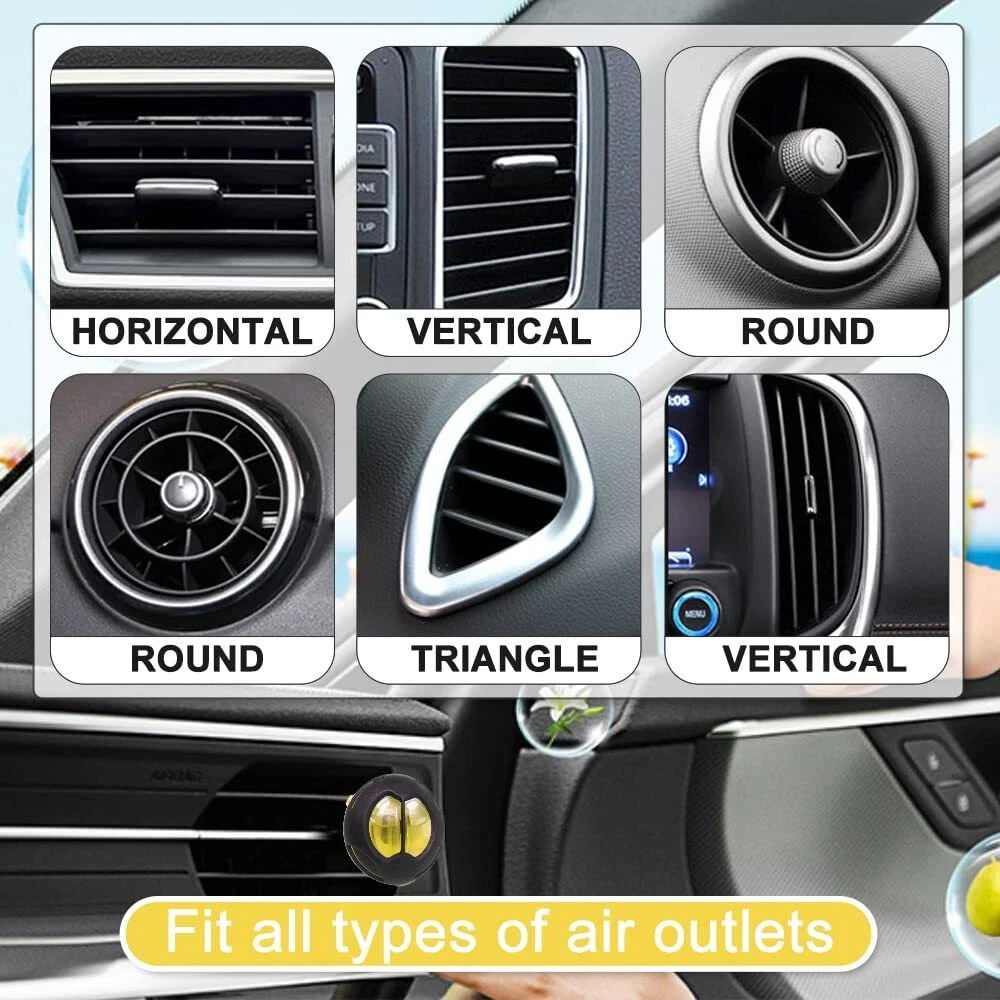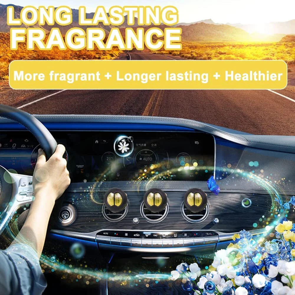 Car air fresheners remove odors and enjoy freshing trip, with four scents car fresheners for men and women. Easy car vent clip air freshener refill with essential oil car scent capsule. Less plastic waste. Each car air deodorizer lasts about 30 days. Adjustable fragrance strength for longer usage. Each car perfume air freshener contains 5ml essential oil. It appears not full as we use large container. Car scents fragrance oil can cause damage to surfaces, wipe up spills immediately Universal Fit: fit any types of car, truck, air vent.