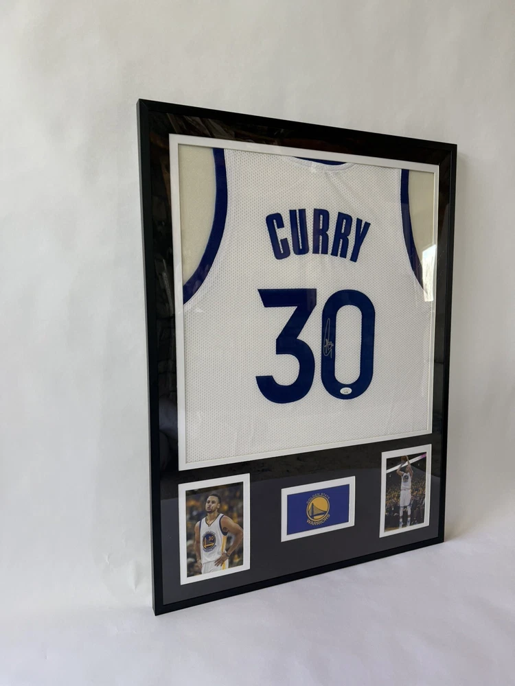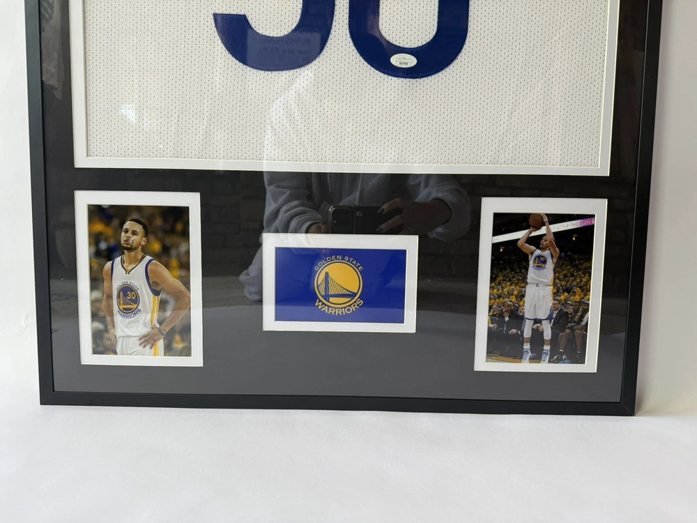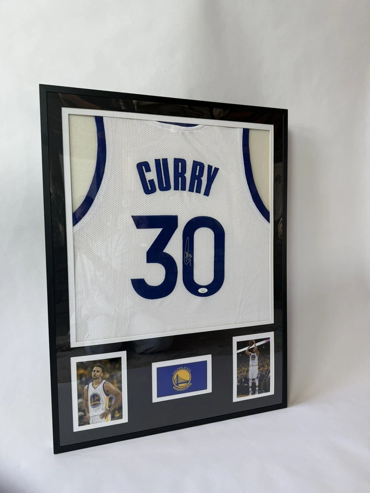 This framed autographed Golden State Warriors jersey is a must-have for any Stephen Curry fan. The jersey is an original, and has been signed by the NBA player himself. It has been authenticated by James Spence Authentication (JSA), ensuring its authenticity. The jersey is perfect for display in your home or office, and is a great addition to any sports memorabilia collection. The autograph authentication provided by JSA adds value to this product, making it a reliable and desirable item for any basketball fan. The size of the frame is 32” x 24”.