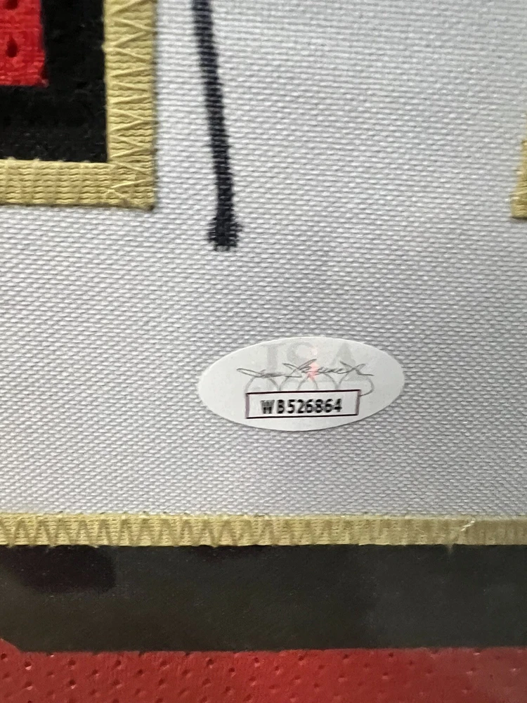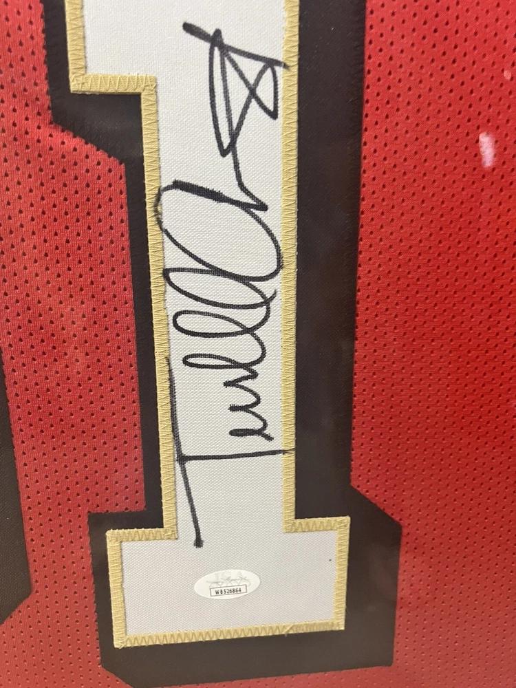 This is a beautifully framed autographed San Francisco 49ers jersey by Terrell Owens. The jersey measures 35x43 inches and comes with a certificate of authenticity from James Spence Authentication (JSA). The autograph is a true signature from the athlete himself, making it a valuable addition to any sports memorabilia collection. The jersey is an original, and the authentication is provided by JSA. This is a must-have for any football fan, especially those who love the NFL and want to add an authentic piece to their collection. The autograph authentication is mentioned in the title, making it clear to potential buyers that the autograph is genuine. * Ships lower 48 states only*