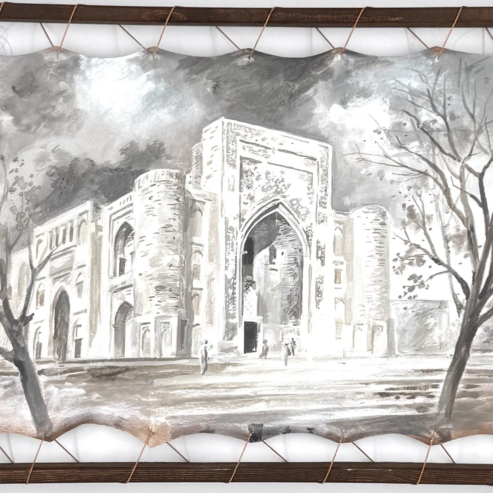 This original fine art oil painting is a framed piece created by artist B. Kobilov from Uzbekistan in 2021. The medium-sized painting features a contemporary art style with elements of Art Deco, Miniature, Realism, Illustration Art, Islamic, Graffiti Art, and Folk Art. The artwork depicts historical and monumental landmarks from the Islamic world, specifically focusing on monuments from Bukhara, Uzbekistan. Handmade with materials such as wood, special rope, leather, and acrylic, this personalized piece showcases the artist's unique production technique in oil painting.