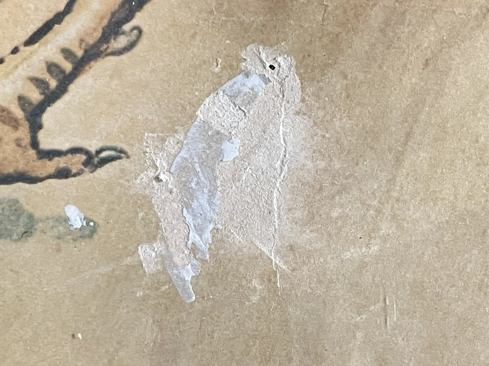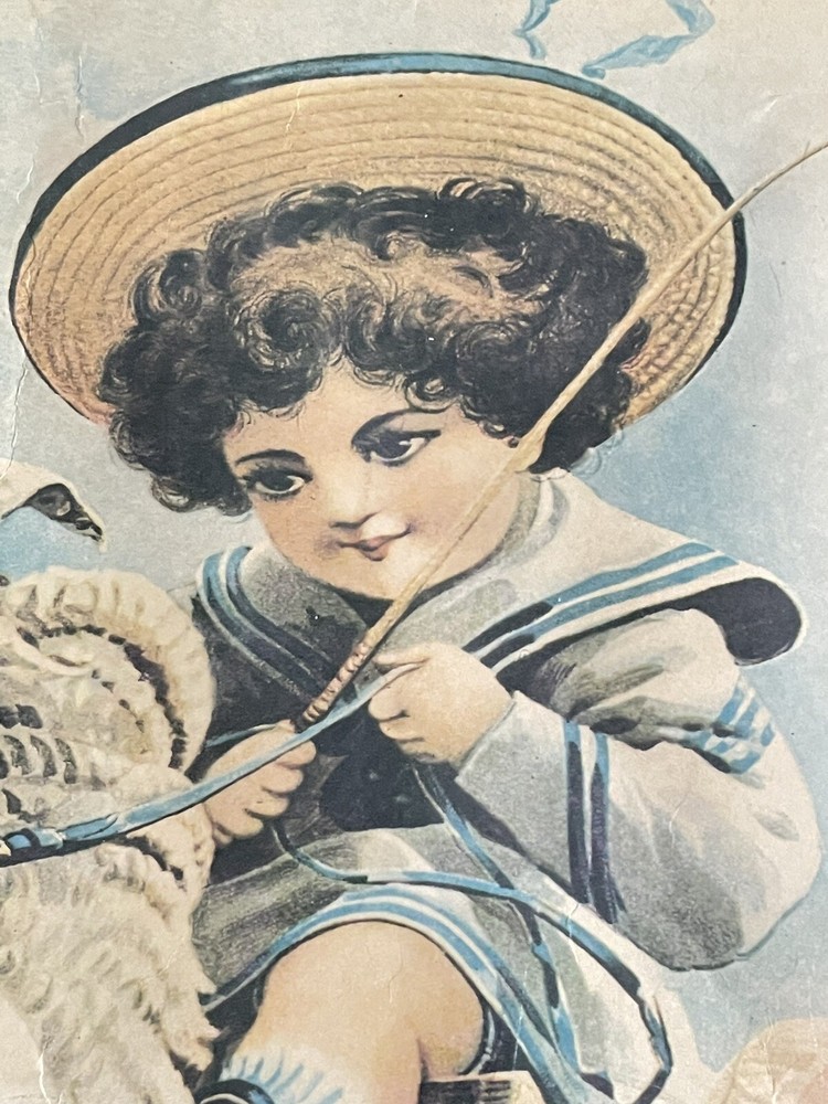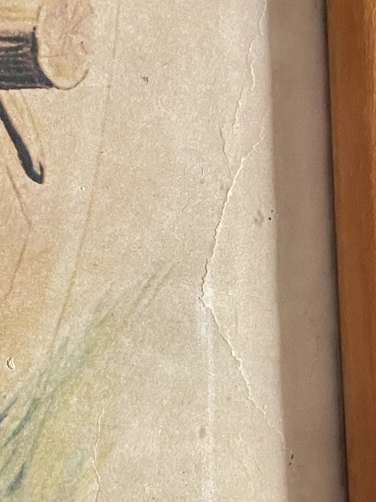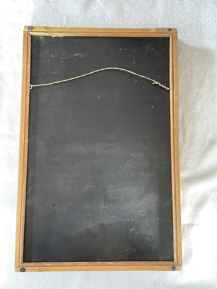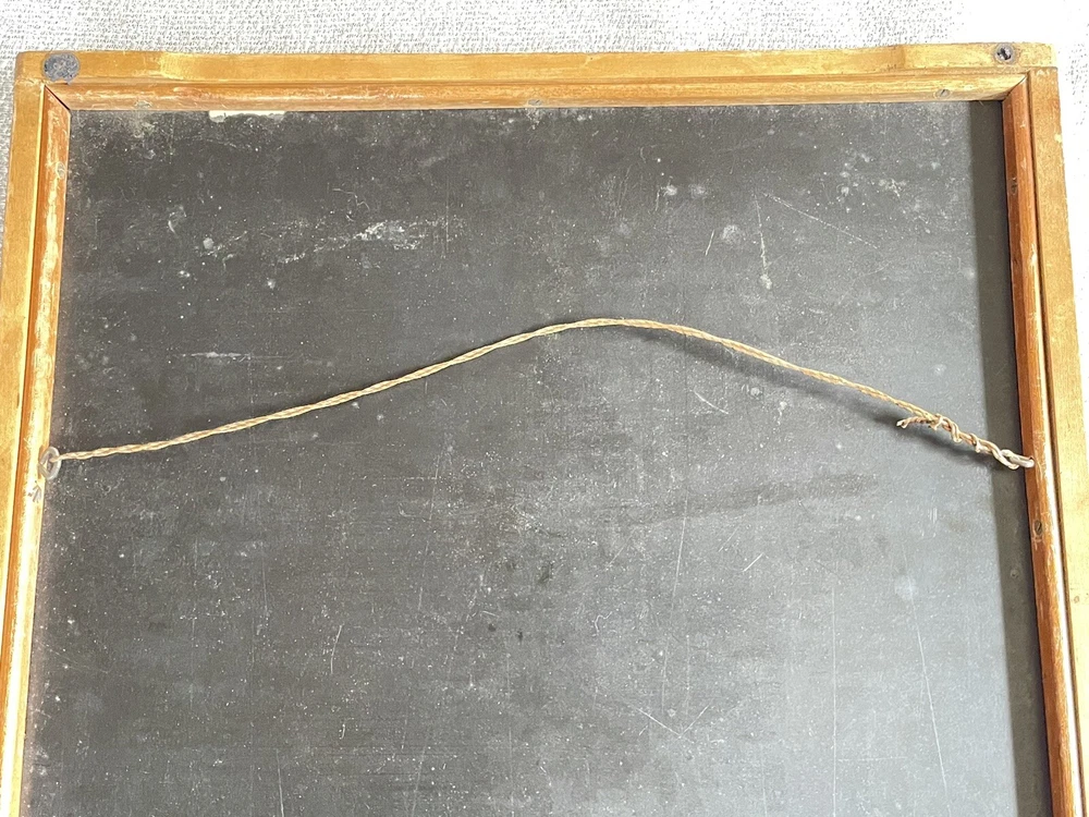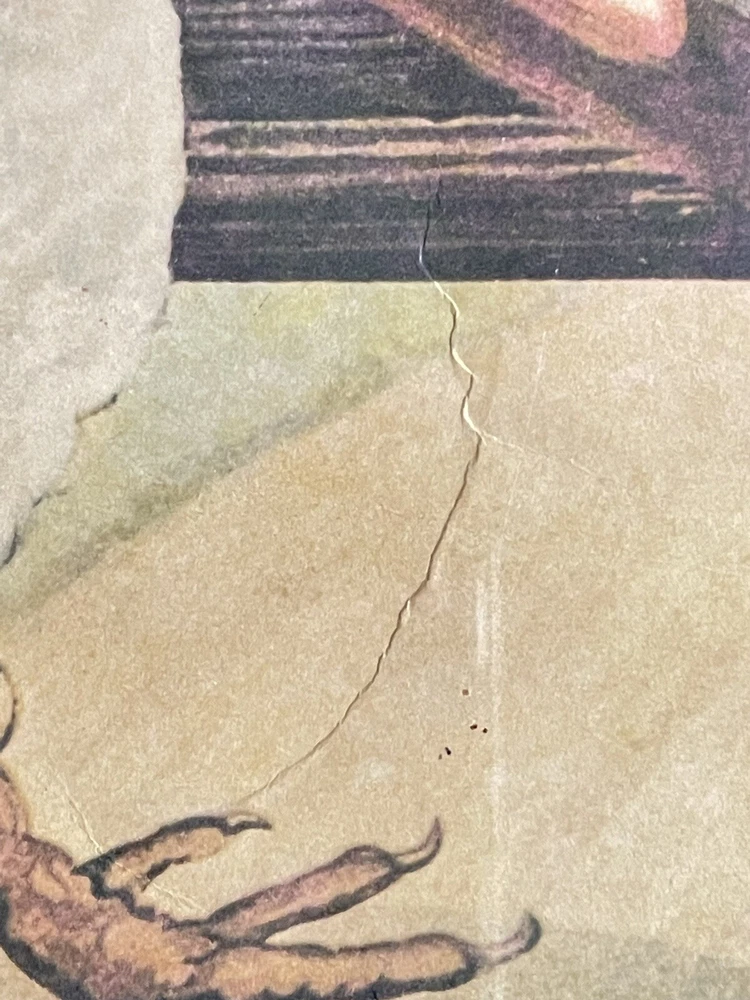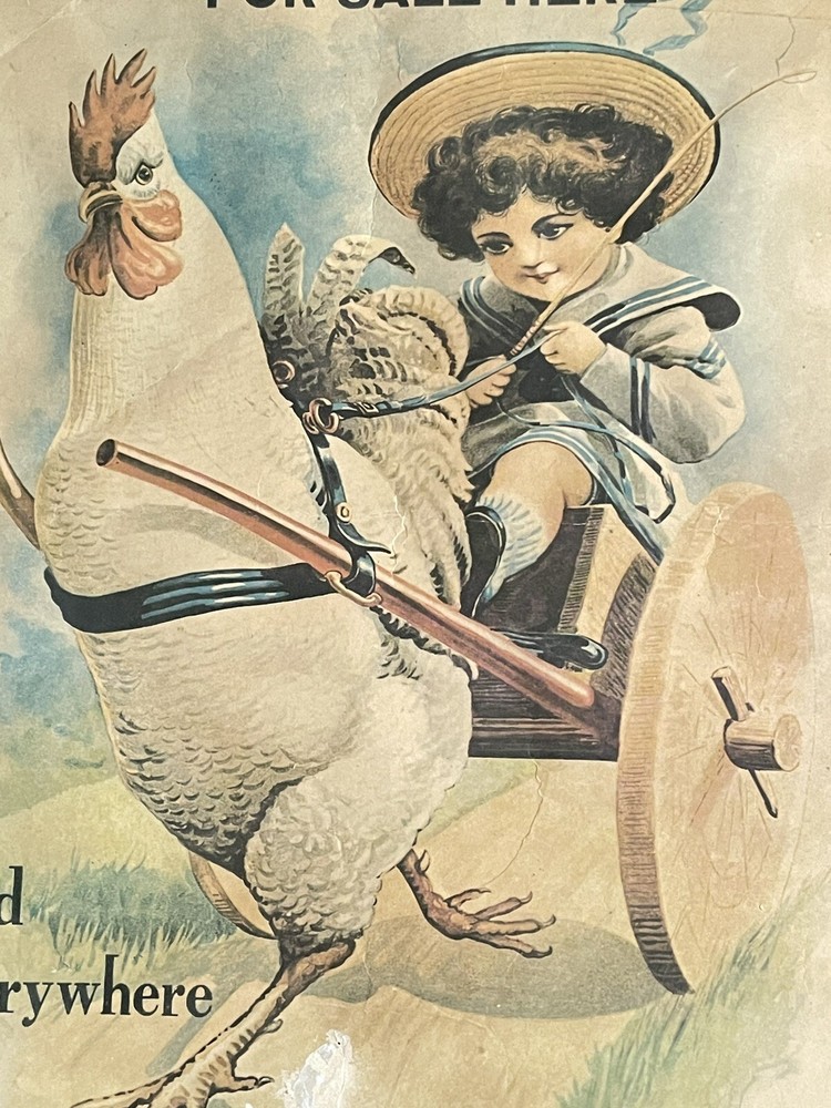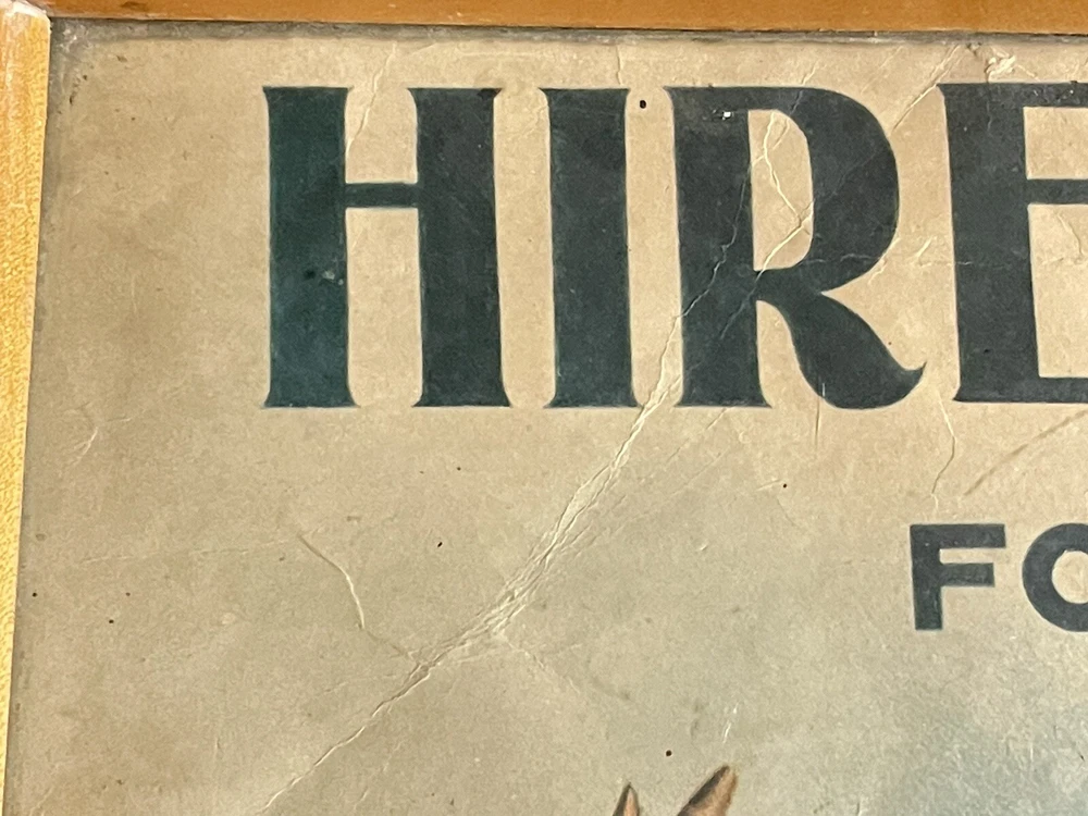 Early Hires Root Beer Paper Lithograph with vibrant detail featuring a Large Rooster pulling a wagon and toddler. The paper has good color throughout with some browning/discoloration or stains. There is a horizontal fold line with some and scattered creases and I believe a couple white paint spots. I’m not sure if this item was modified or cut down to fit the Oak wood frame but more than likely was for a correct fit. The frame is solid but is dirty with minor scratches, stains and has glued corners. Overall size is 15.5” x 23.75”