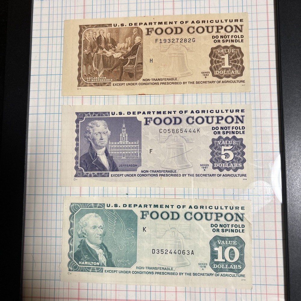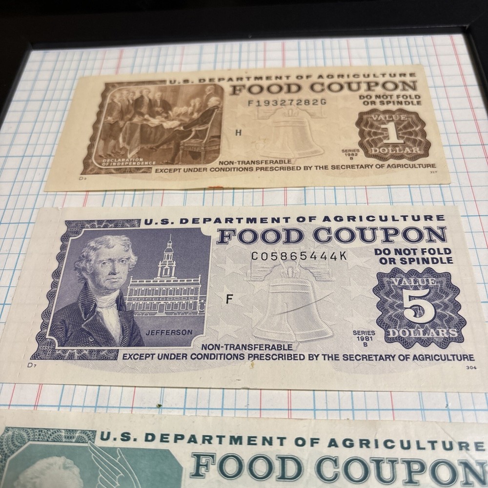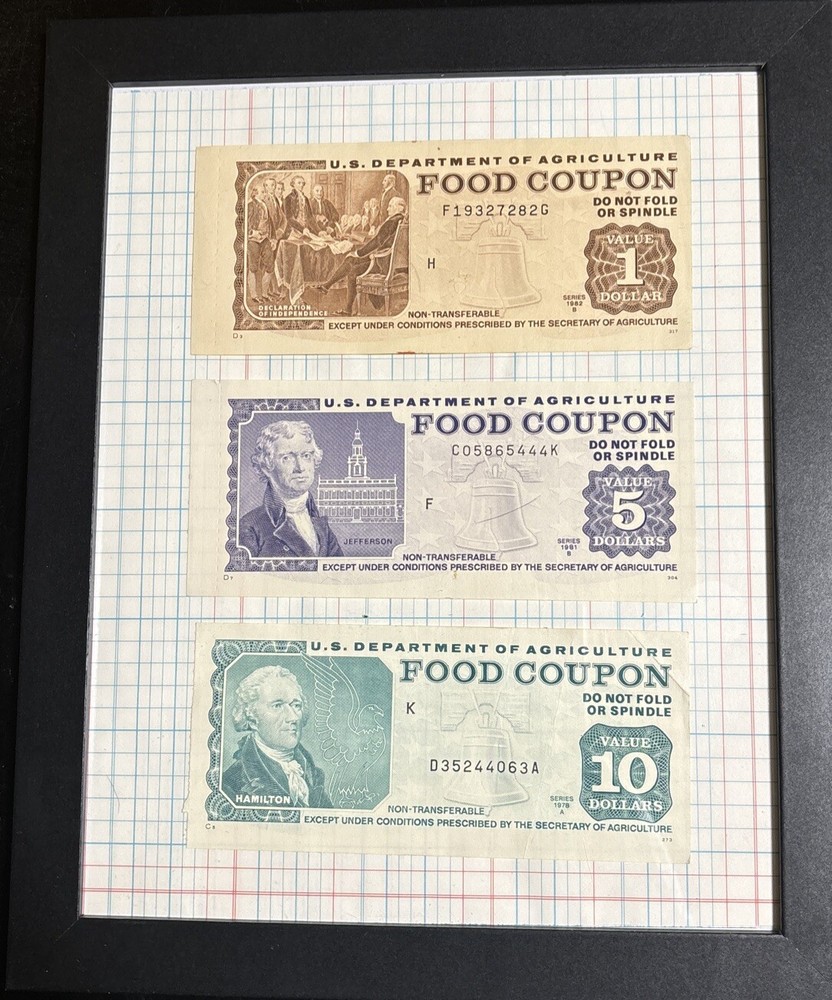 Framed 3 pack of uncirculated authentic 1970’s -1980 usda food coupons. All three food stamps are full notes, the $1 and the $5 have full perforated tabs attached on the left side of the coupons. The $10 is a complete uncirculated coupon with no “tail” present. All three coupons are unredeemed/canceled and come framed with background seen in listing photos. Makes a great gift for the collector in the family of currency and other numismatic rarities of interest. This set of 3 coupons, 1 coupon of each issued denomination from the “bicentennial” usda food coupon era is a nostalgic reminder of where it all began for some, and a reminder of how far some of us have come over the years. Memories from simpler times come to mind for some, running to the corner store when the monthly booklet was issued for candy or groceries. These now rare and collectible paper food coupons were intended as a single use currency to help low income families, often living in rural communities throughout the United States obtain the food they needed for the month. Once spent the grocery stores would redeem coupons and the coupons were then sent back to be recorded and destroyed. Because of this single use system and grocery stores relying on the money from redeeming the coupons, few survived over the years. The last year to redeem paper food coupons was in 2009. Snap benefits replaced the original system, retiring the booklets and paper coupons. Until this switch it was illegal to buy and sell coupons or possess coupons not issued by the USDA.